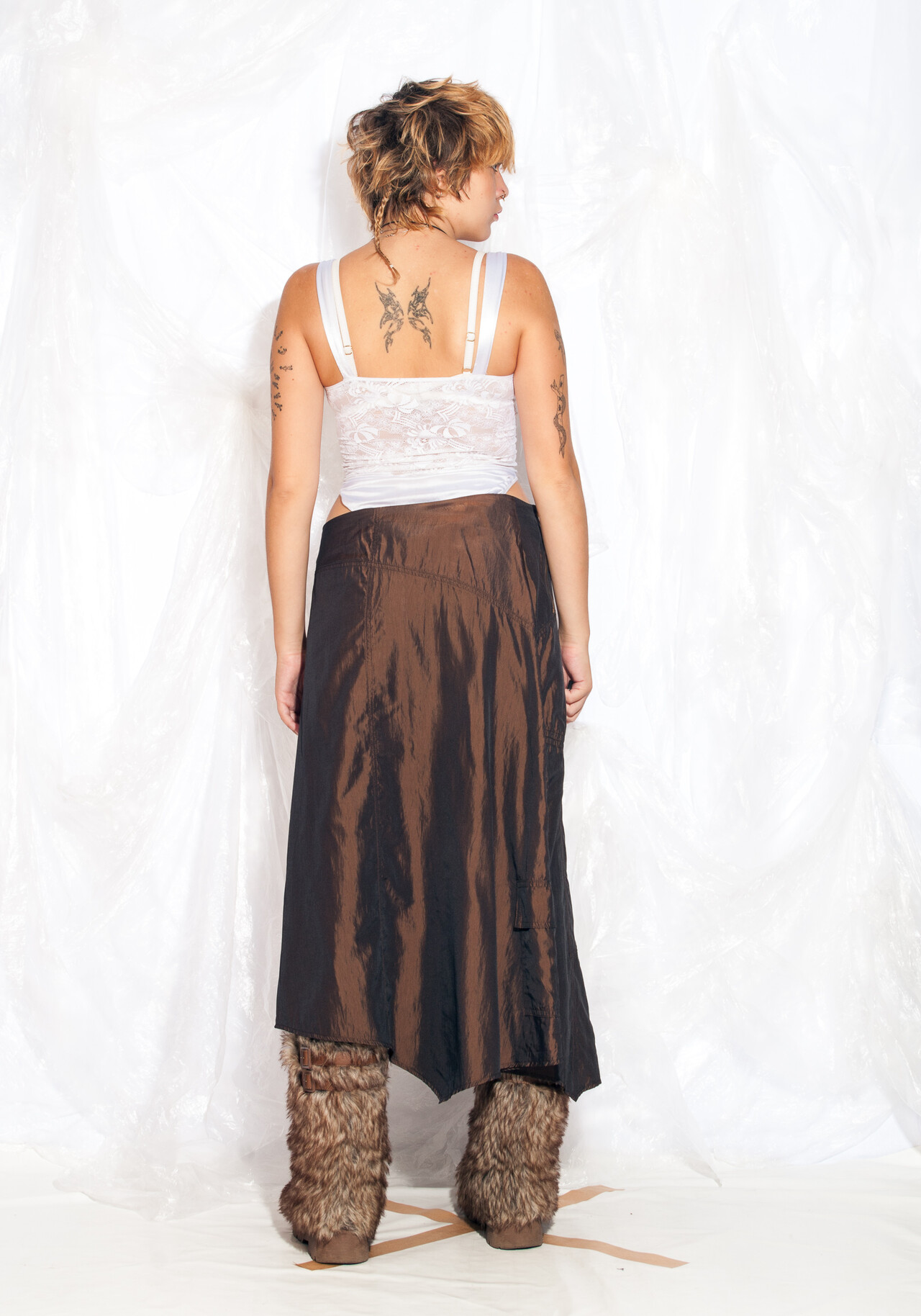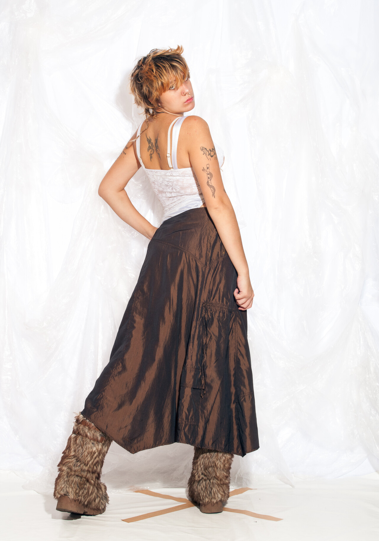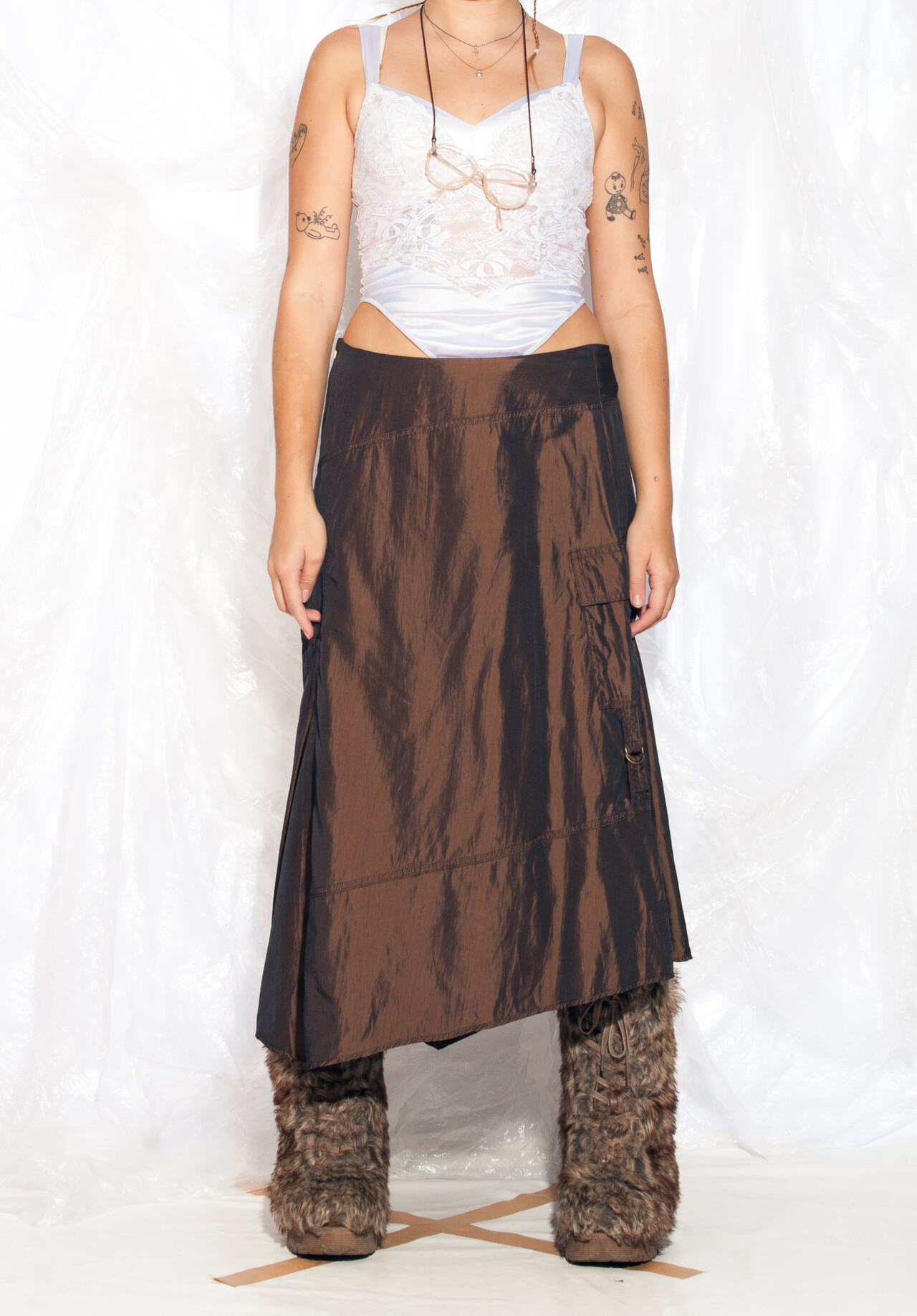 Introducing this Y2K vintage skirt from Green House. With its cargo style and iridescent brown colour, it’s a fashion journey back to the early 2000s.
