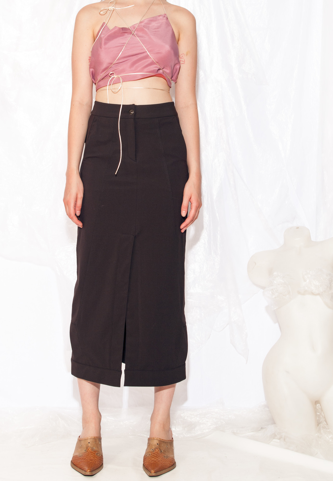 Y2K vintage maxi skirt from Marithe et Francois Girbaud. It’s like stepping into a time machine but without the wonky time-space continuum. With its brown colour, four pockets (perfect for storing snacks or secret notes), and a zip closure, this maxi skirt is the definition of rad fashion. Made in Portugal. Recommended size: EU 34-36.