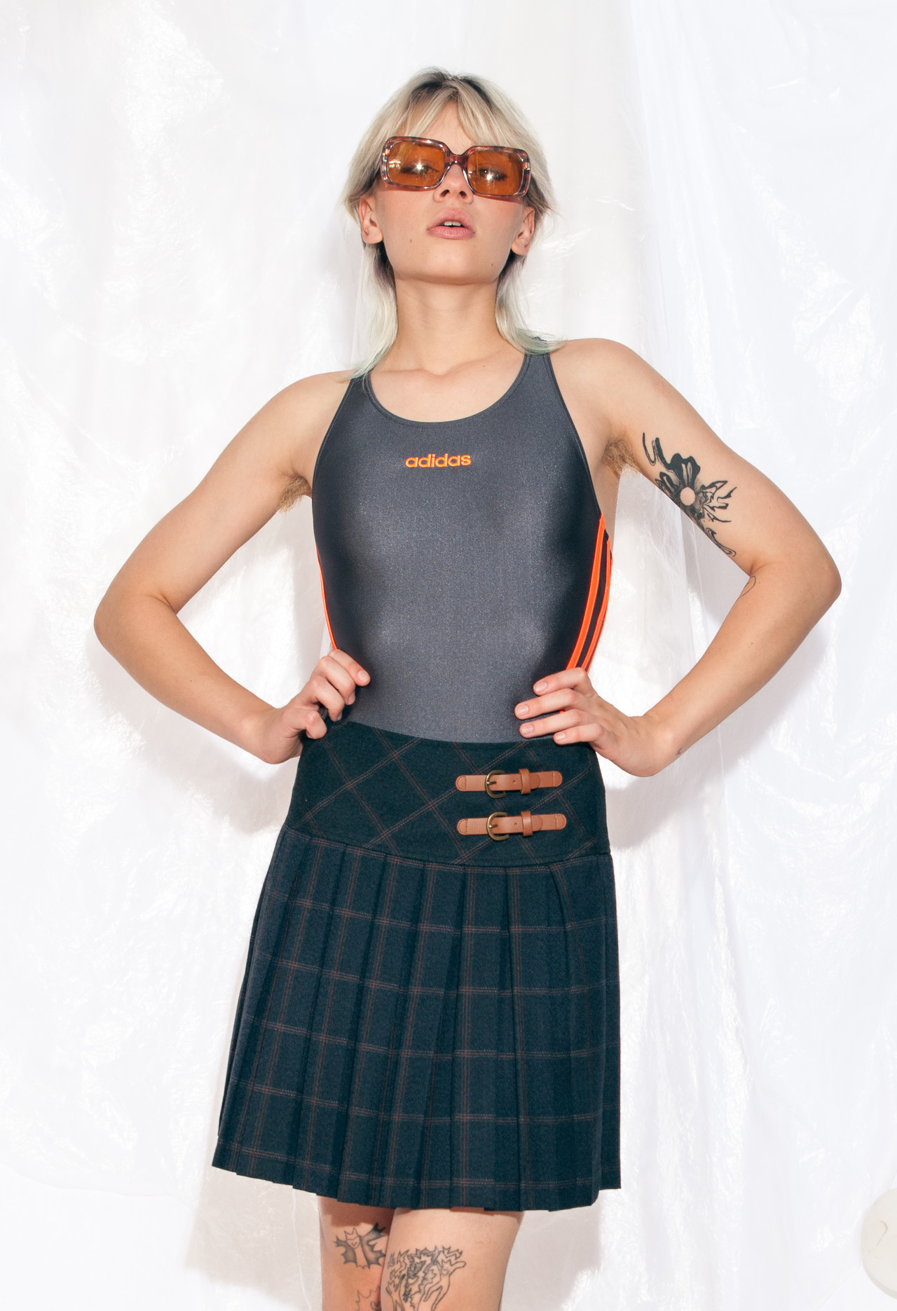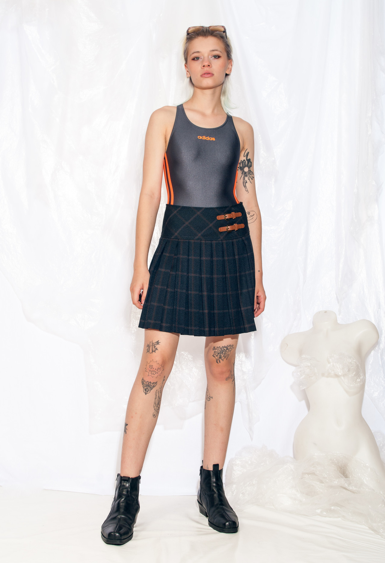 Y2K vintage schoolgirl skirt. Pleated and kilt-like in design, it’s got more personality than your local dealer. In a grey hue with a checked pattern, this skirt screams mid-2000s era. Comes with a zip closure and a lining.
