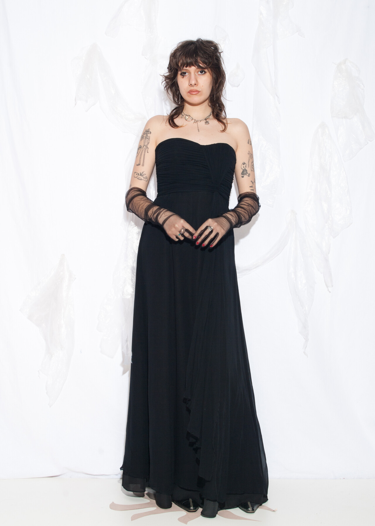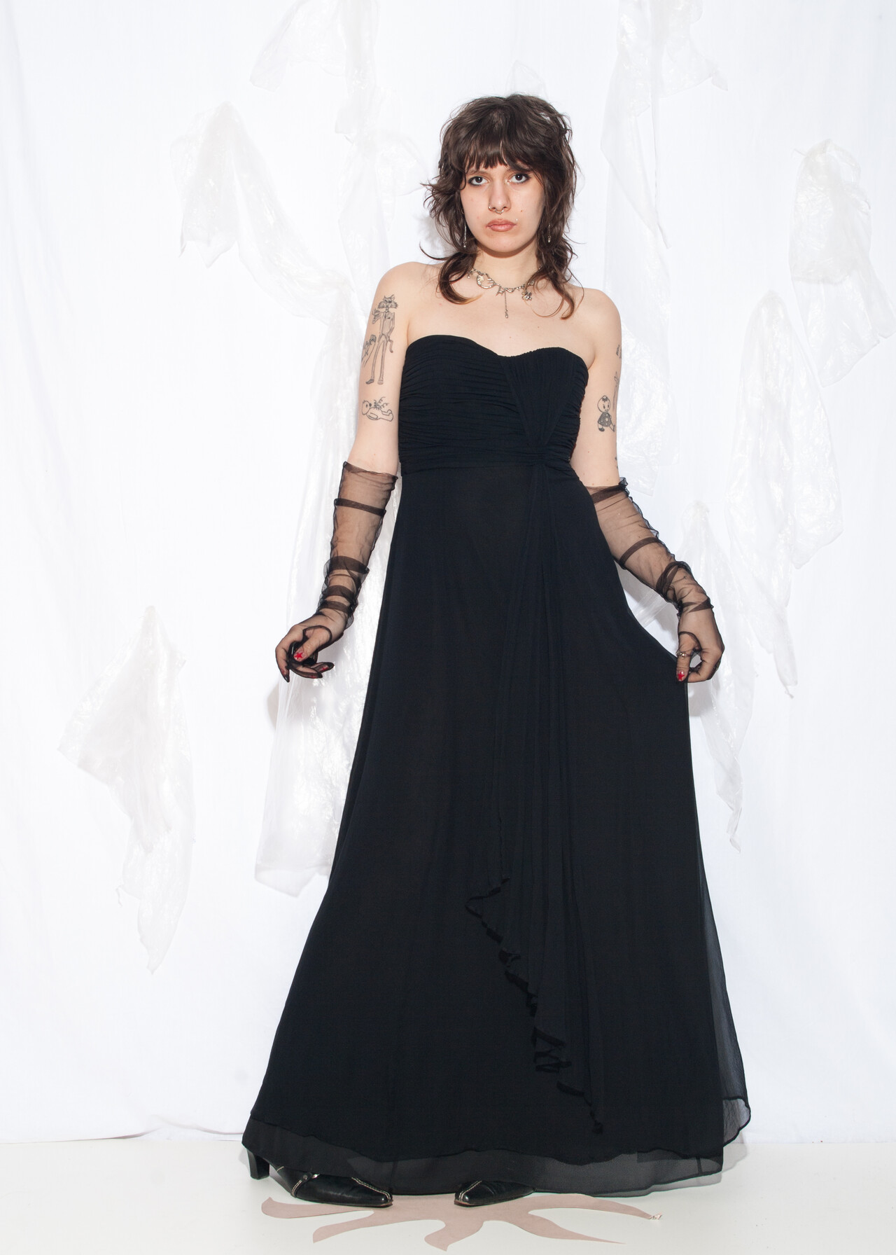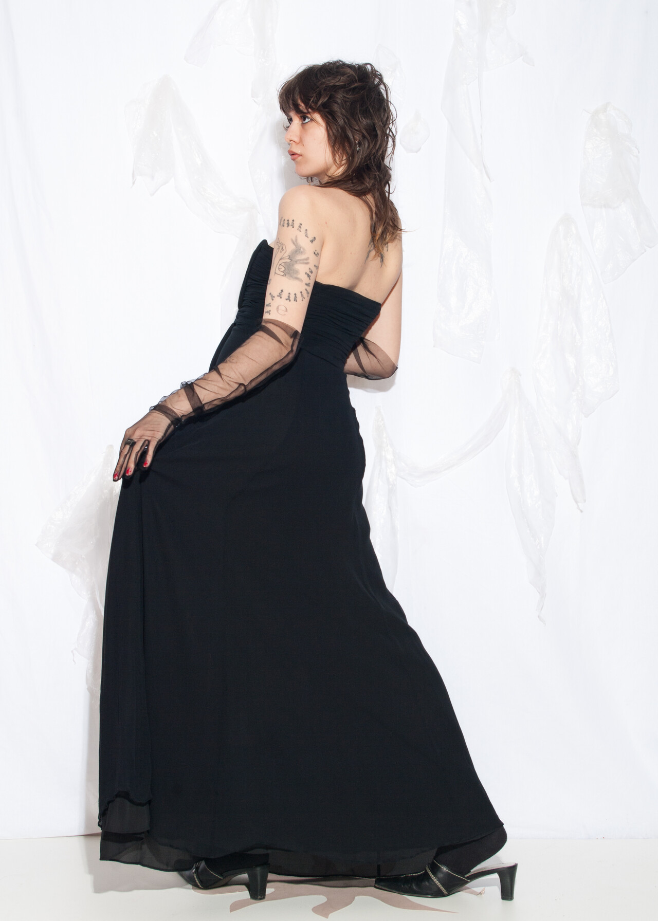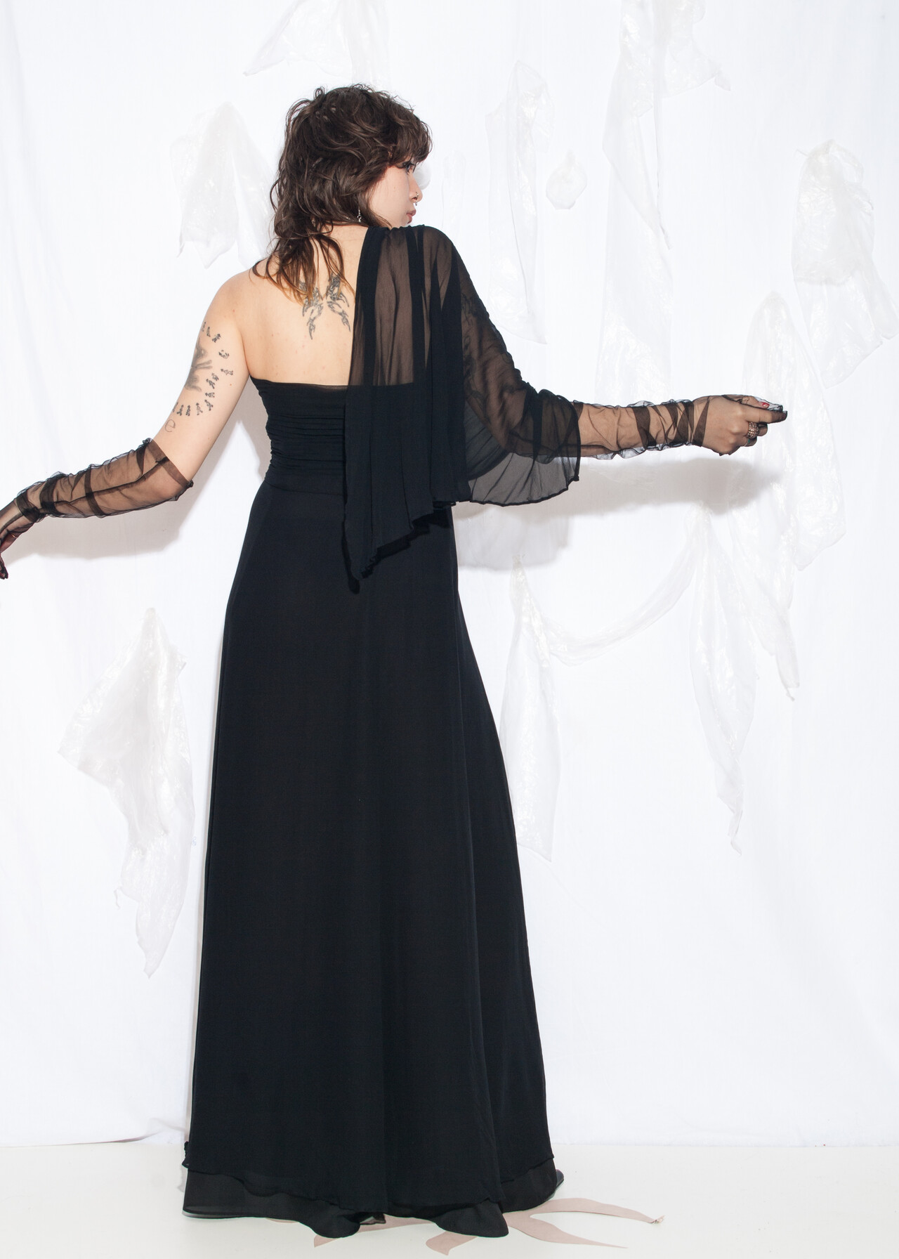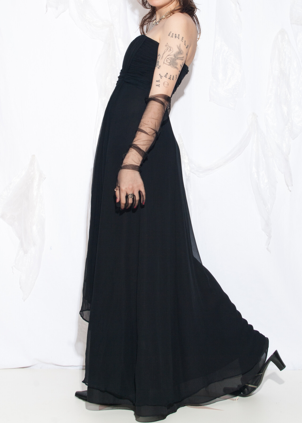 This Y2K vintage evening dress is the silky black maxi that makes you feel like you’re at a prom where the only drama is the questionable hair gel choices.