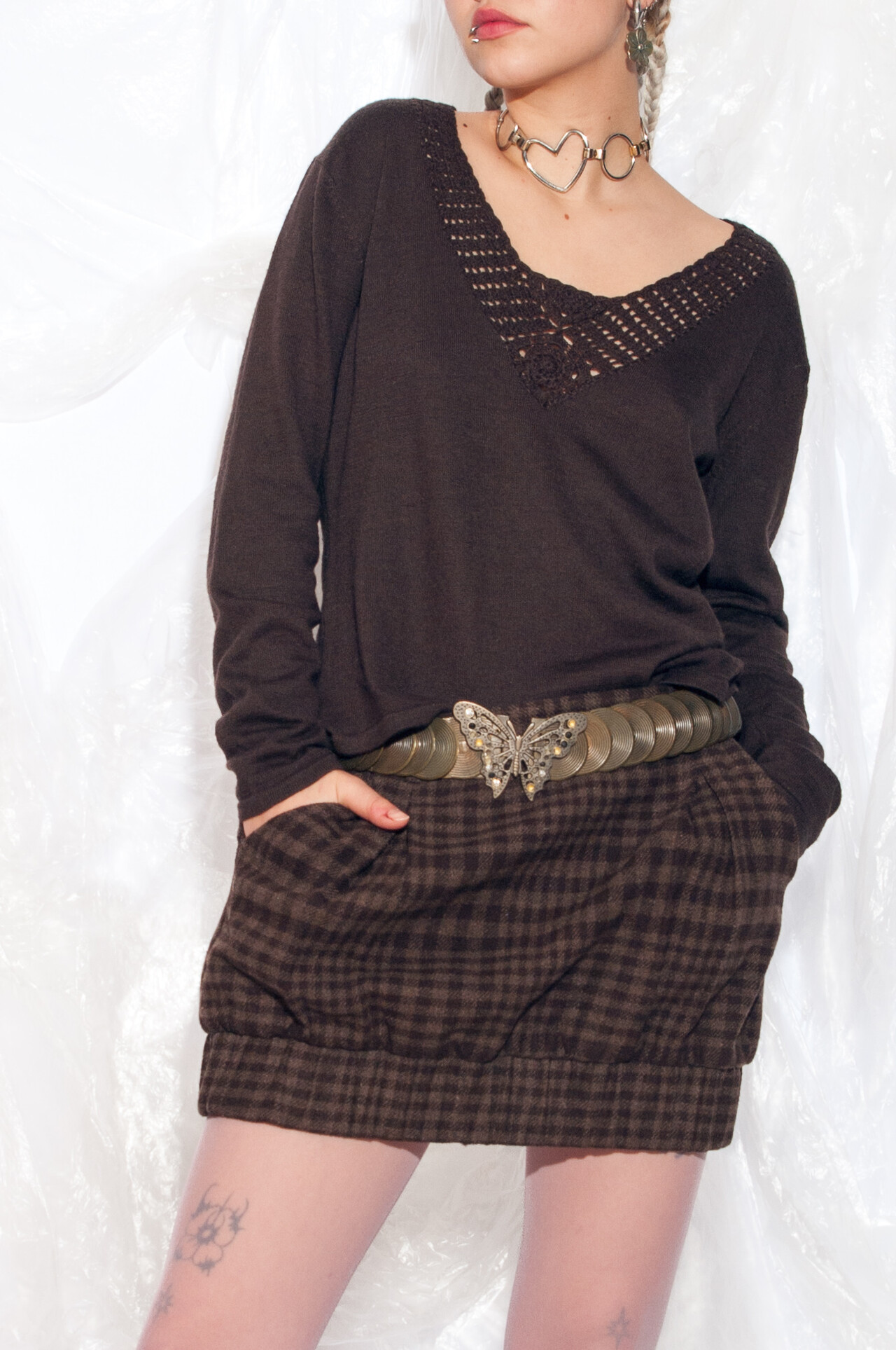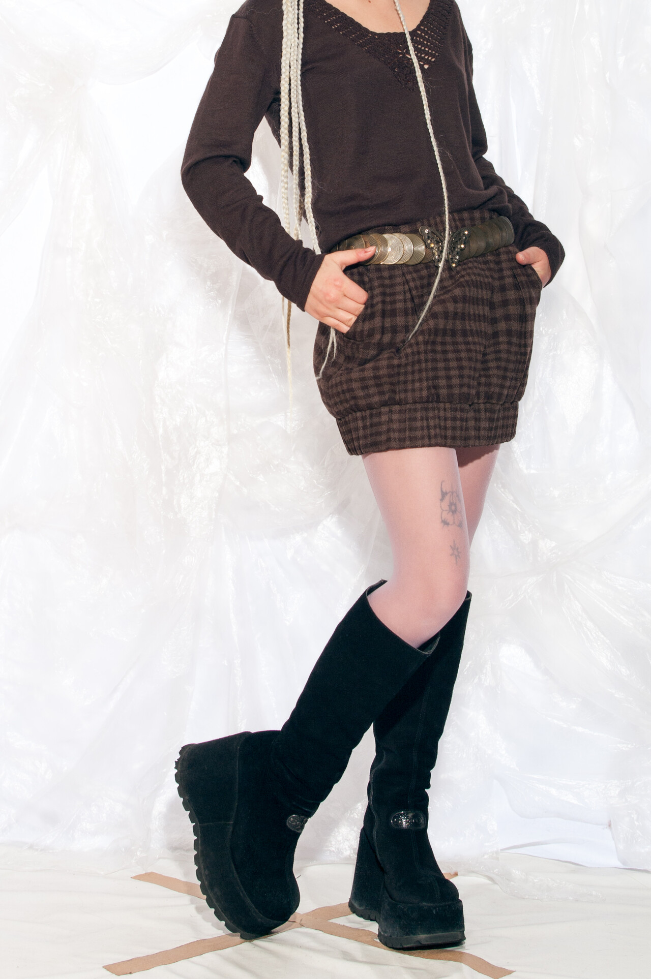 Introducing this Y2K vintage balloon skirt from Sisley. Step into the era of funky fashion and mini styles with this quirky brown beauty.