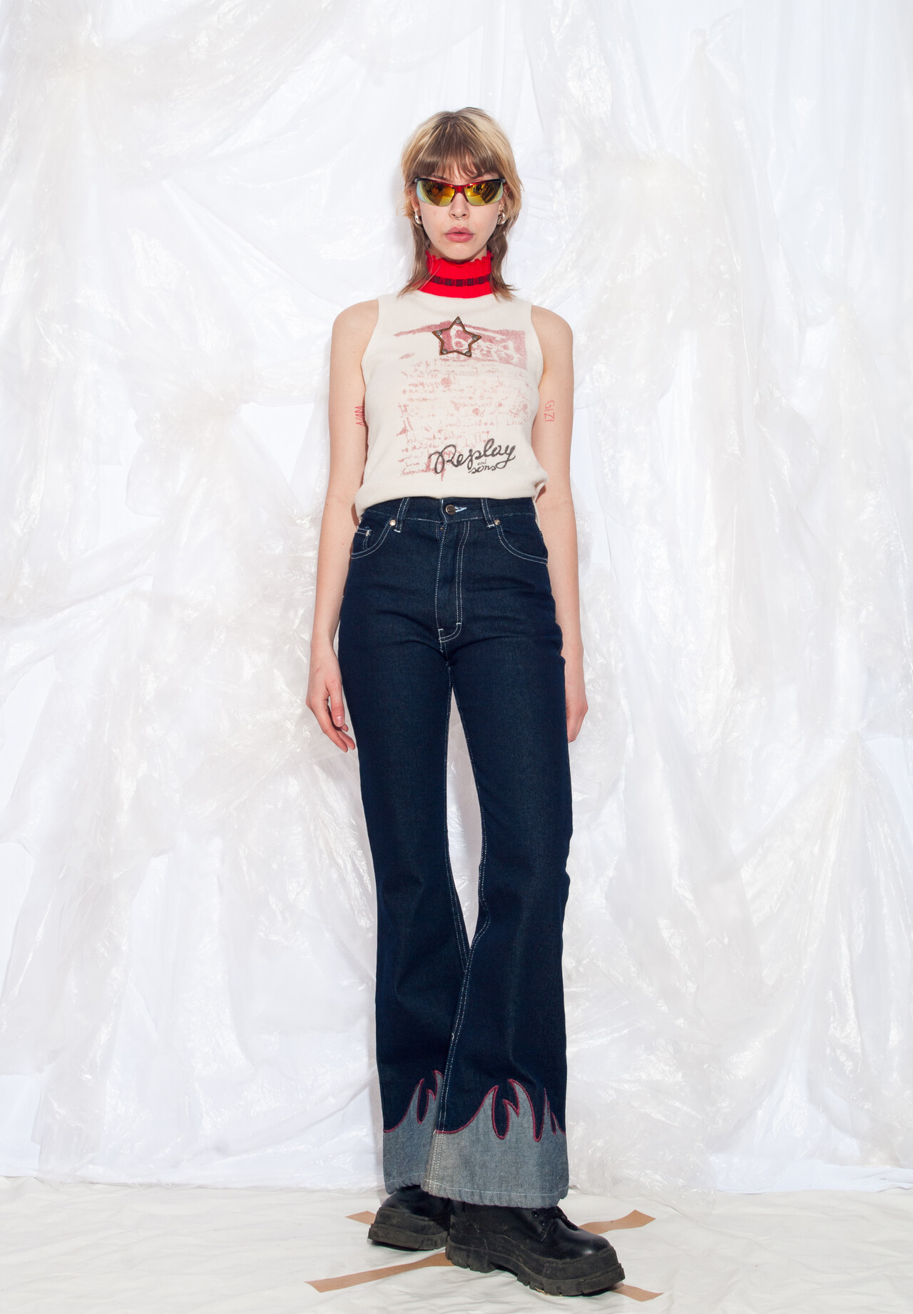 Vintage flare jeans by UFO – it’s high-waisted, flame-patterned, and ready to take your outfit back to the early 2000s.