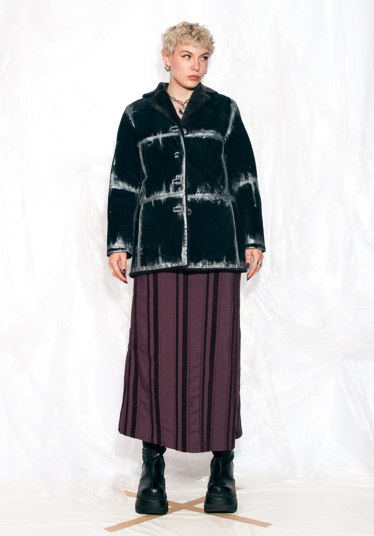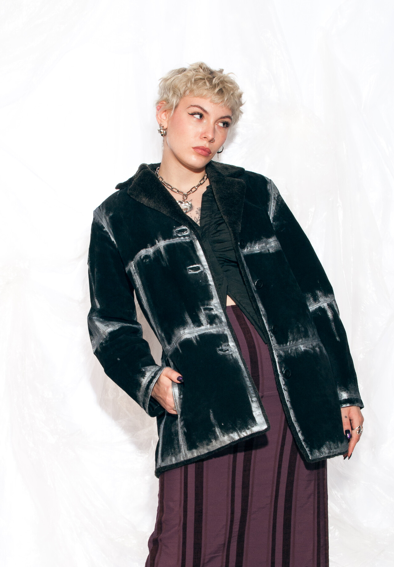 This hand-painted Y2K vintage real leather coat is the bomb(dot)com. With its faux fur collar and reworked style, it’s a nod to the past with a twist.