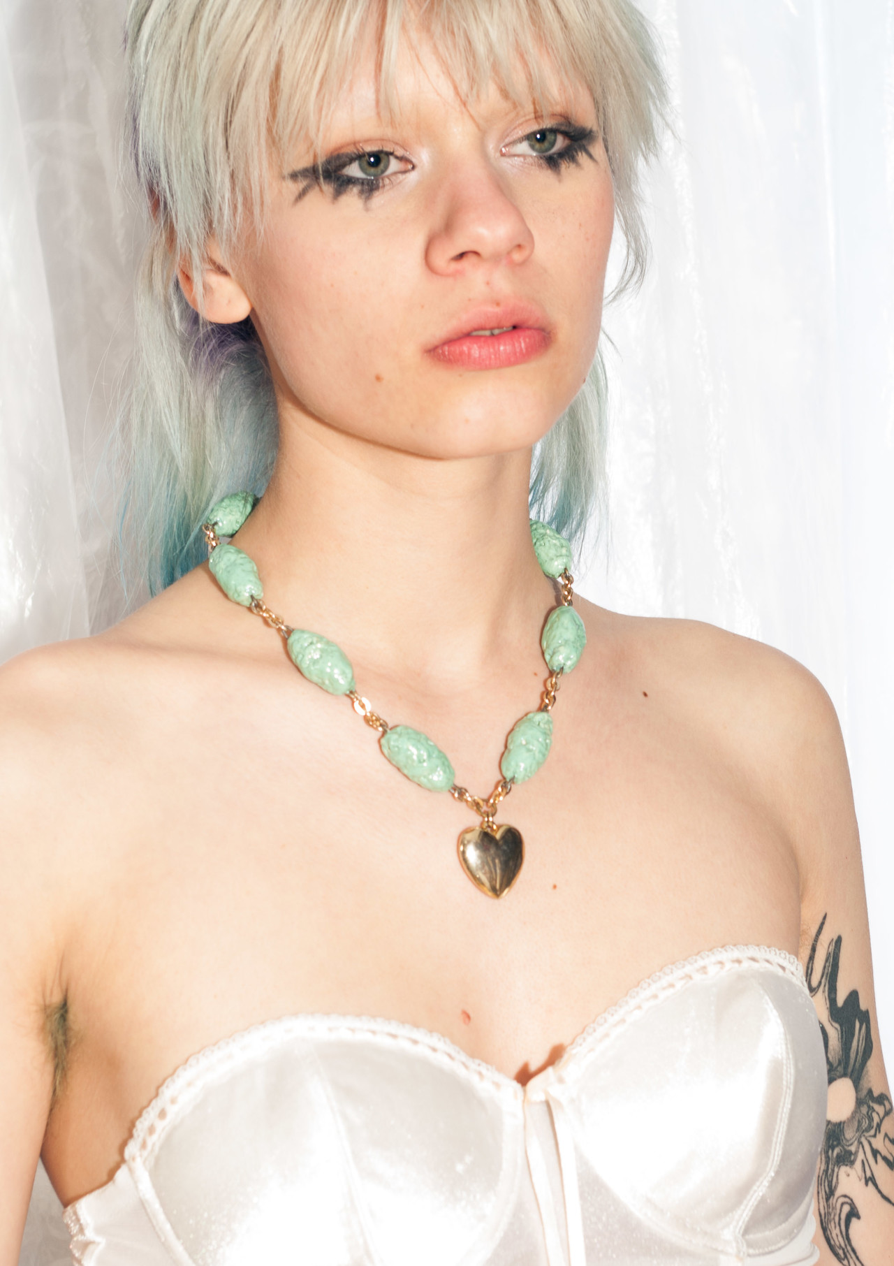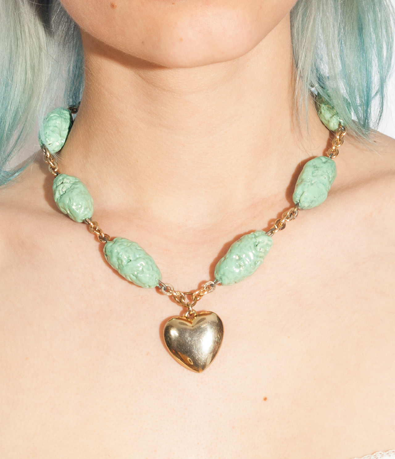The cutest candy necklace that I made from 80s vintage beads (which reminds me of turquoise bubblegum) and a Y2K golden heart pendant. It comes with a lobster clasp.