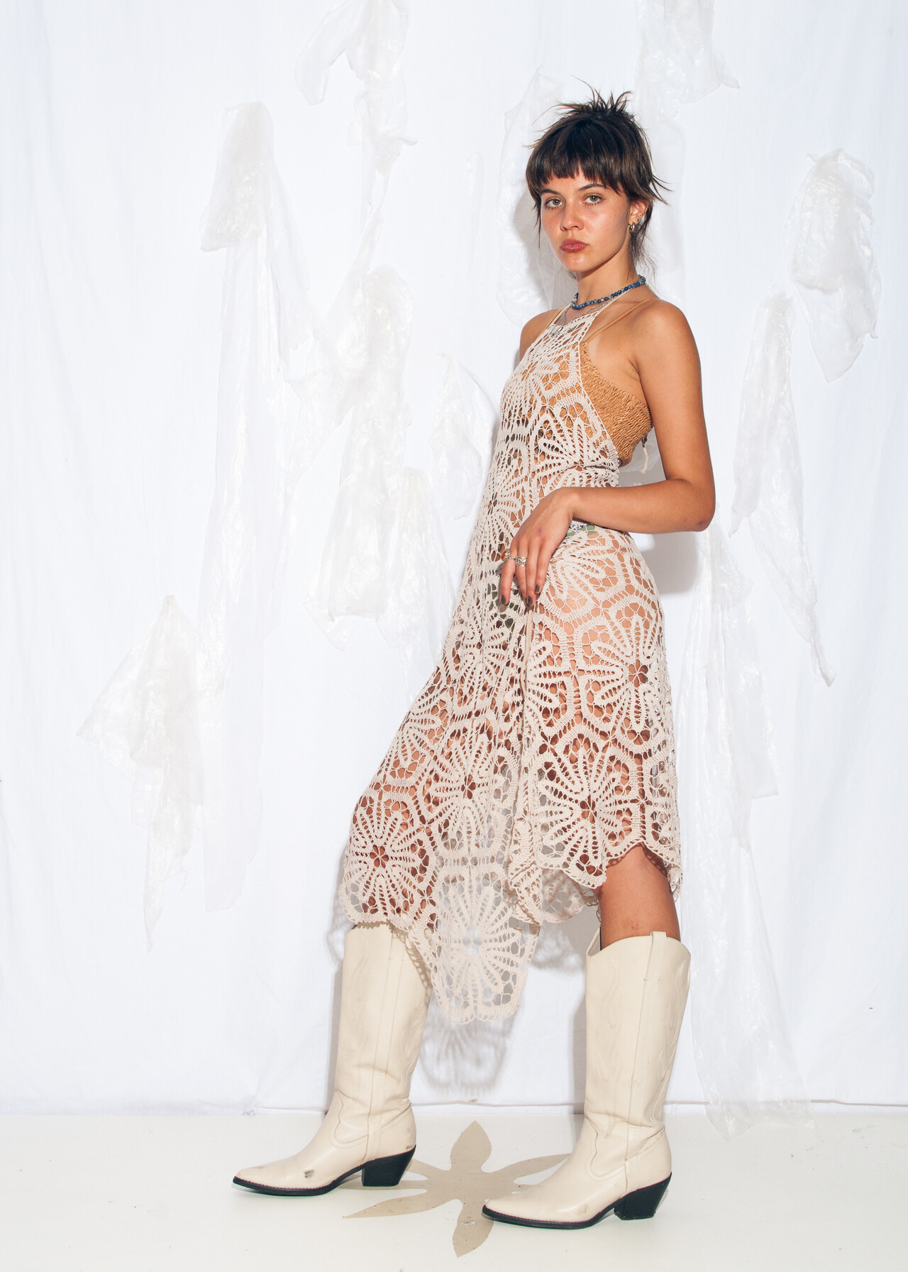 70s vintage crochet dress – a reworked lace tablecloth masterpiece that’s your ticket to Euro summer vibes.