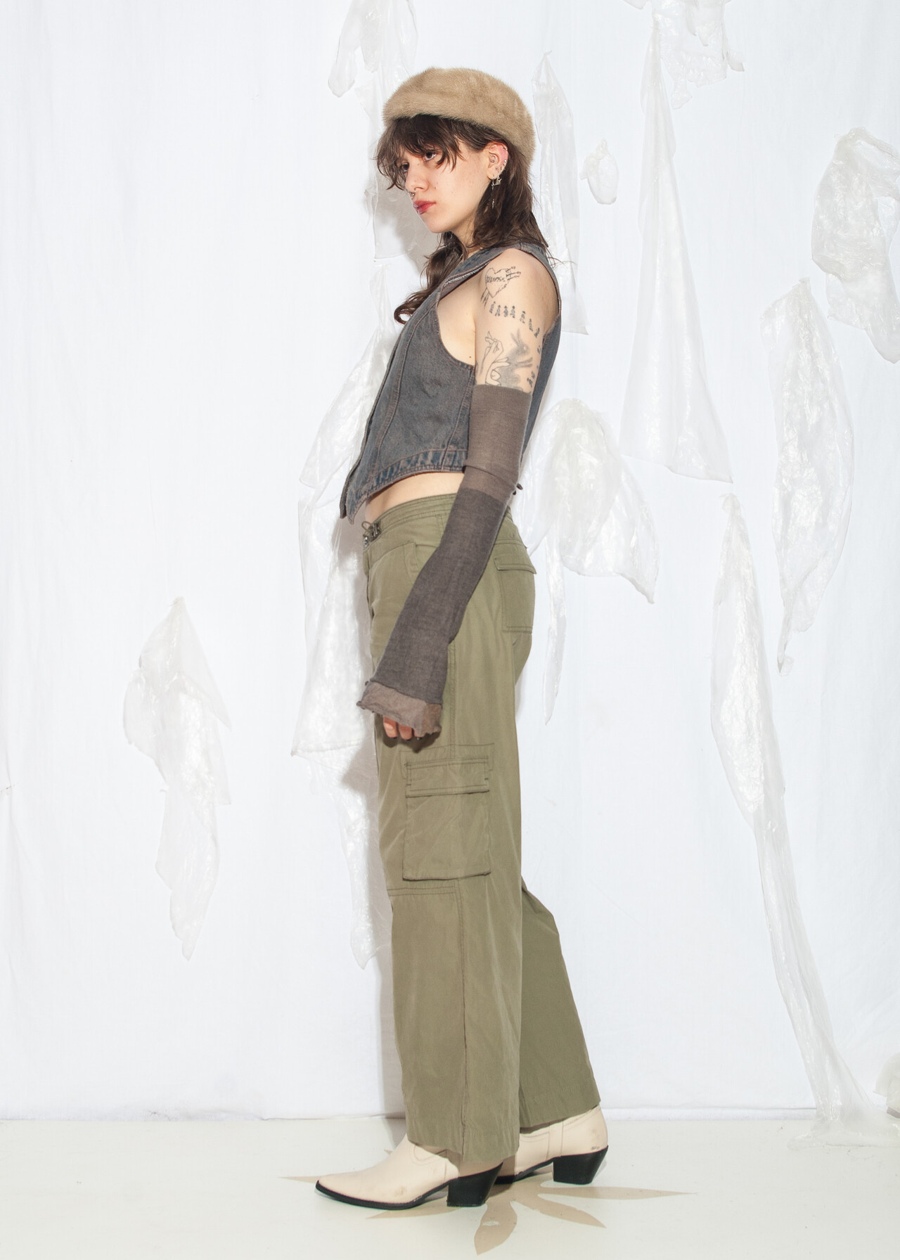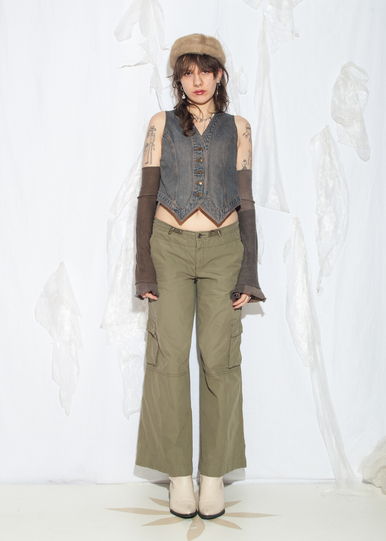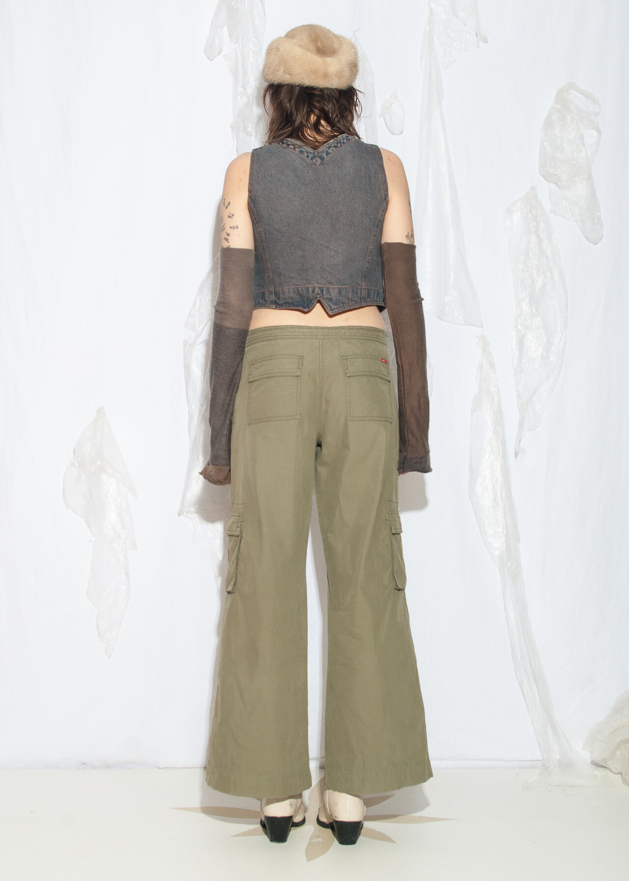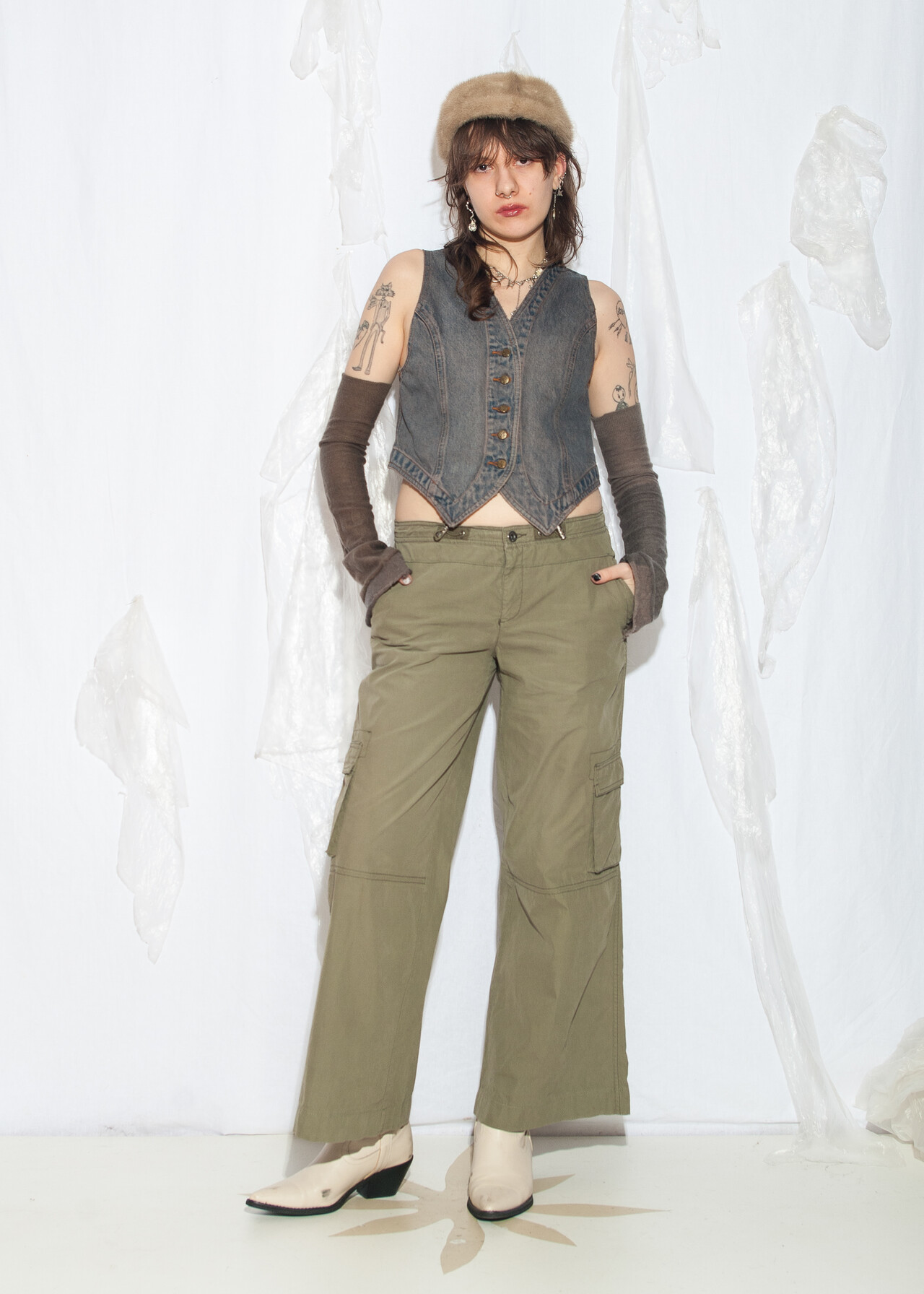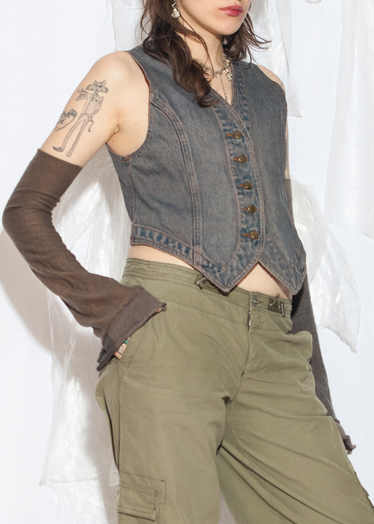This vintage vest is a reworked denim dream, perfect for nailing that recycled grunge outfit vibe. With its overdyed shades of mud wash blue, it’s like wearing a piece of 80s history!