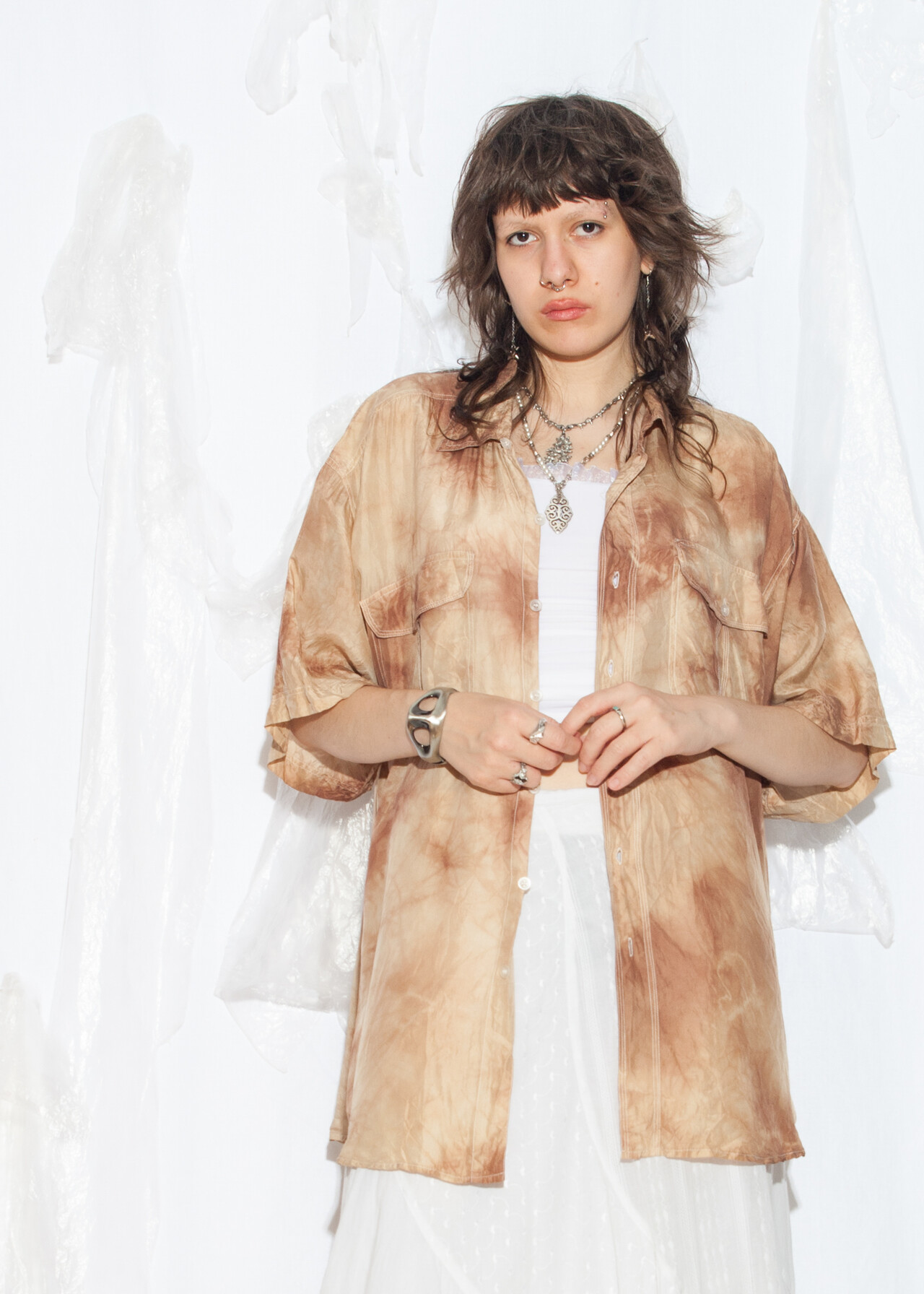 Tags: 80s vintage fashion, 90s grunge outfit, gender neutral, grandpacore, oversized shirt, pure silk blouse, reworked, tie dye top, y2k style clothing