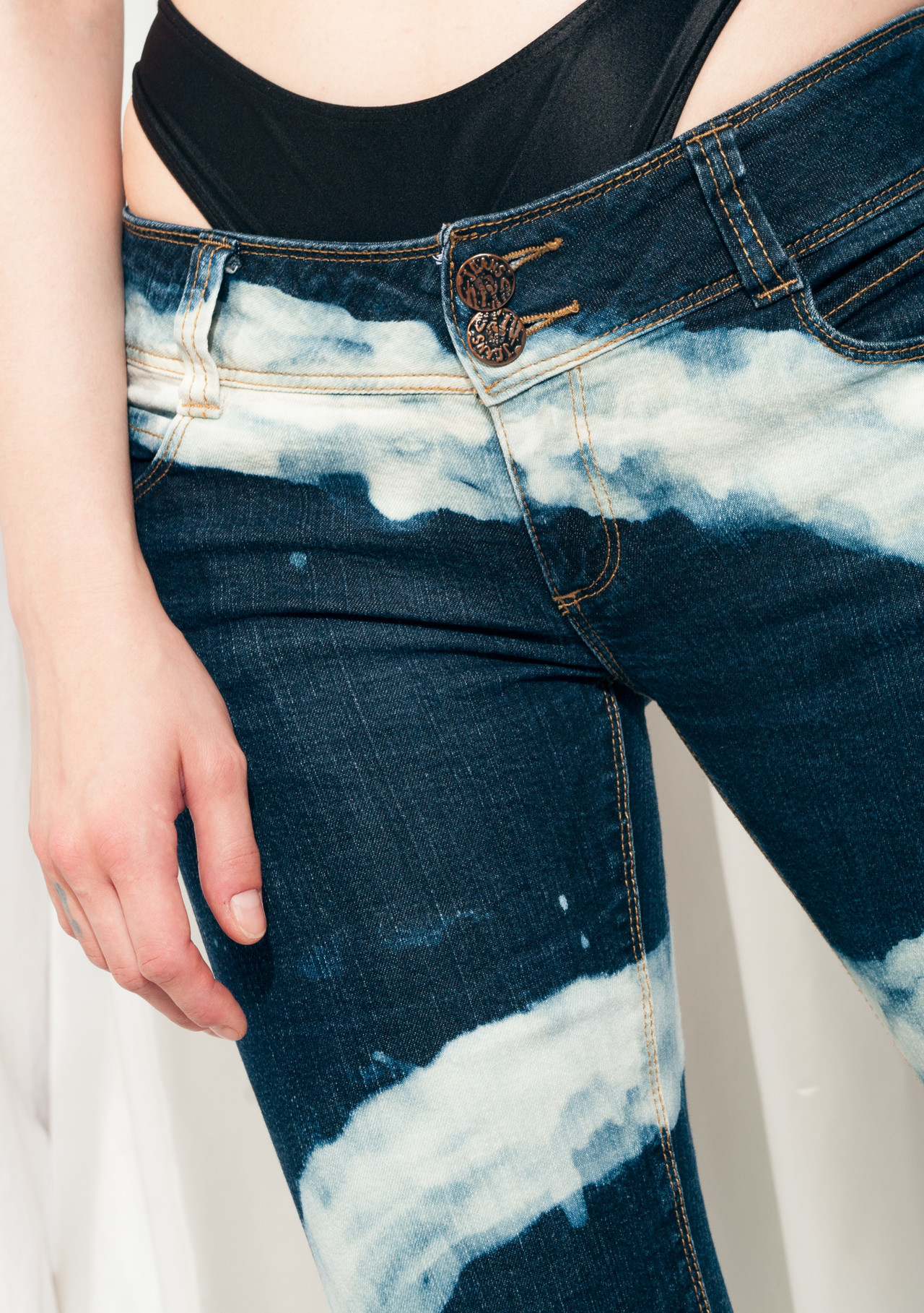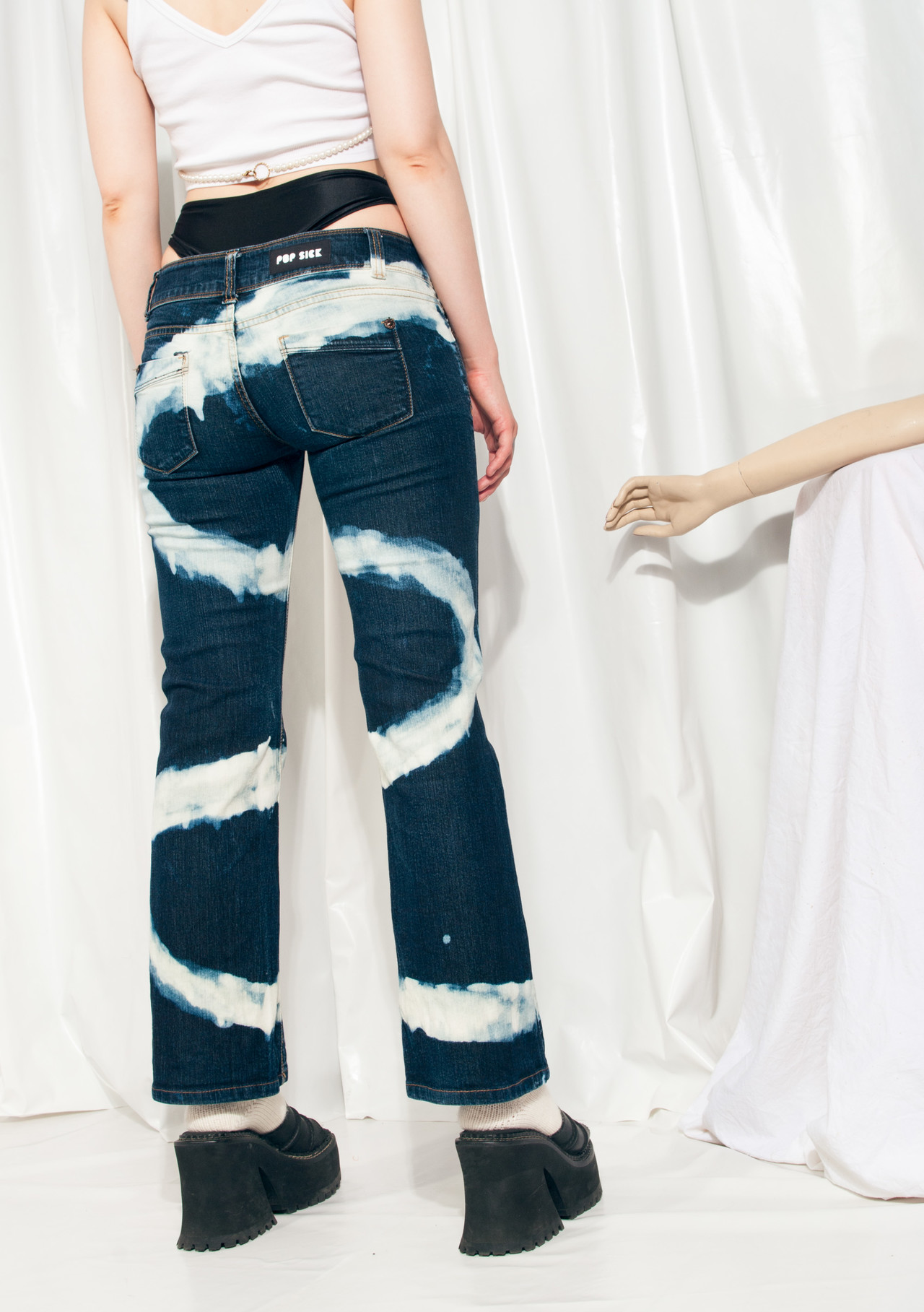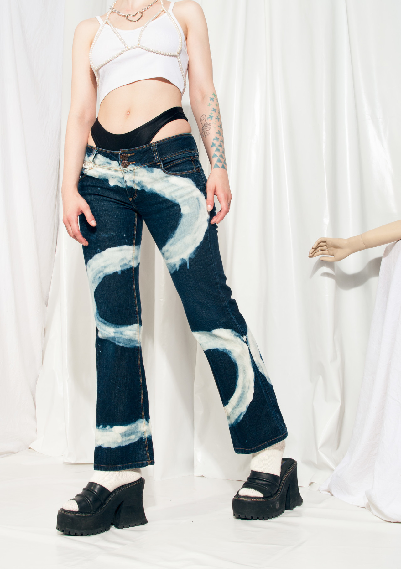 Reworked vintage flare jeans that arrived from the 2000s in brand new condition. We bleach-painted them for this one-off look. It’s made of dark washed denim and comes with 6 pockets and zip & button closure. This vintage gem will make you look bitching’ wherever you go.