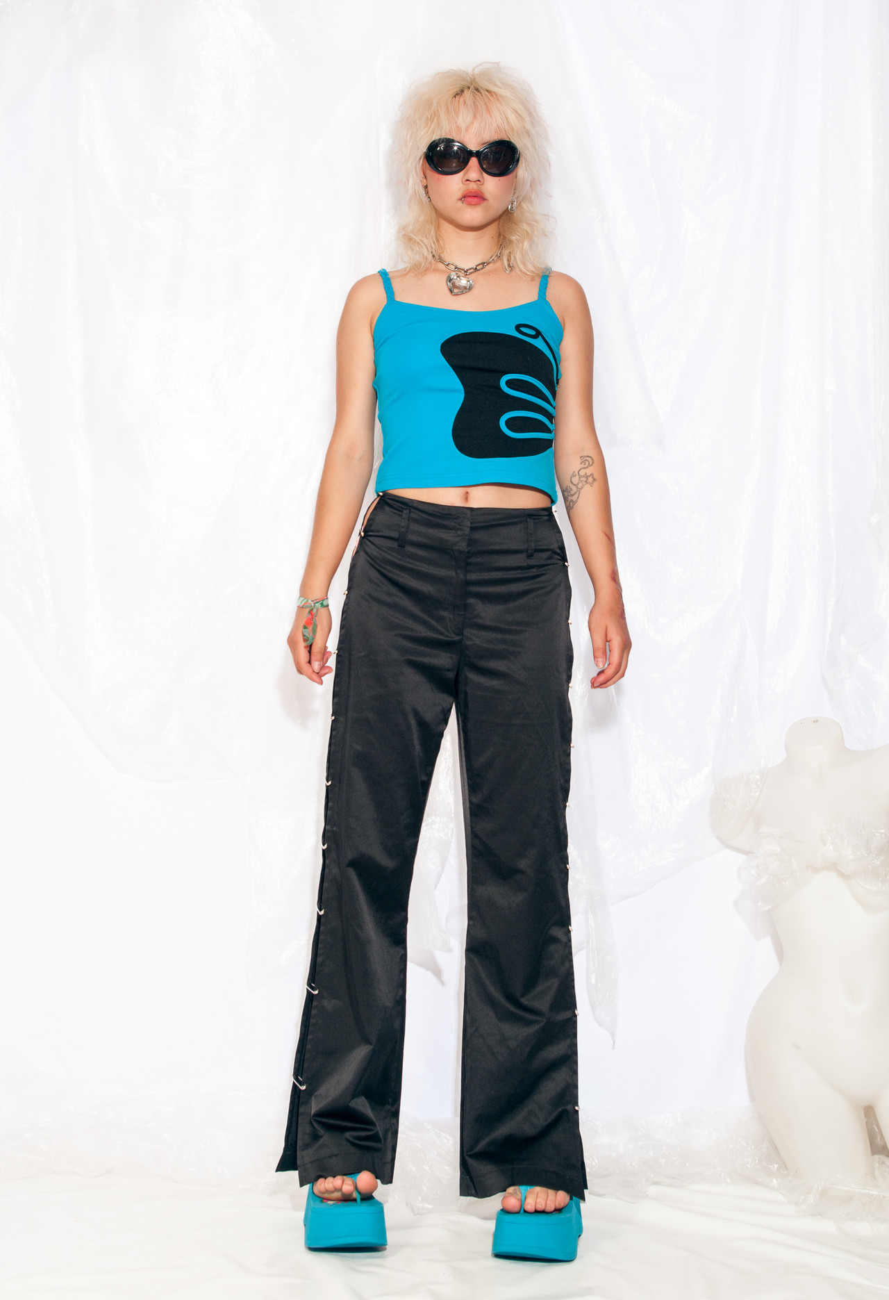 Reworked Y2K vintage trousers with safety pins added by us. These black satin beauties are so rad, even Doctor Who would ditch his TARDIS for a spin in them. The fabric is soft and natural on the inside. Zip closure, high-waisted style.