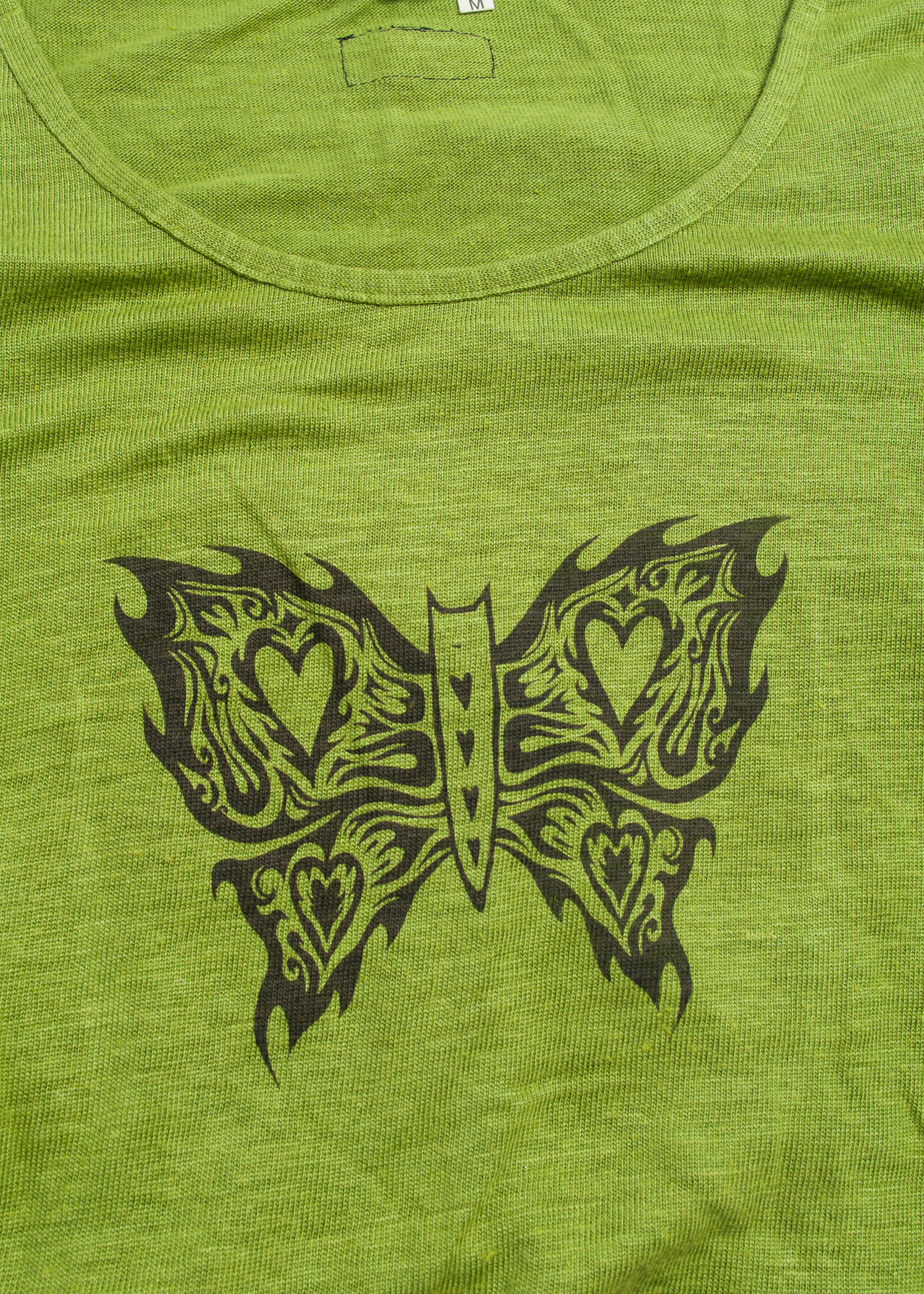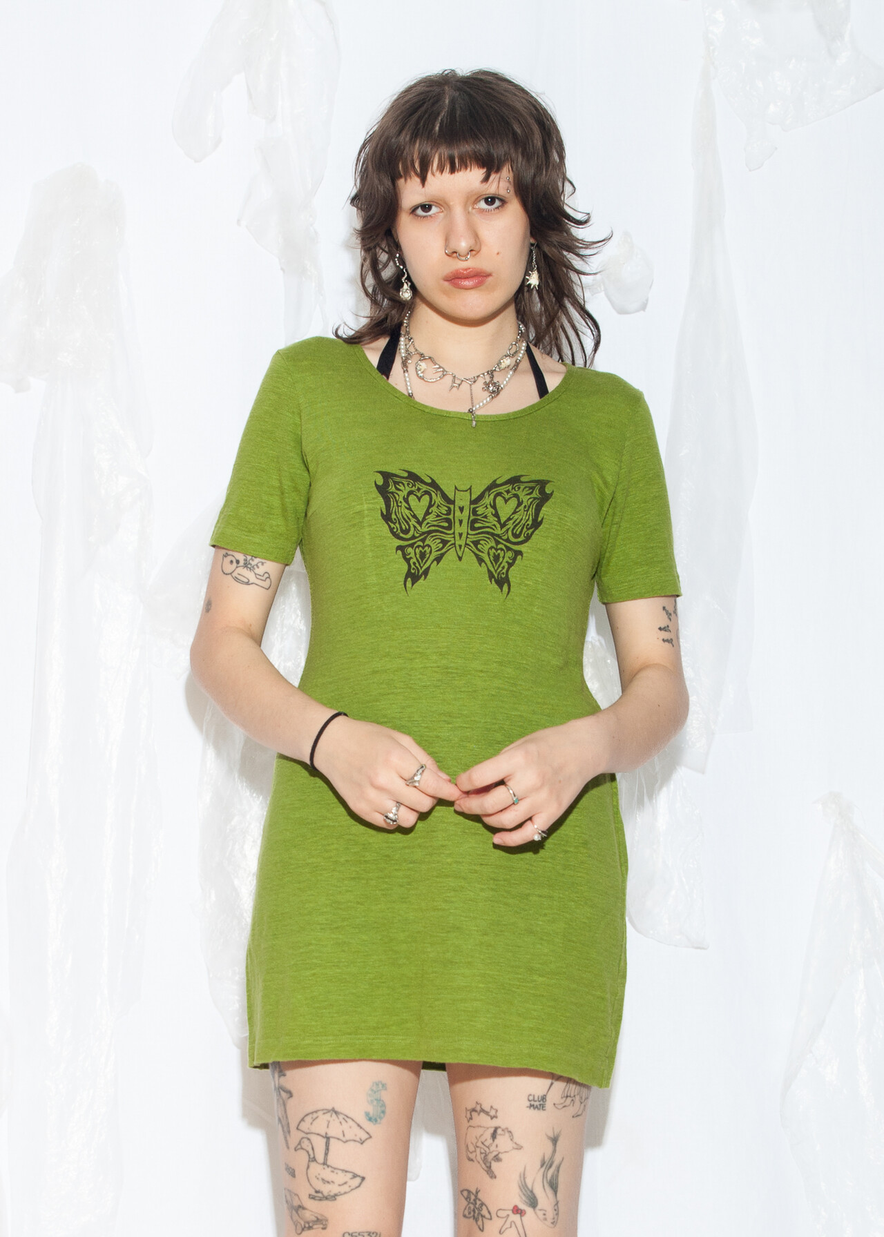 Tags: 2000s style clothing, butterfly pattern, green t-shirt dress, linen mini dress, reworked, whimsigoth, y2k vintage fashion