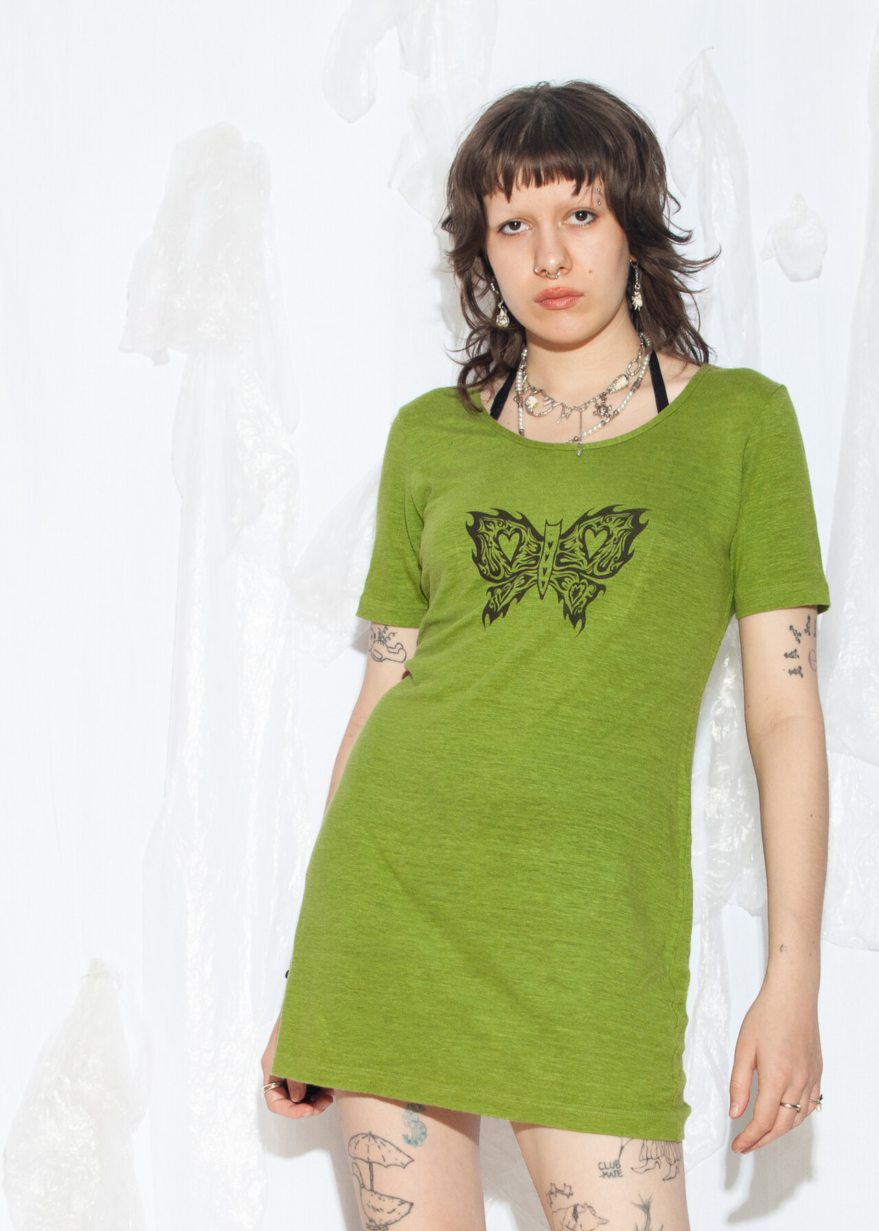 This Y2K vintage dress is a whimsigoth dream with its screen-printed butterfly pattern and green t-shirt vibes, perfect for those who want to flutter back to the 2000s without a time machine!