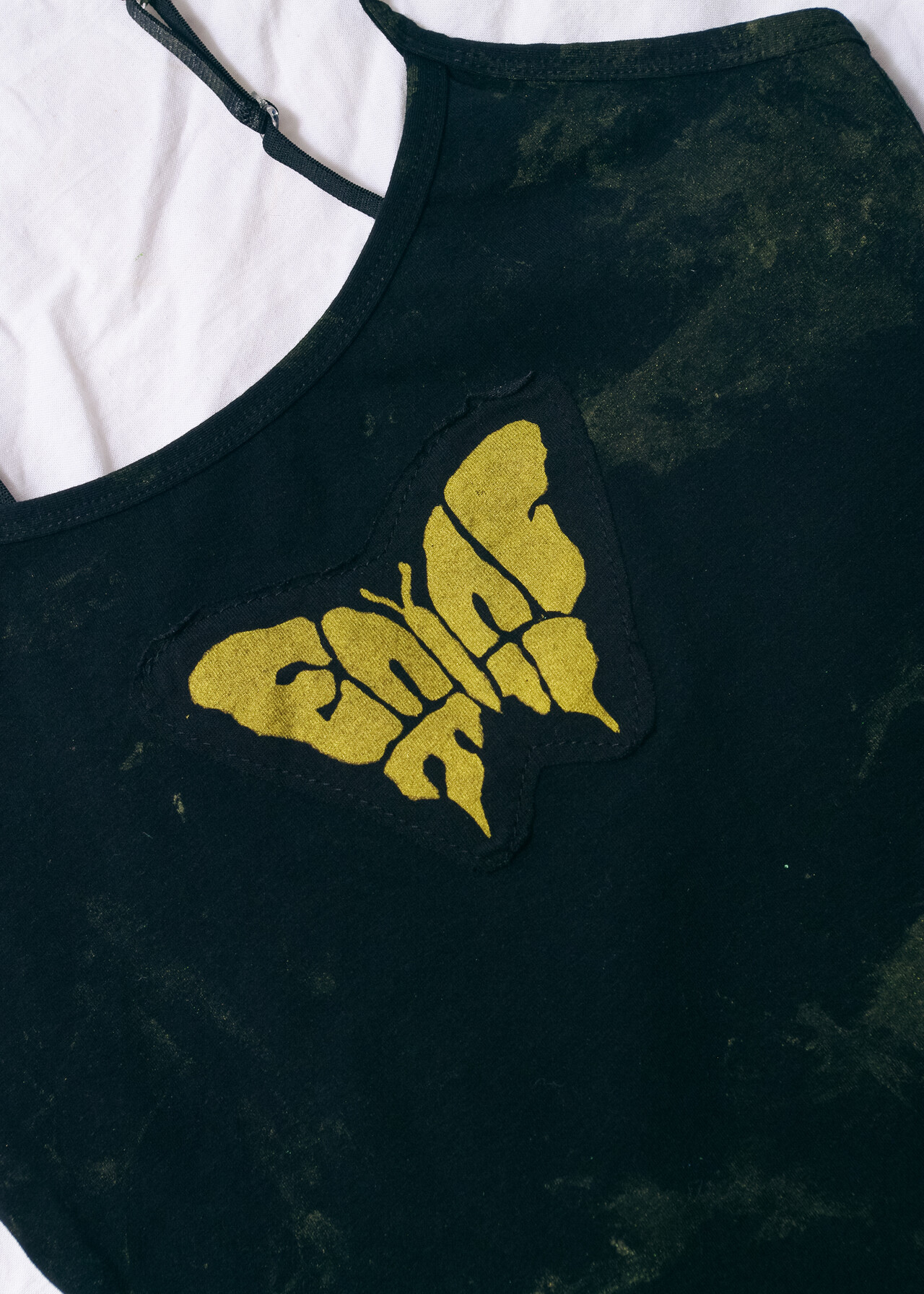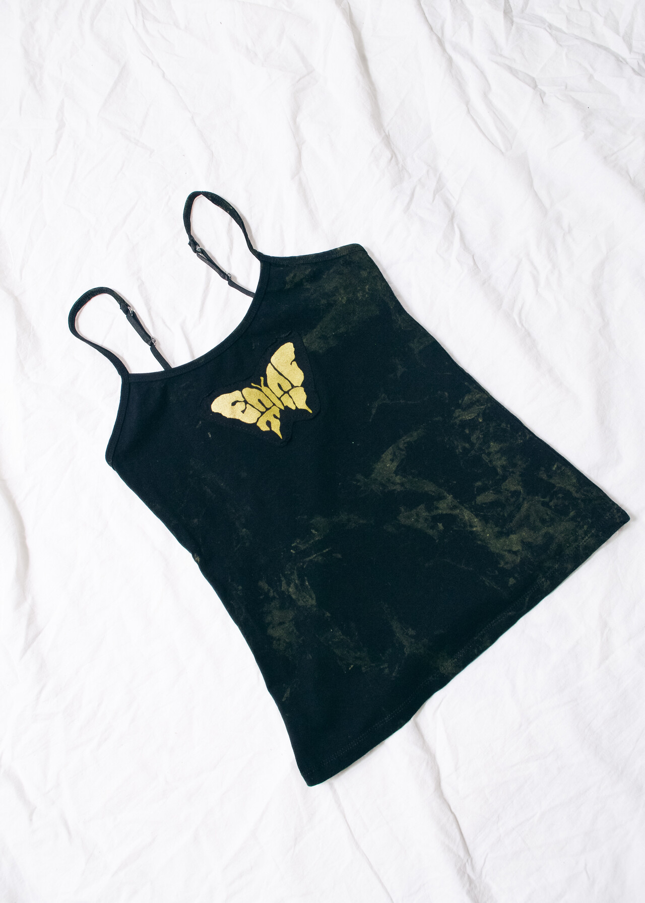 Tags: 2000s style clothing, butterfly patch, cami top, cotton camisole, Eat Acid, reworked, y2k vintage fashion