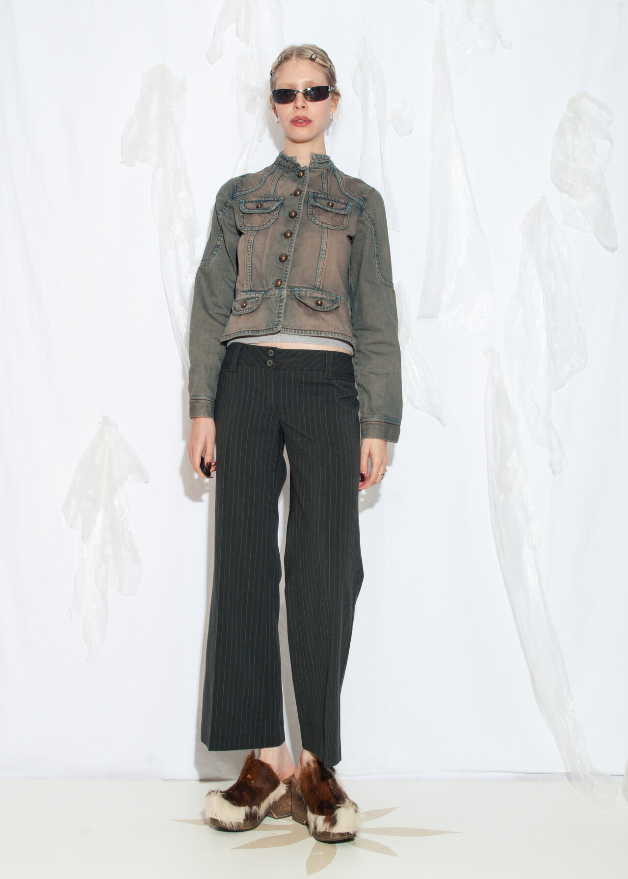 This Y2K vintage fitted denim jacket is your ticket to the early 2000s parade, complete with dirty mud wash.