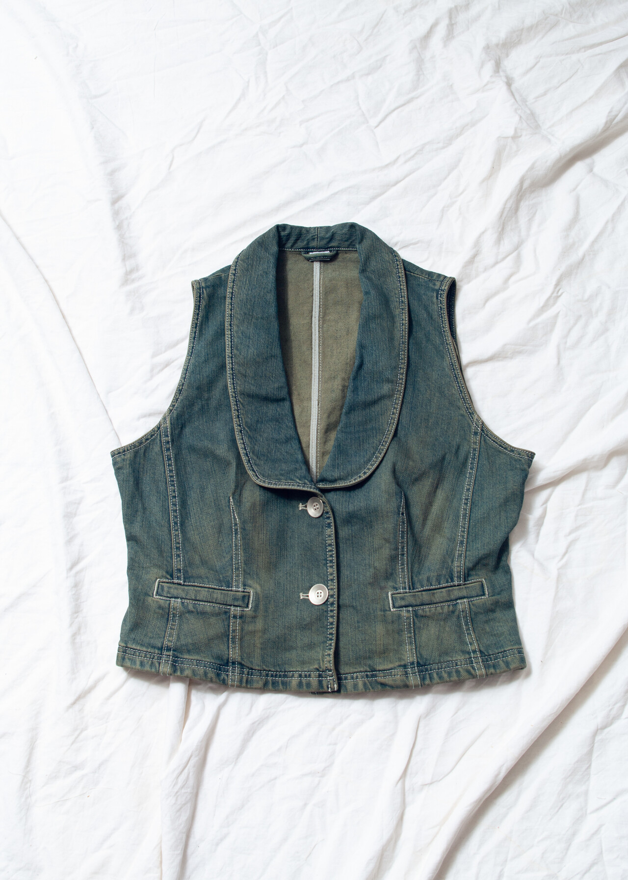 Tags: 2000s style clothing, fitted waistcoat, mud wash denim, reworked, slim fit vest, whimsigoth, y2k vintage fashion