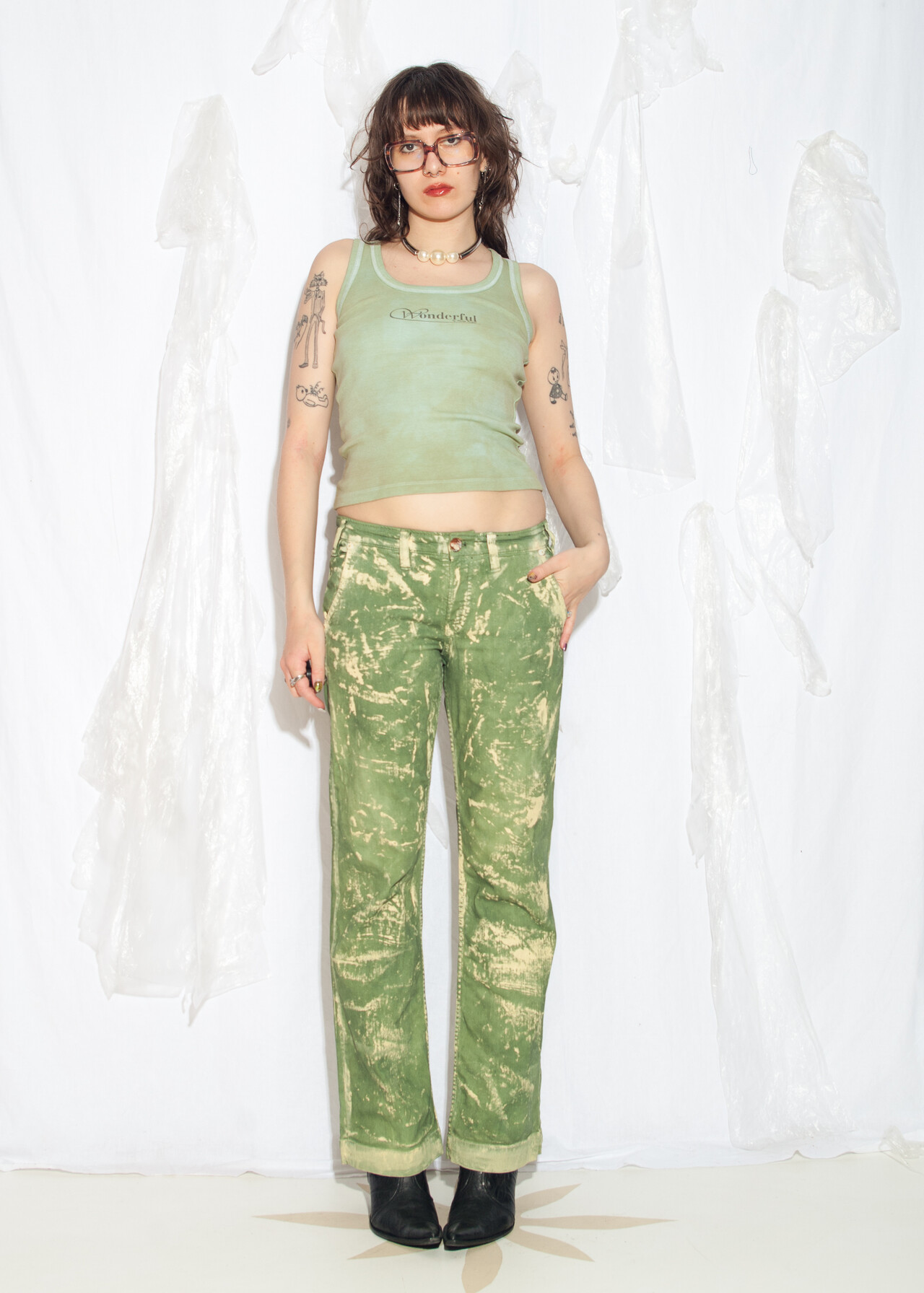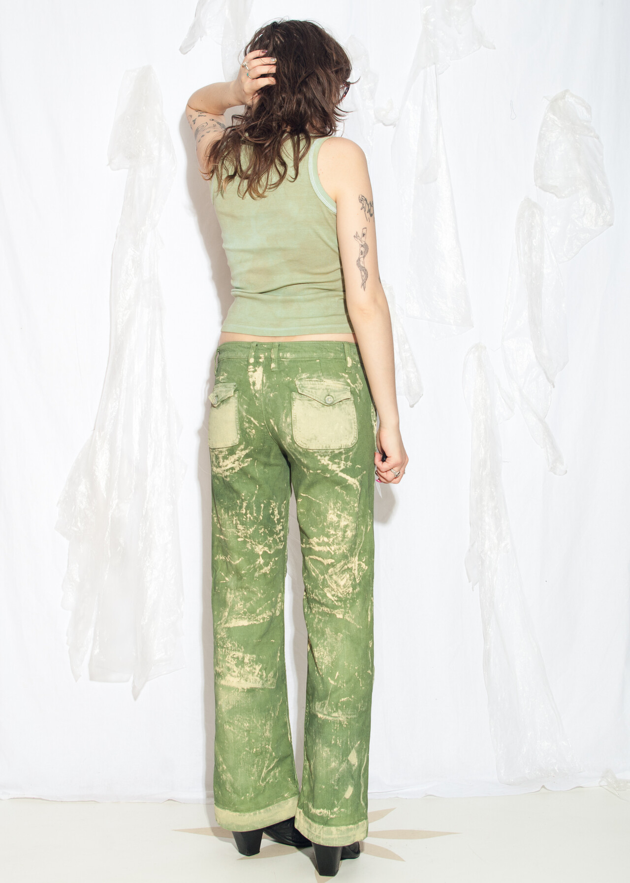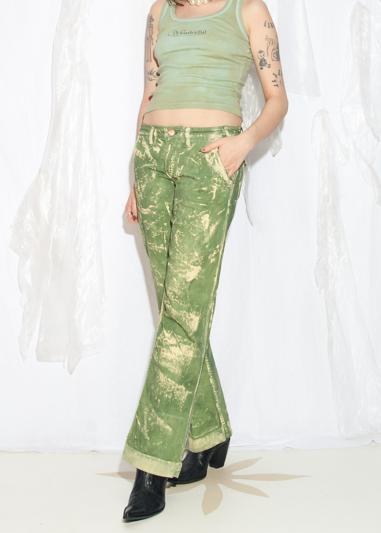 Tags: 2000s style clothing, bootcut jeans, denim flare pants, dirty painted, green flares, low rise waist, reworked, upcycled trousers, y2k vintage fashion
