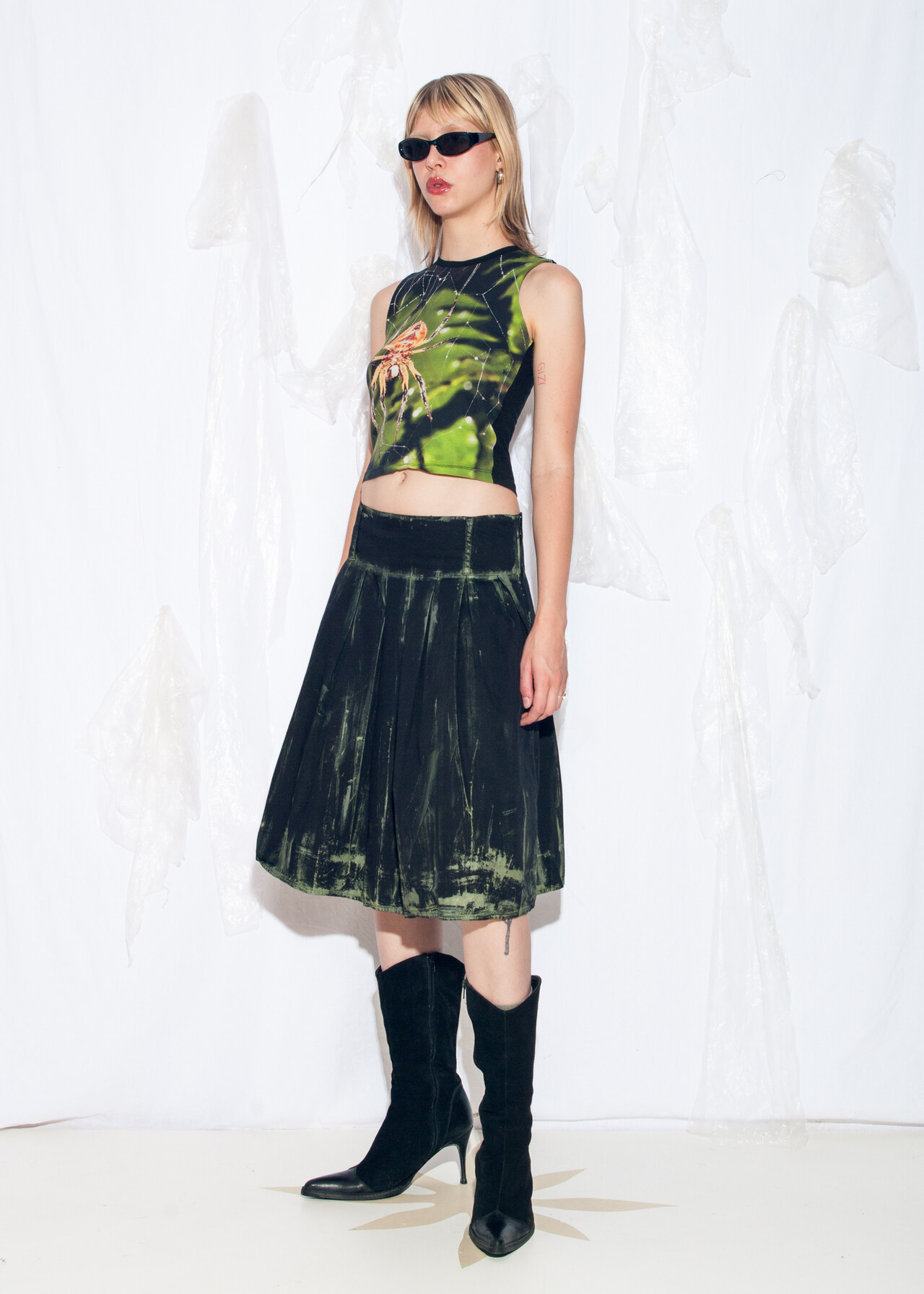 Tags: 2000s style clothing, cotton midi skirt, hand-painted, low rise waist, reworked, whimsigoth, y2k vintage fashion