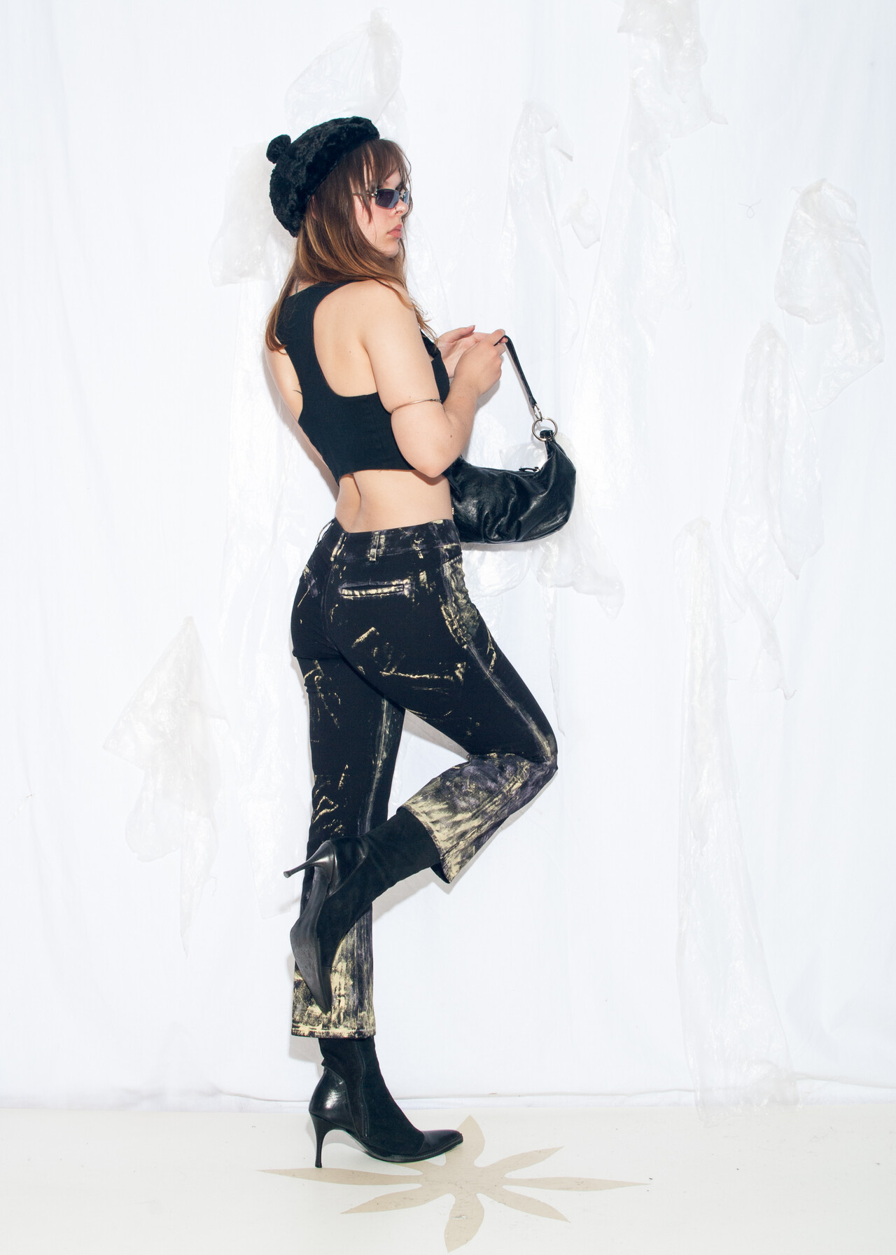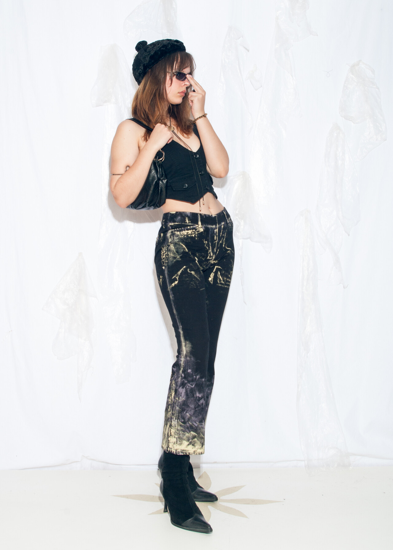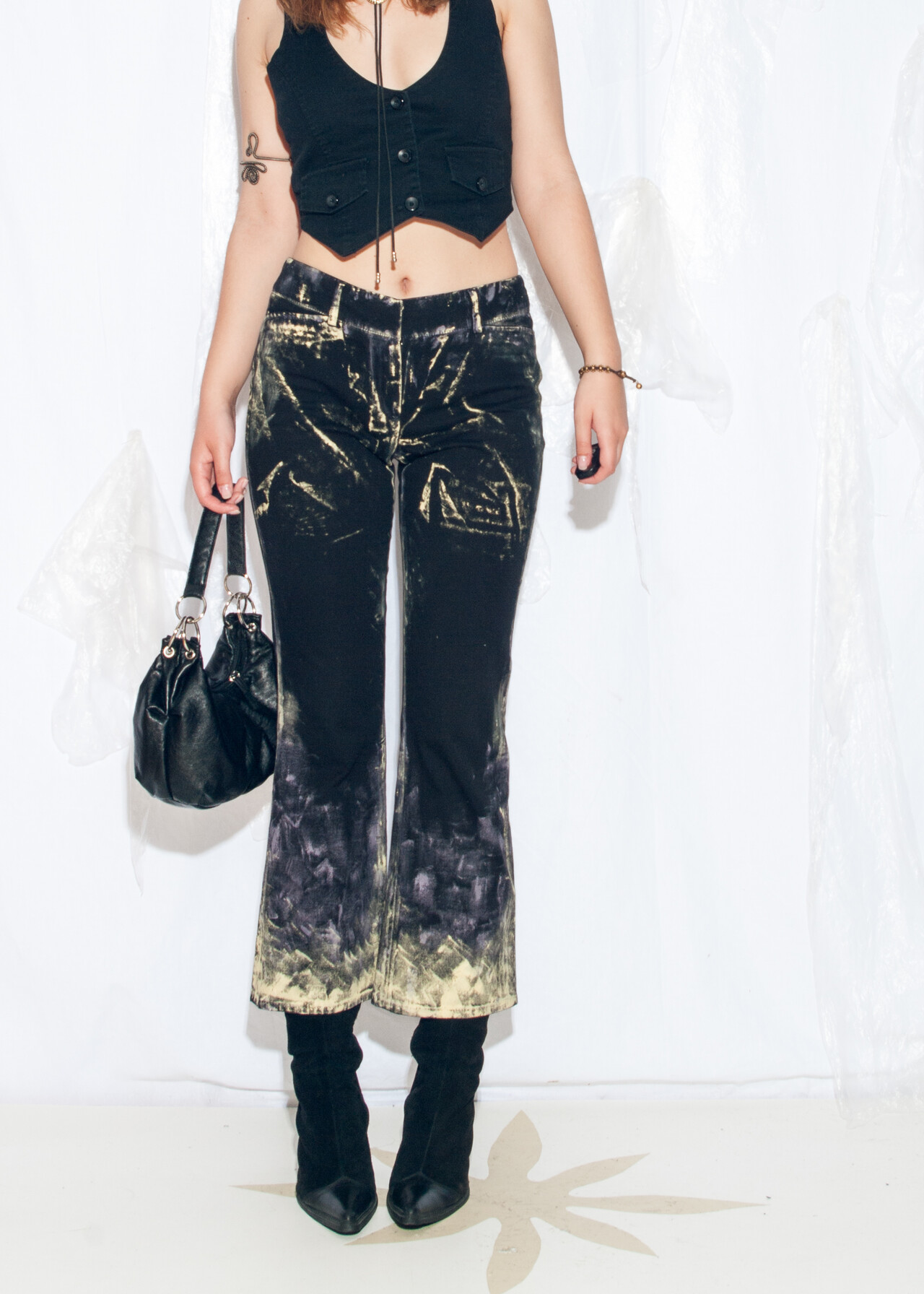 Y2K reworked hand-painted flare capri jeans – these black and yellow gems are like wearable time capsules ready to teleport you back to the era when flip phones were all the rage and your biggest worry was running out of text messages!