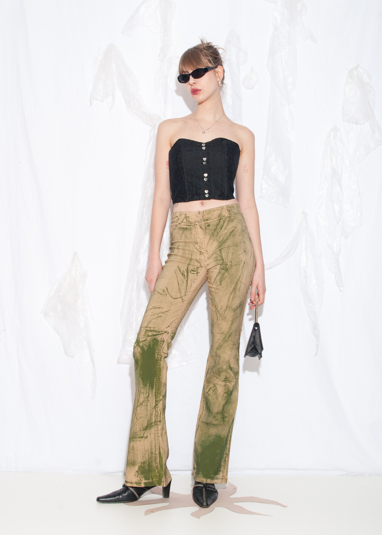 Tags: 2000s vintage style, hand-painted, high rise waist, reworked, upcycled, y2k flare pants