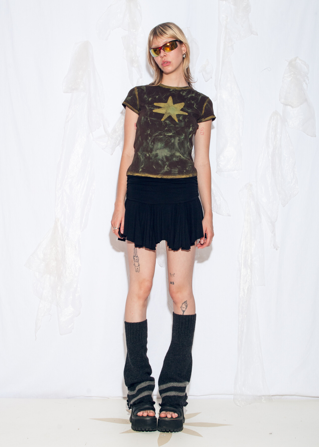 Tags: 2000s style clothing, brown dirty look, cotton baby tee, hand painted top, reworked, star printed t-shirt, upcycled crop top, whimsigoth, y2k grunge outfit, y2k vintage fashion