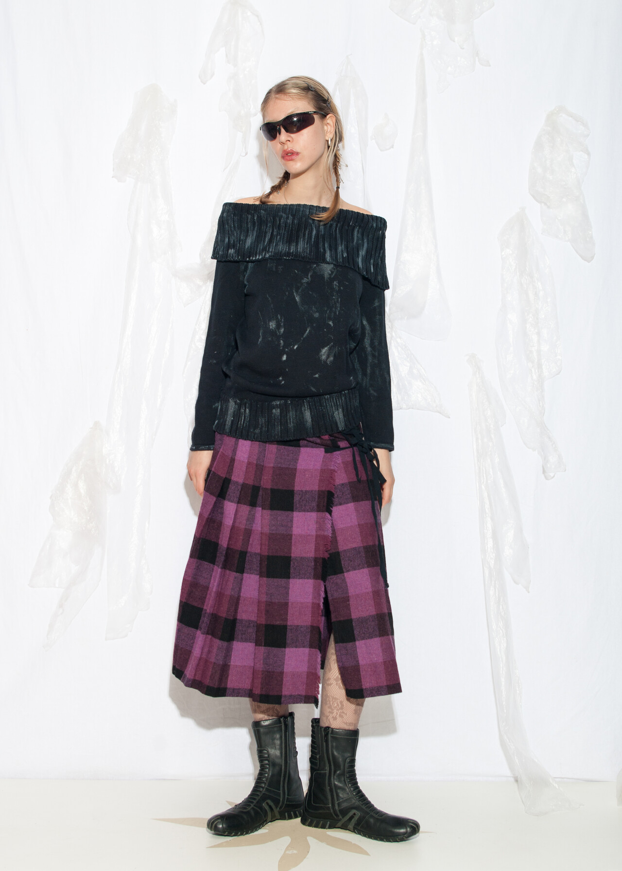 Tags: 00s streetwear, 2000s style clothing, cotton knitwear, dirty painted top, hand-painted, knitted sweatshirt, off shoulder jumper, reworked, upcycled pullover, wearable art, whimsigoth, y2k grunge outfit, y2k vintage fashion