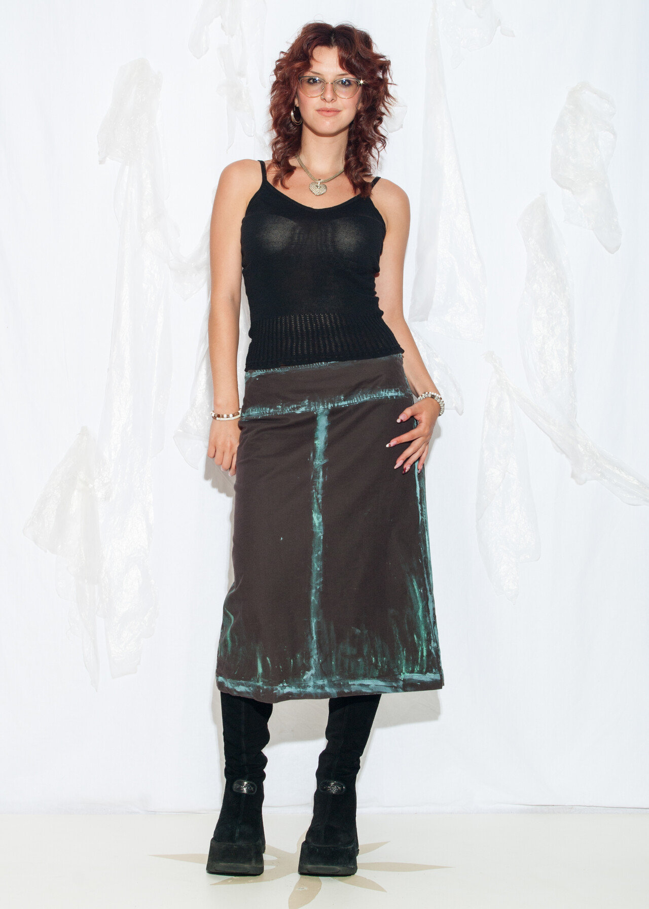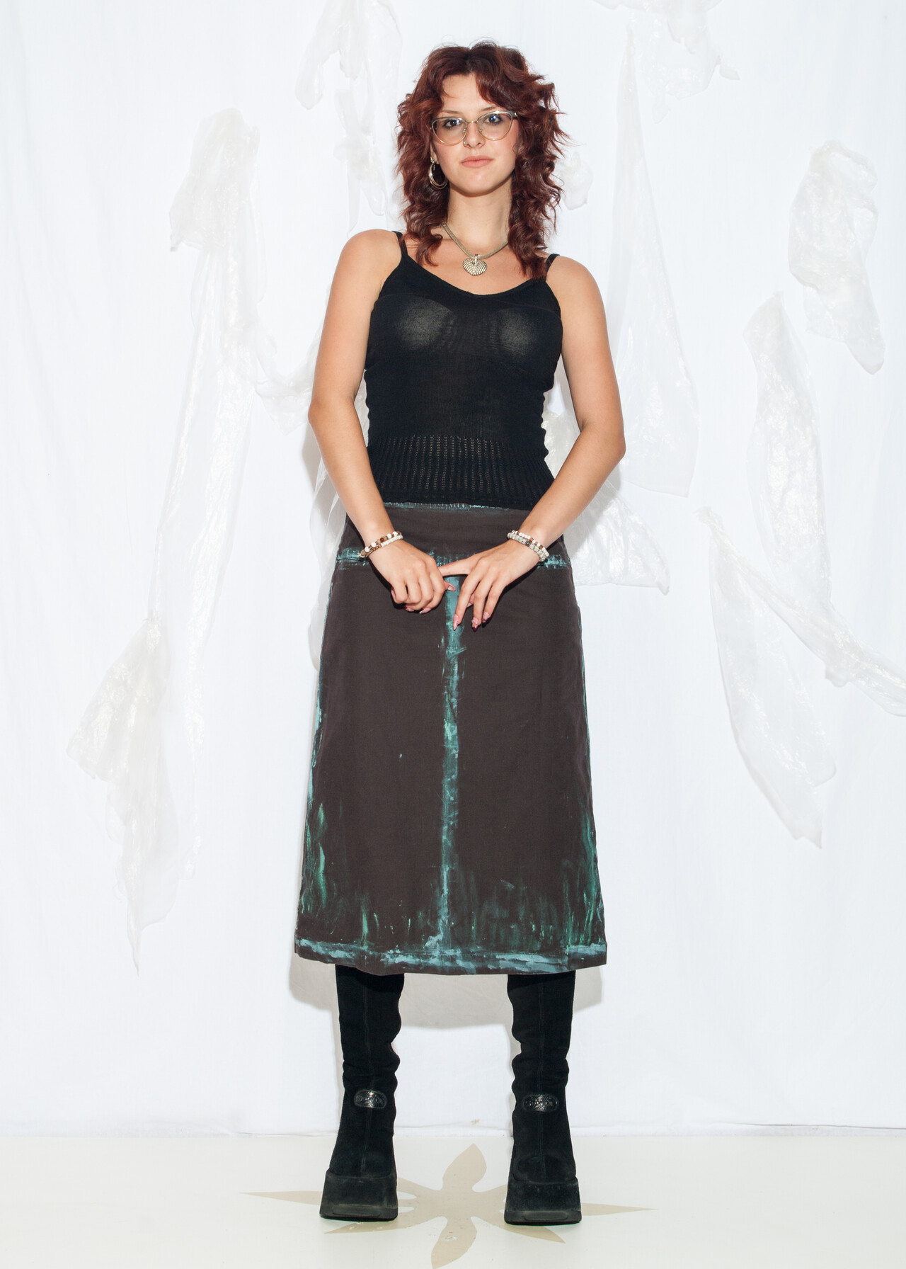 Tags: 2000s style clothing, brown bottoms, cotton midi skirt, dirty look, hand-painted, lace up detail, low rise waist, reworked, y2k vintage fashion