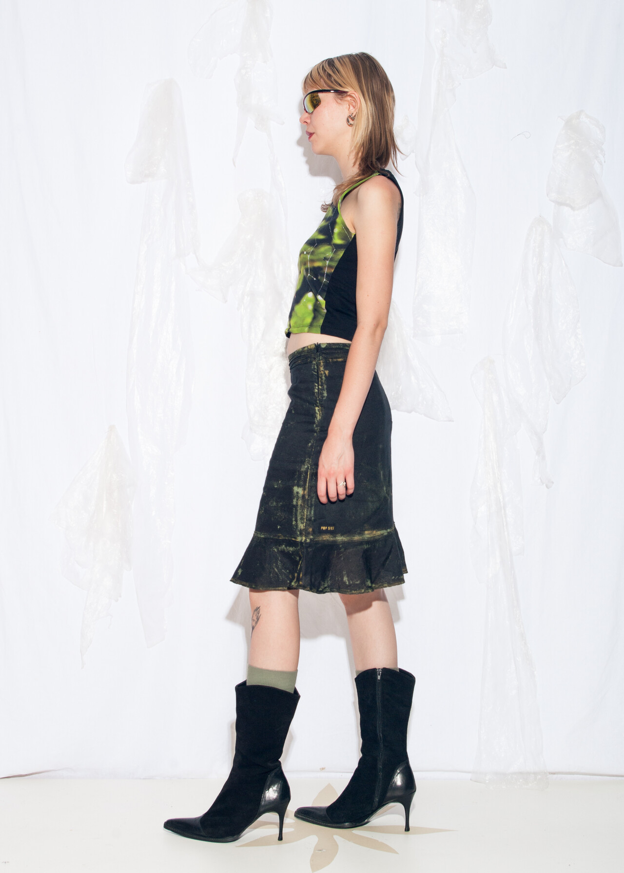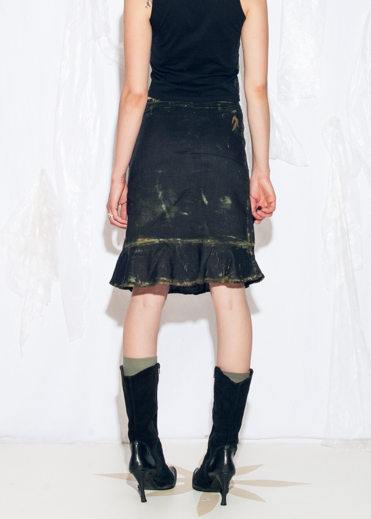Tags: 2000s style clothing, dirty look, hand-painted, linen midi skirt, low rise waist, reworked, whimsigoth, y2k vintage fashion