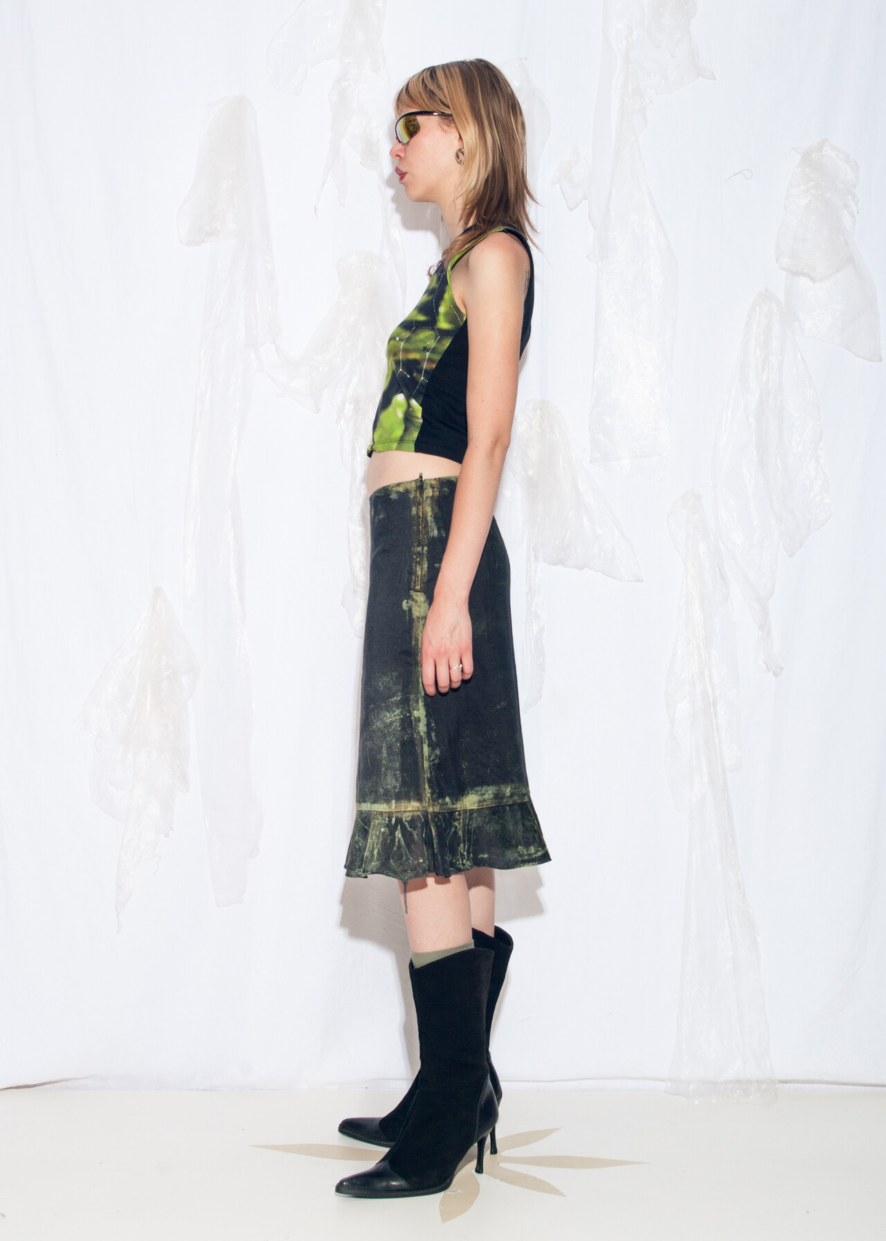 Reworked Vintage Y2K Linen Midi Skirt in Green Painted