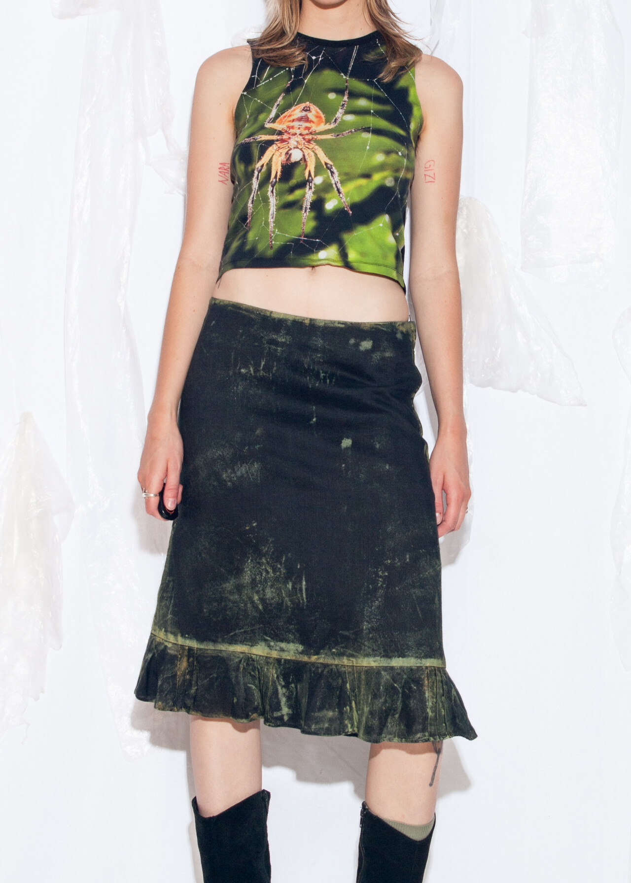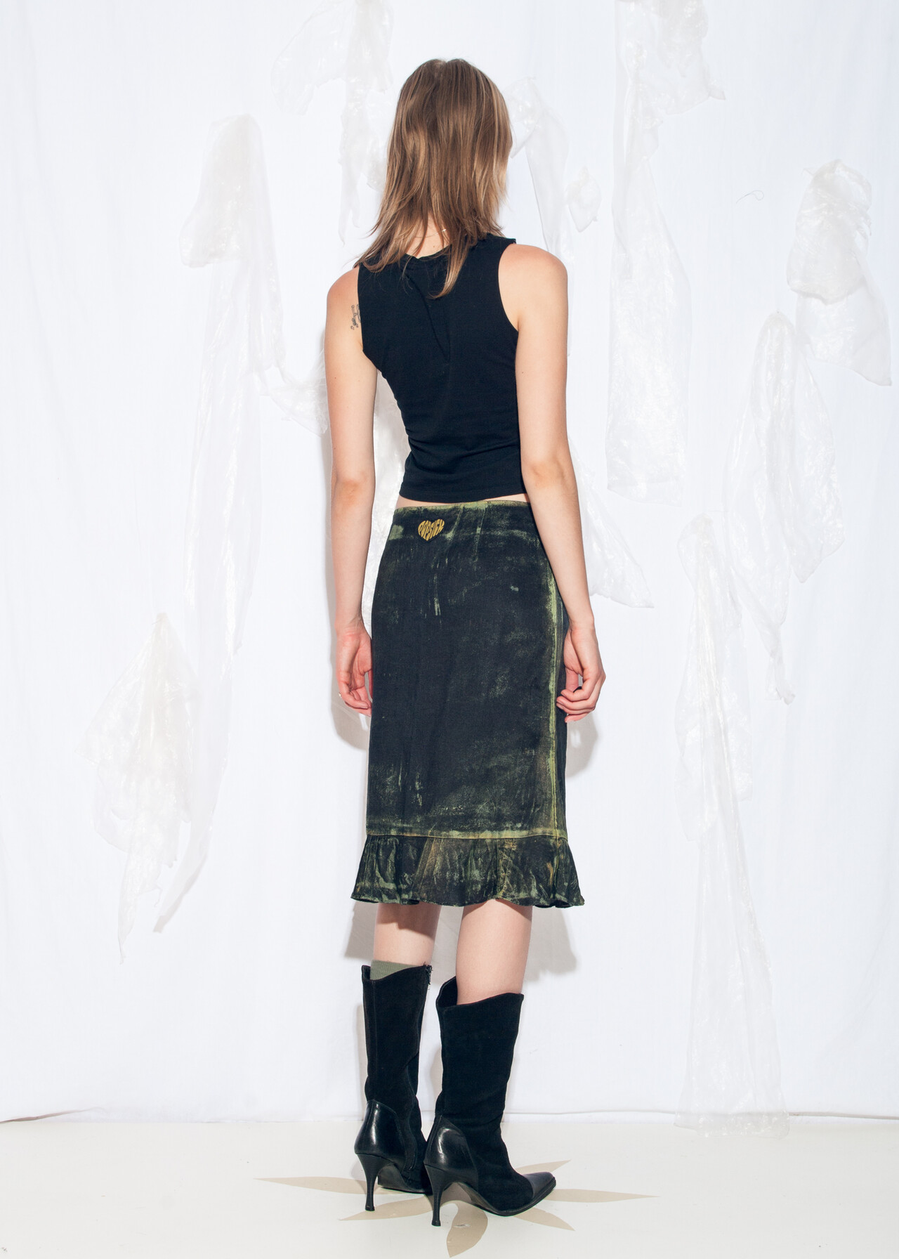 Tags: 2000s style clothing, dirty painted, linen midi skirt, low rise waist, reworked, y2k vintage fashion