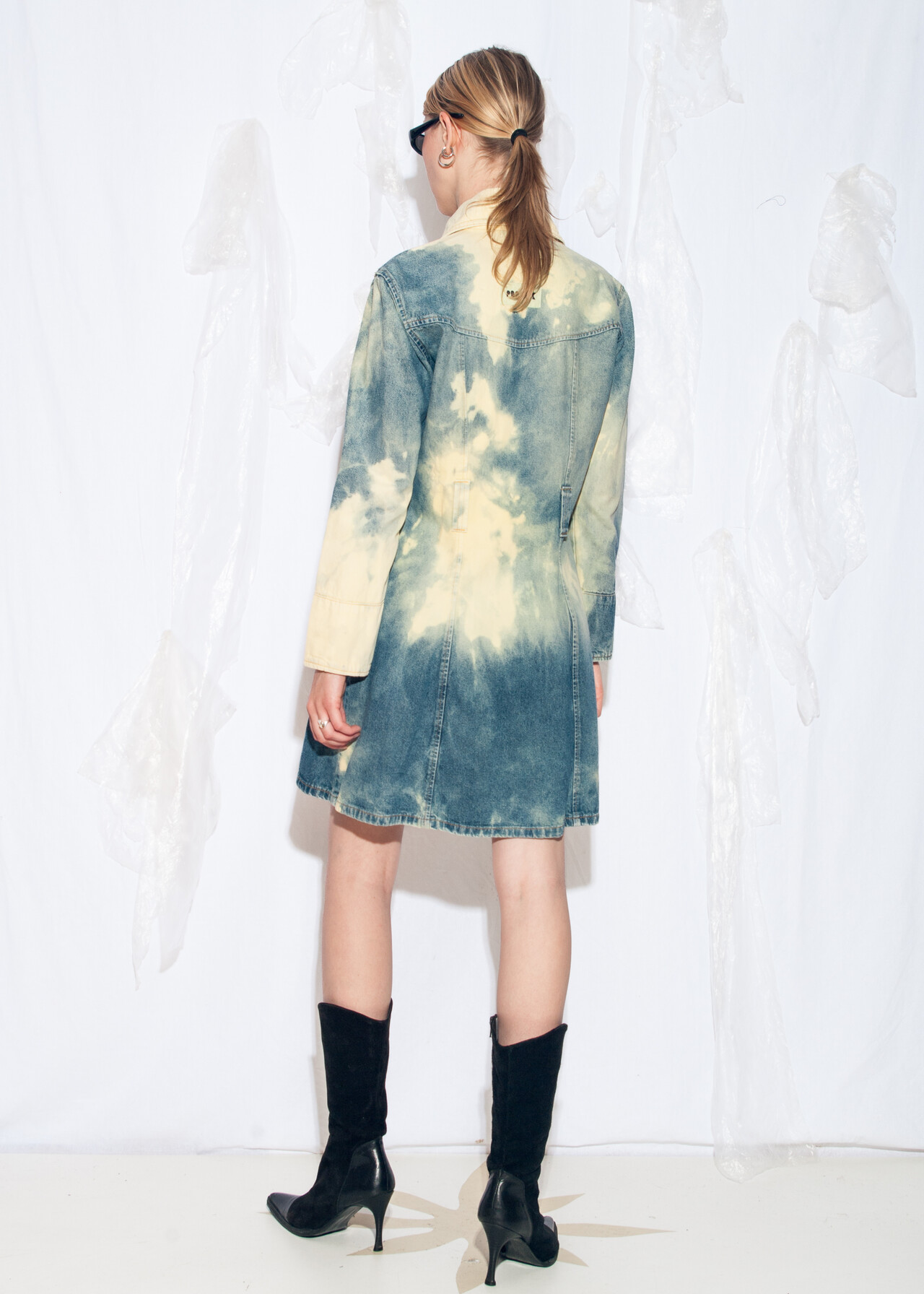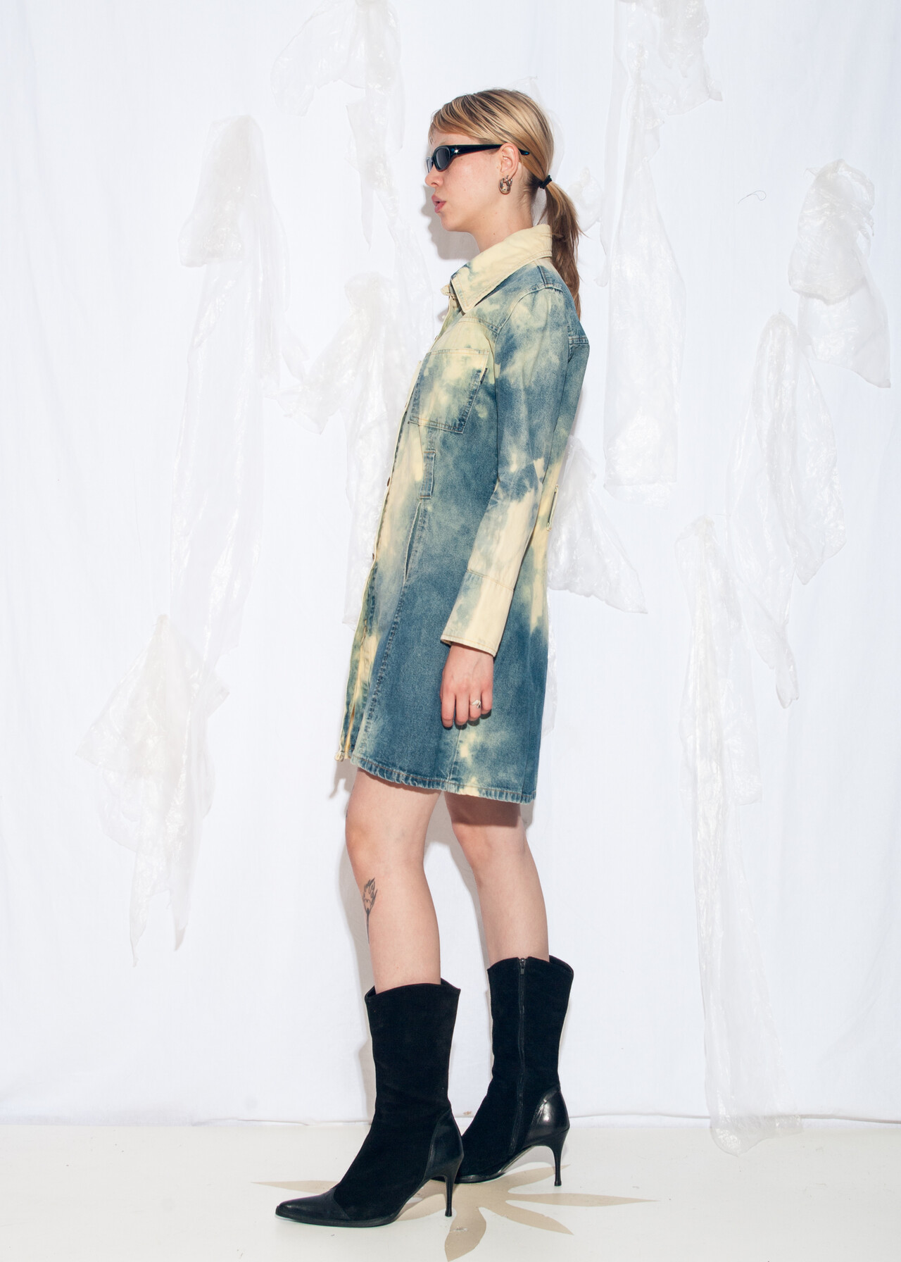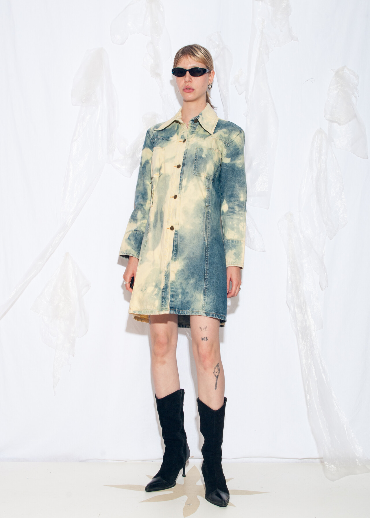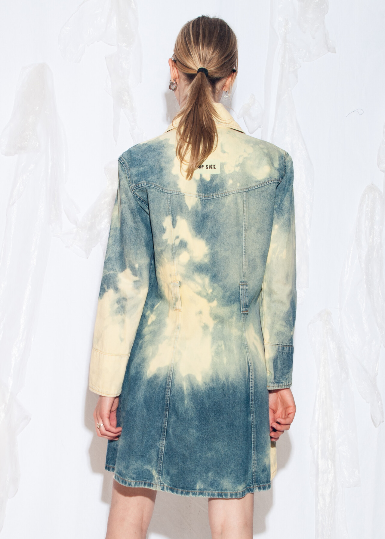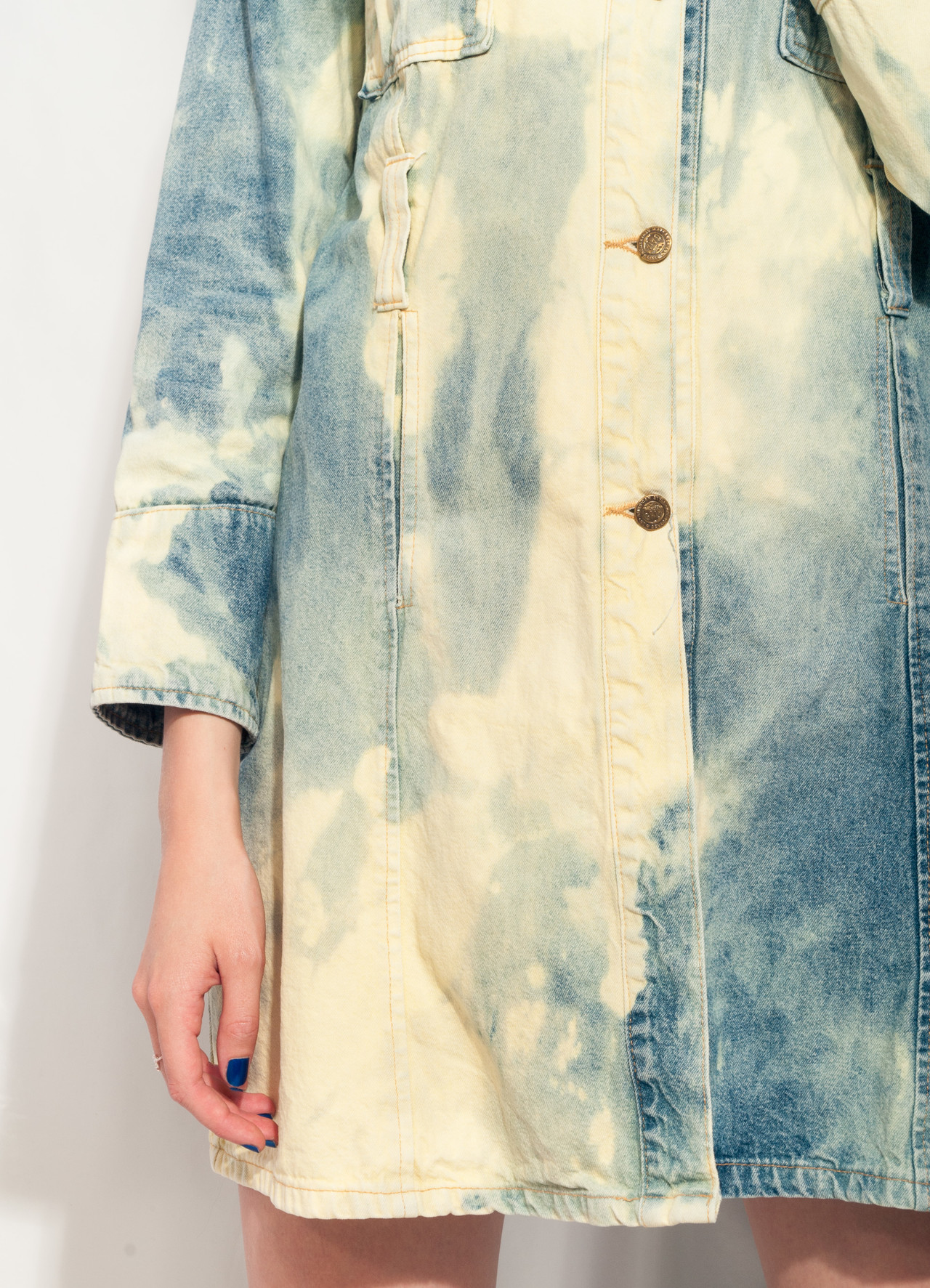 Tags: 2000s style clothing, acid wash blue, European vintage, fitted jean jacket, long jacket, longline denim coat, reworked, slim fit trench coat, tie-dye cloud, y2k grunge outfit, y2k vintage fashion
