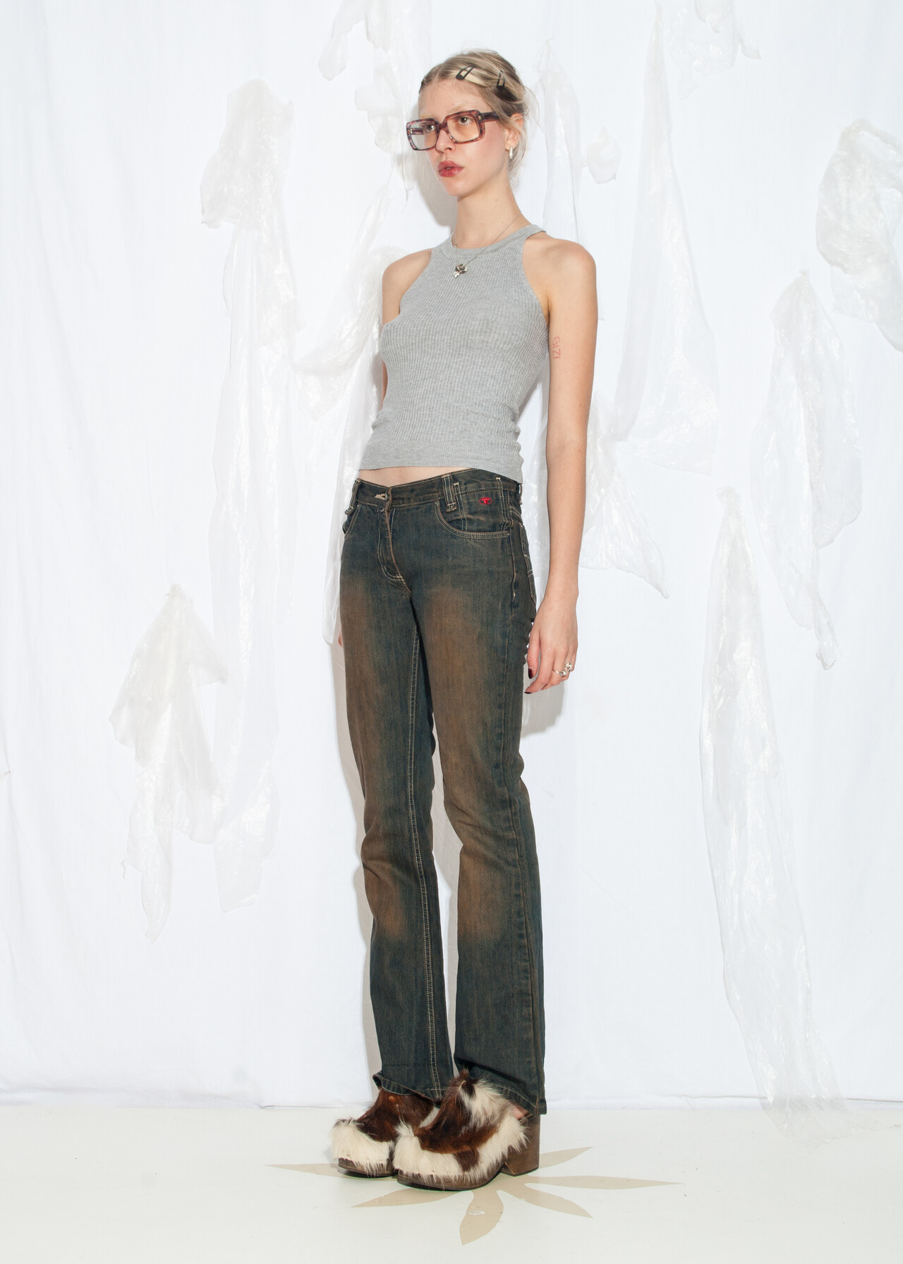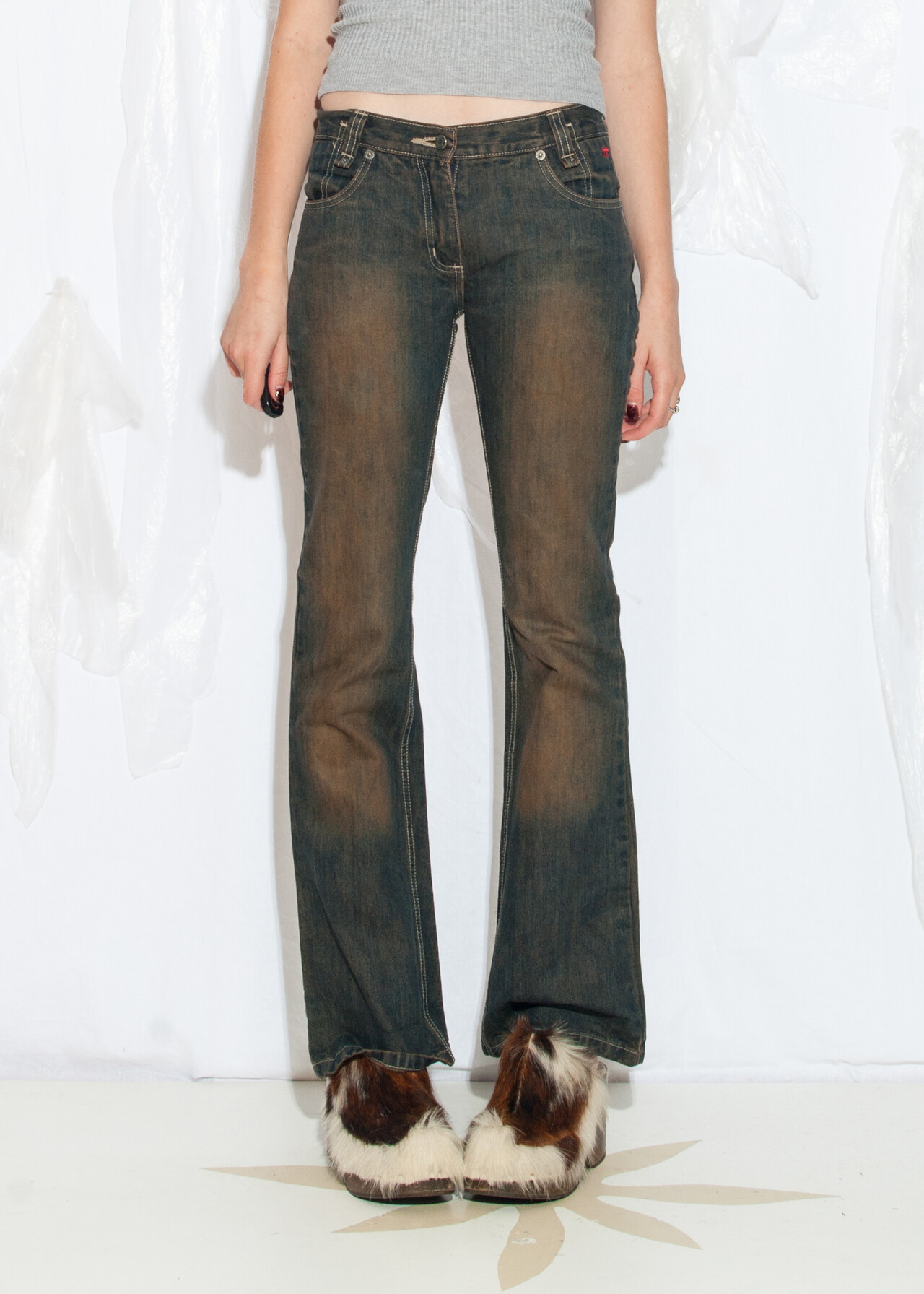 These Y2K vintage flare jeans in brown mud wash are the ultimate throwback for anyone ready to relive the era of low-waisted bottoms.