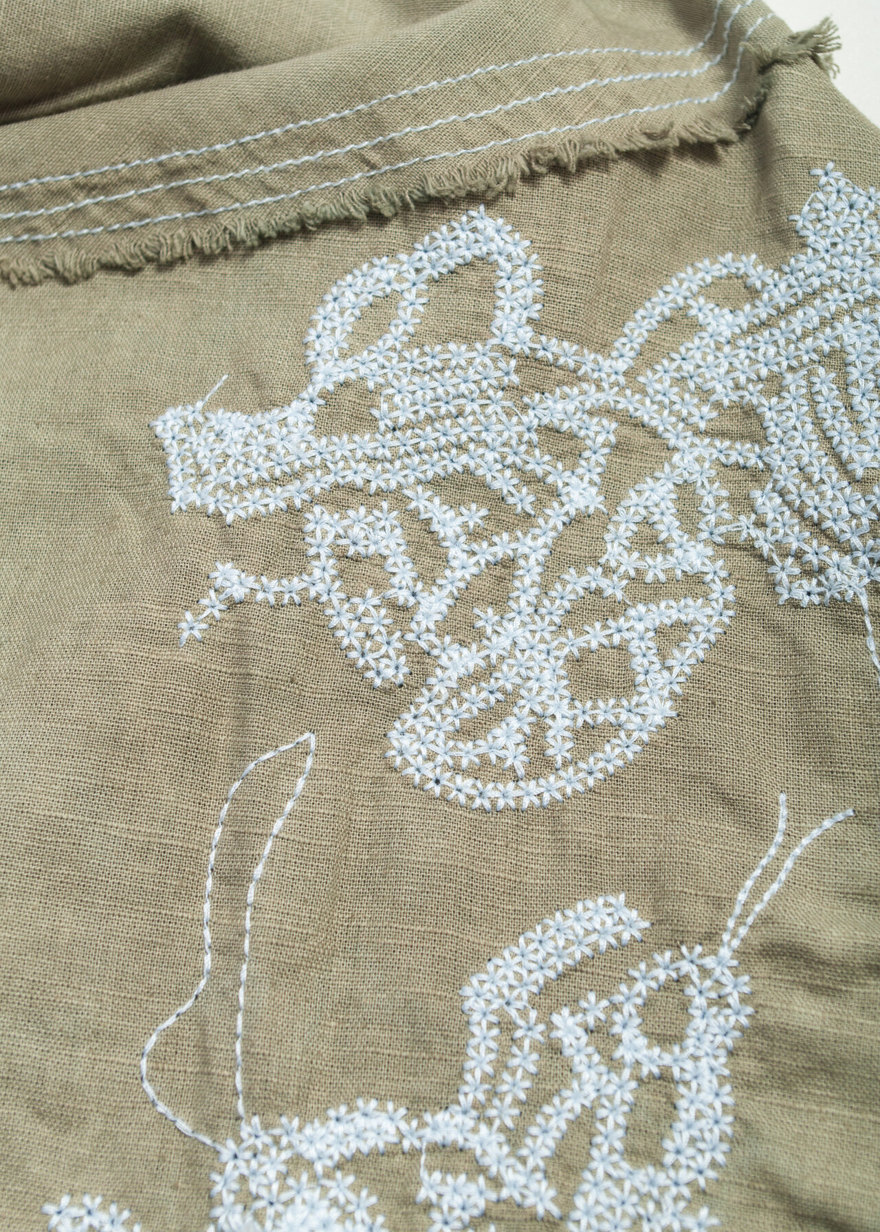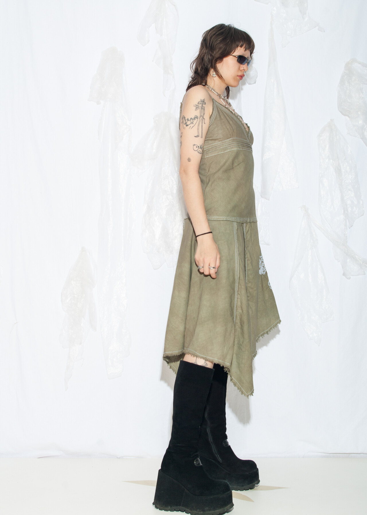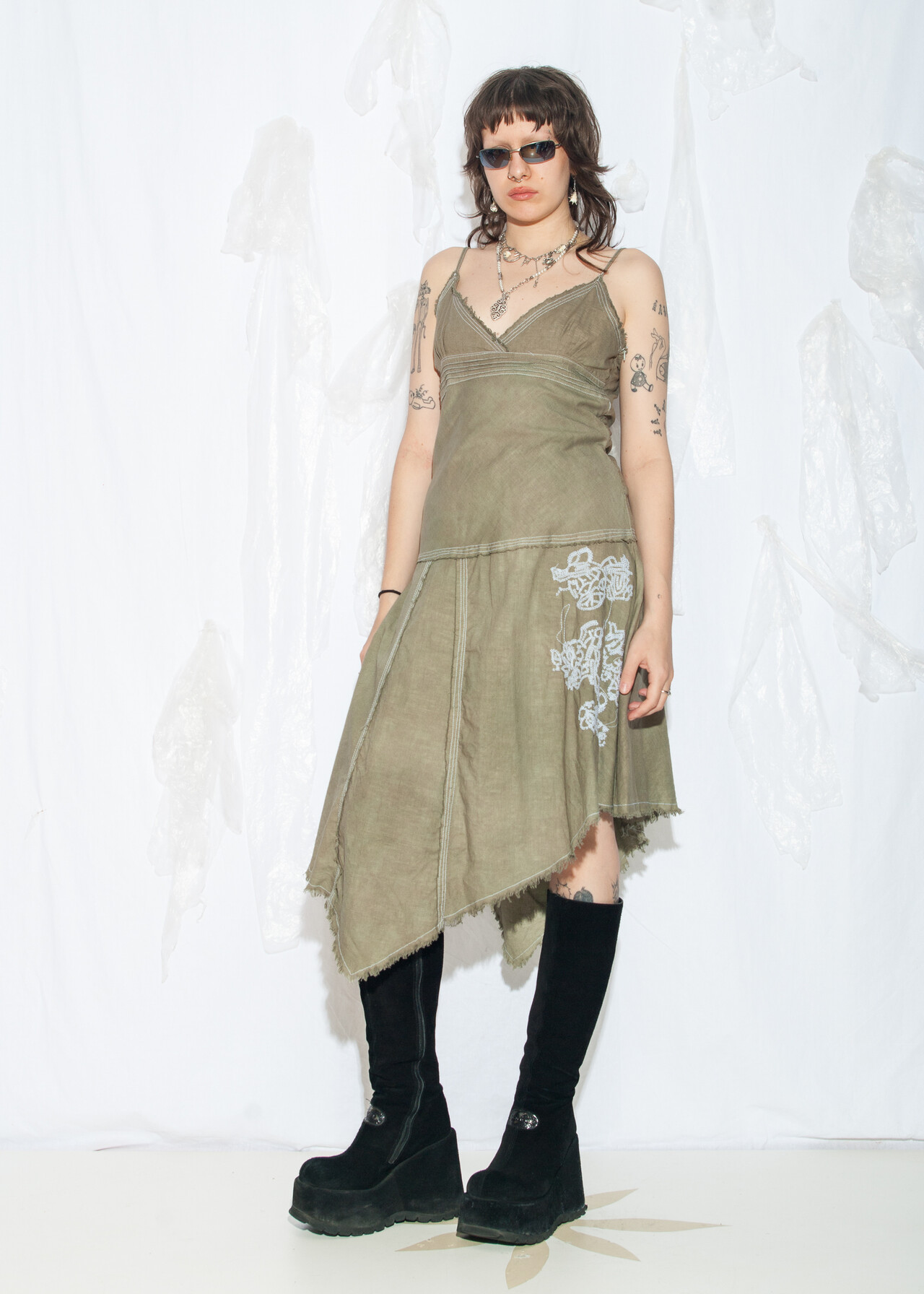 Tags: 2000s style clothing, asymmetric raw hem, flower embroidery, linen dress, mud wash dyed, reworked, whimsigoth, y2k vintage fashion