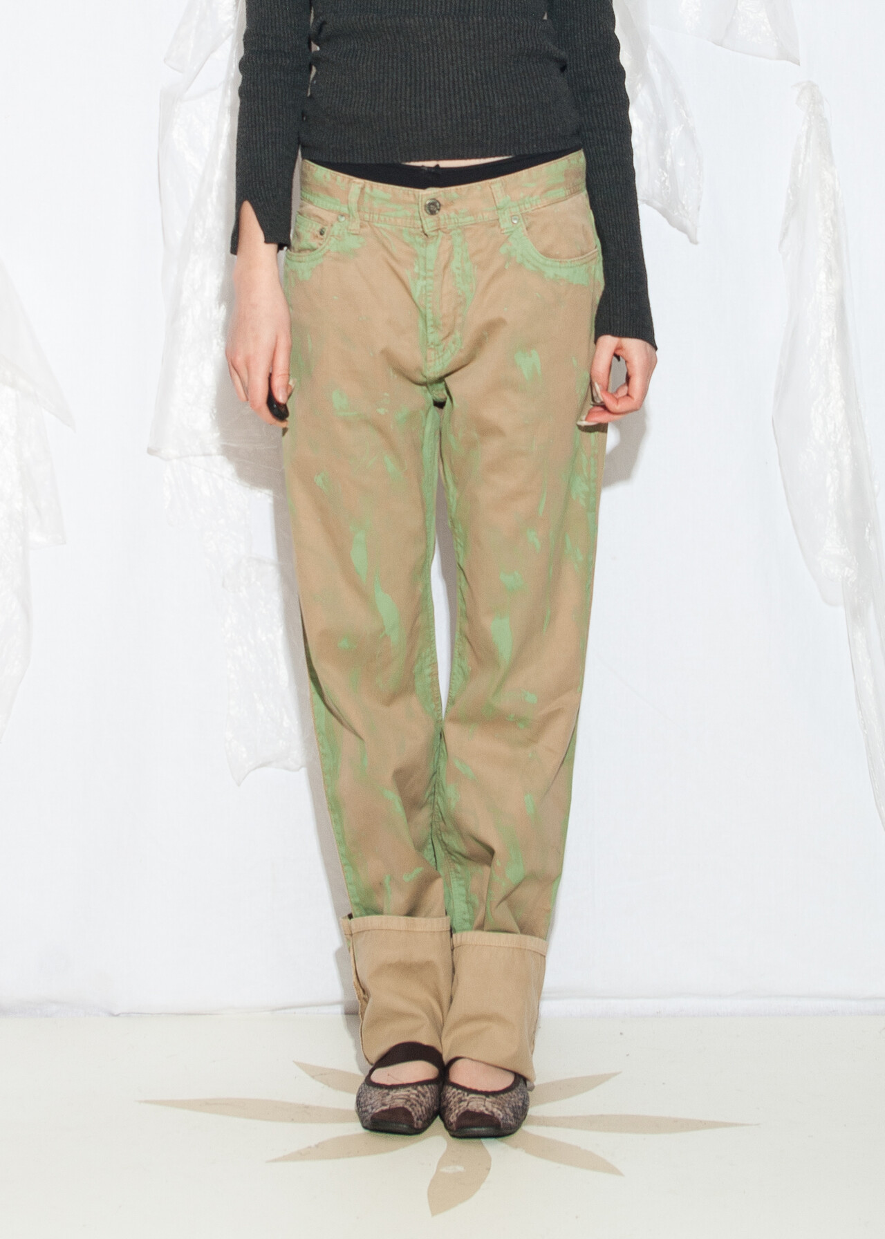 These Y2K vintage trousers are slouchy jeans with a twist – hand painted and reworked for maximum nostalgia. Embrace the 2000s in style with these gender-neutral, straight-fit wonders.