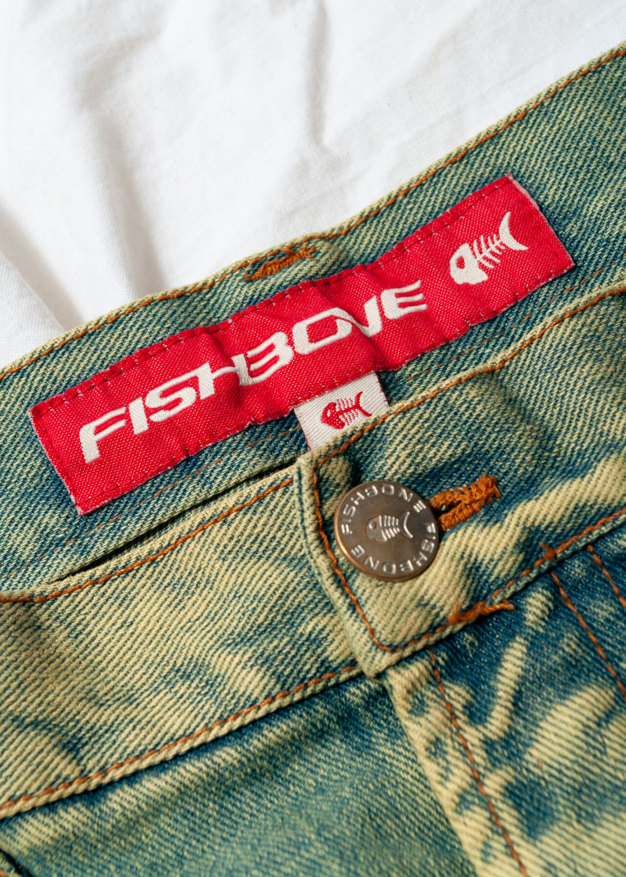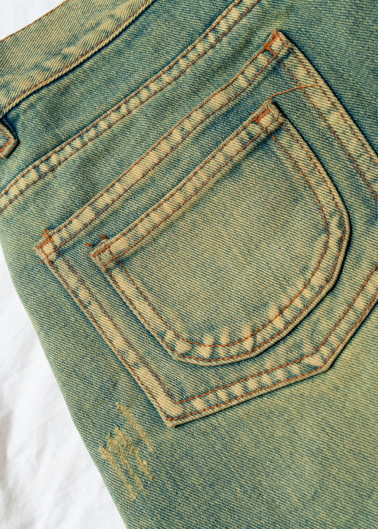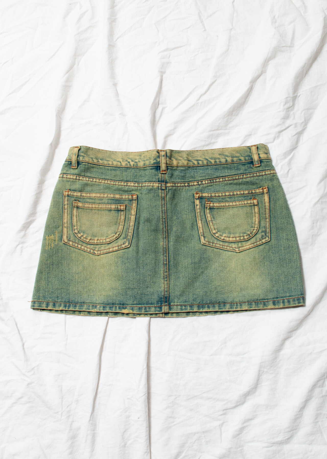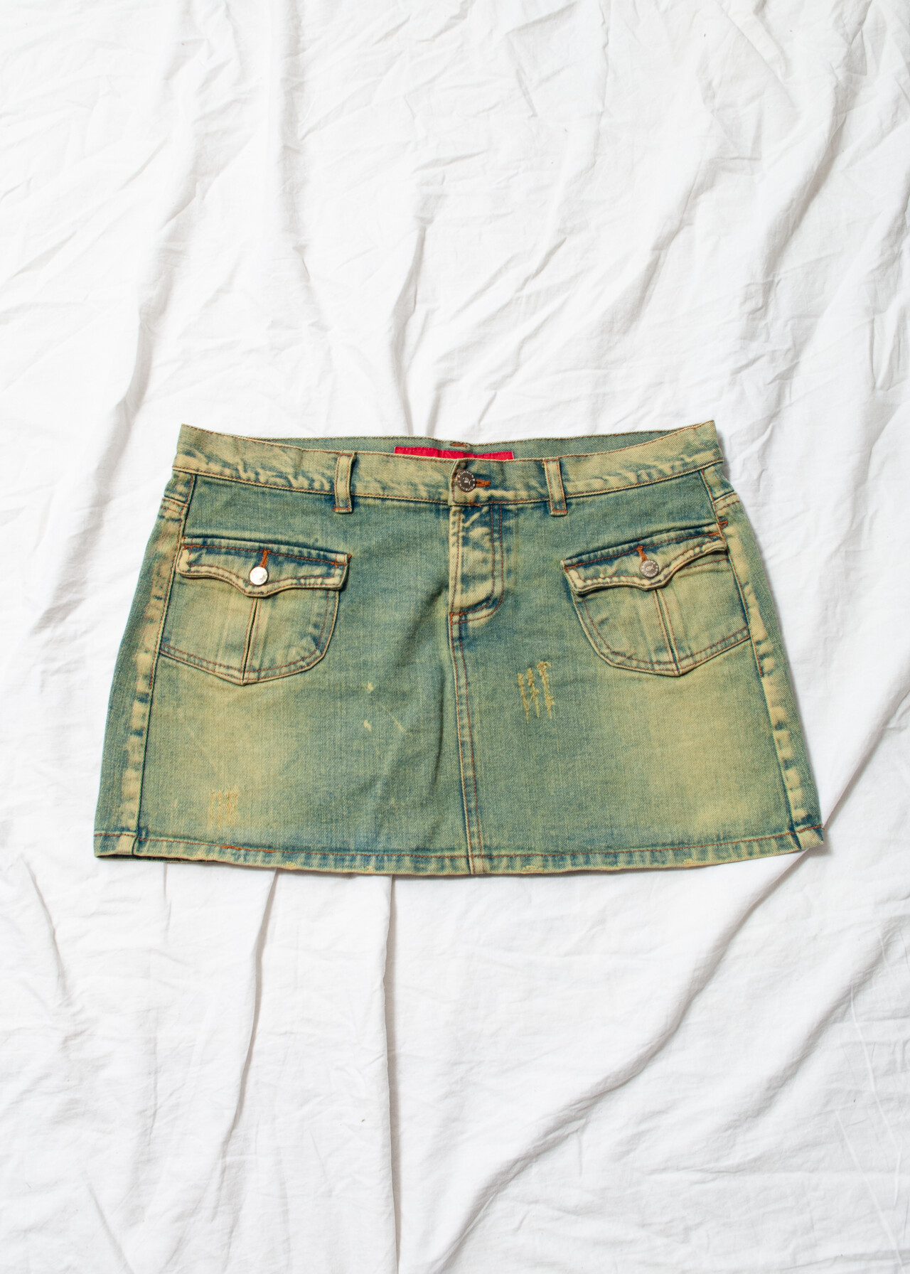 Y2K vintage denim micro skirt – because every closet needs a mud wash green low-rise blast from the early 2000s.