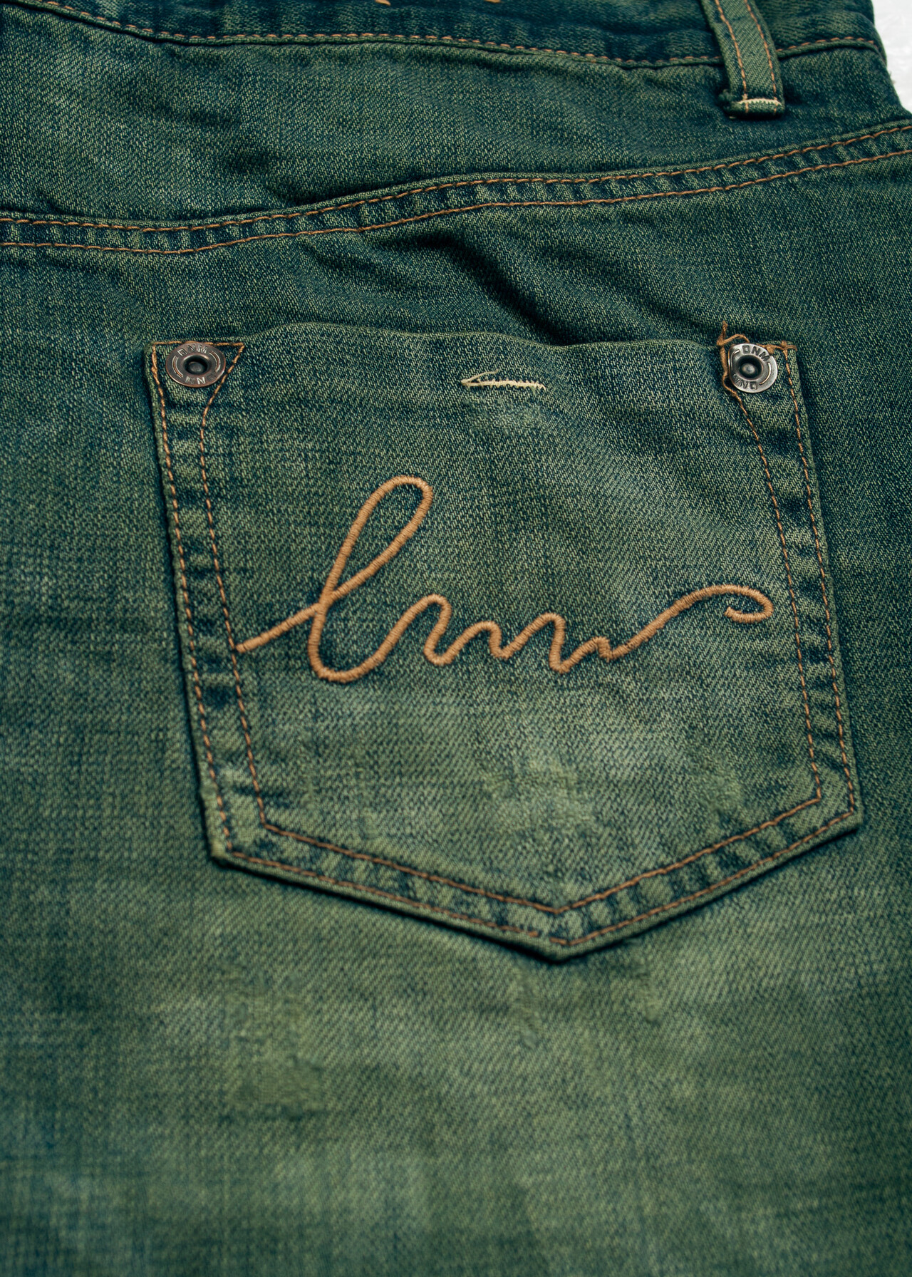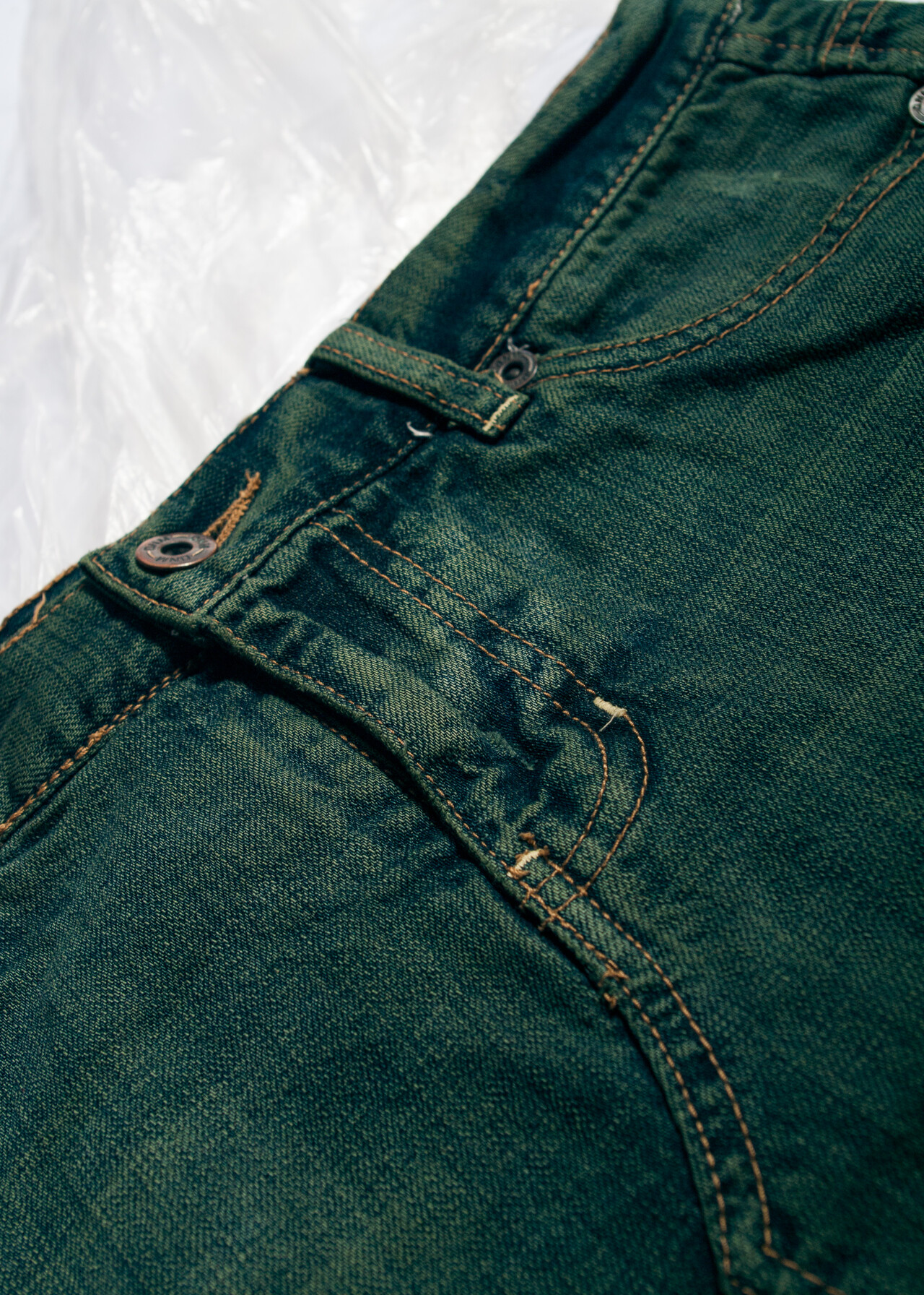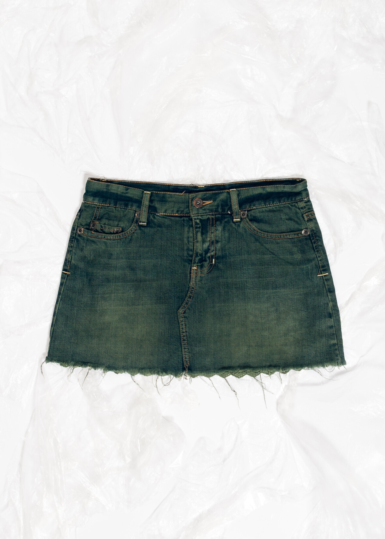 Tags: 2000s vintage style, denim micro skirt, low rise waist, mud wash green, overdyed, reworked, whimsigoth