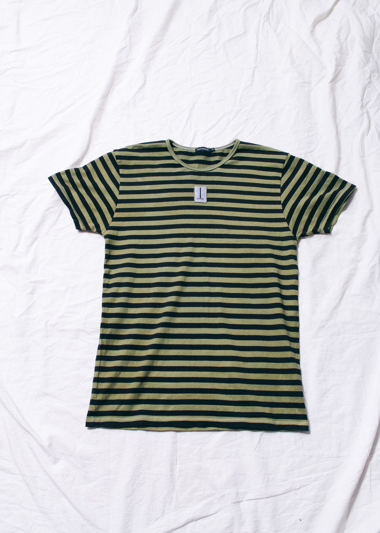 Tags: 2000s style clothing, 90s grunge clothes, classic t-shirt, Marimekko, mud wash, overdyed khaki, reworked, striped cotton tee, y2k vintage fashion