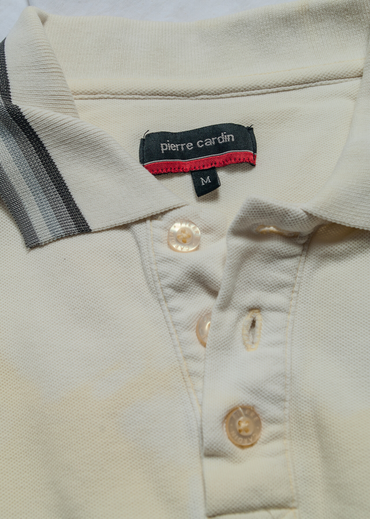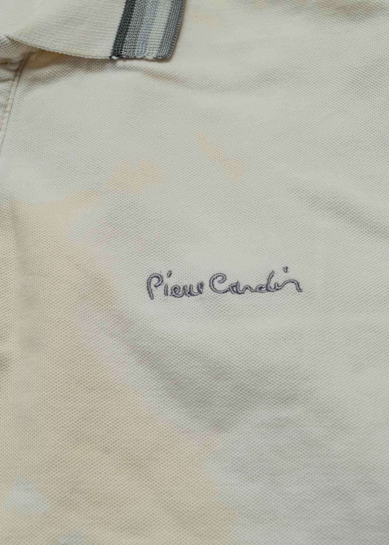 Tags: 2000s style clothing, collared tee, gender neutral, golf shirt, oversized t-shirt, Pierre Cardin, reworked, tie-dye bleached, white cotton top, y2k vintage fashion