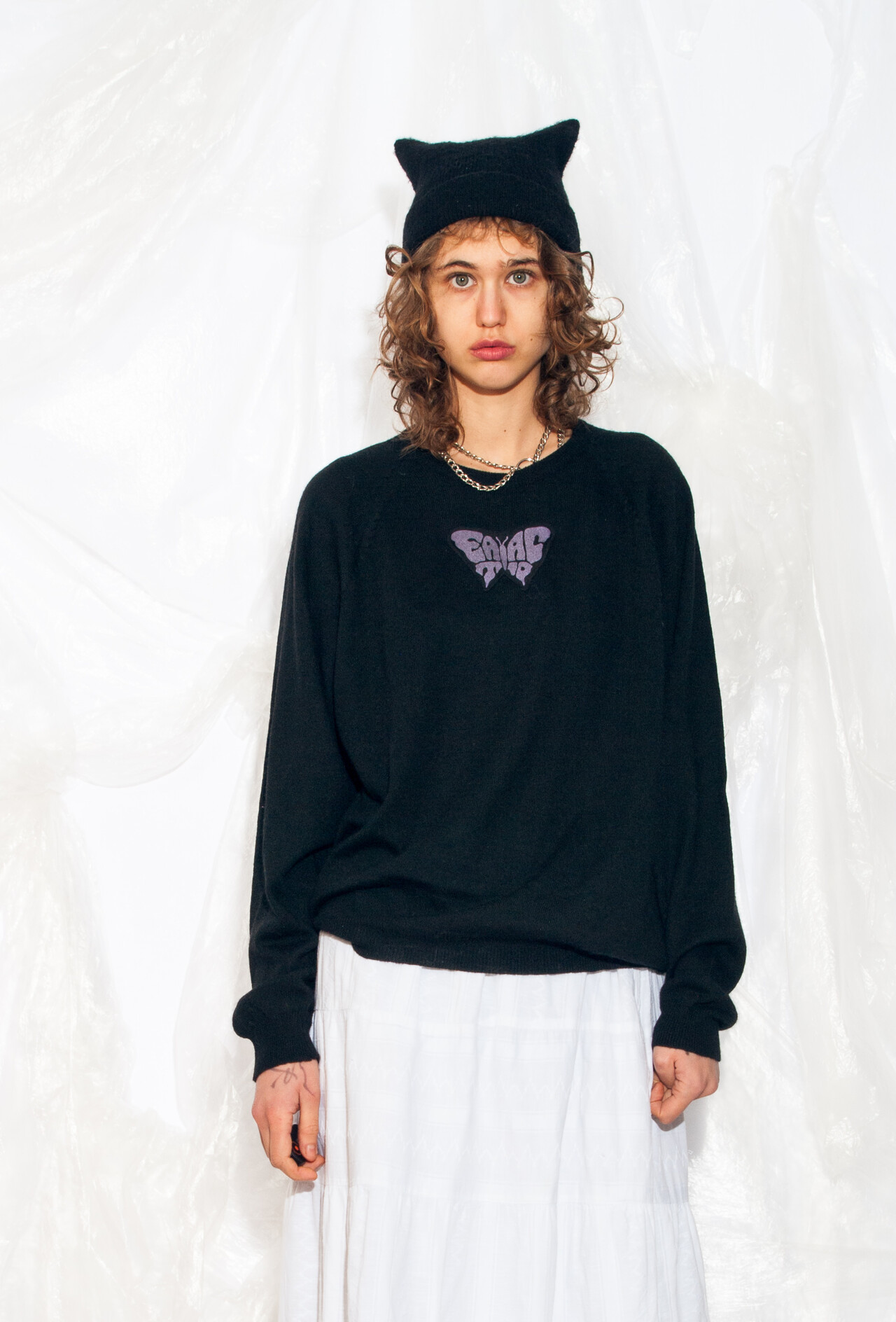 Get ready to travel back to the funky 70s era with this oversized, black, reworked vintage knit jumper. Complete with an eat-acid butterfly patch, it’s sure to add a psychedelic twist to any outfit.