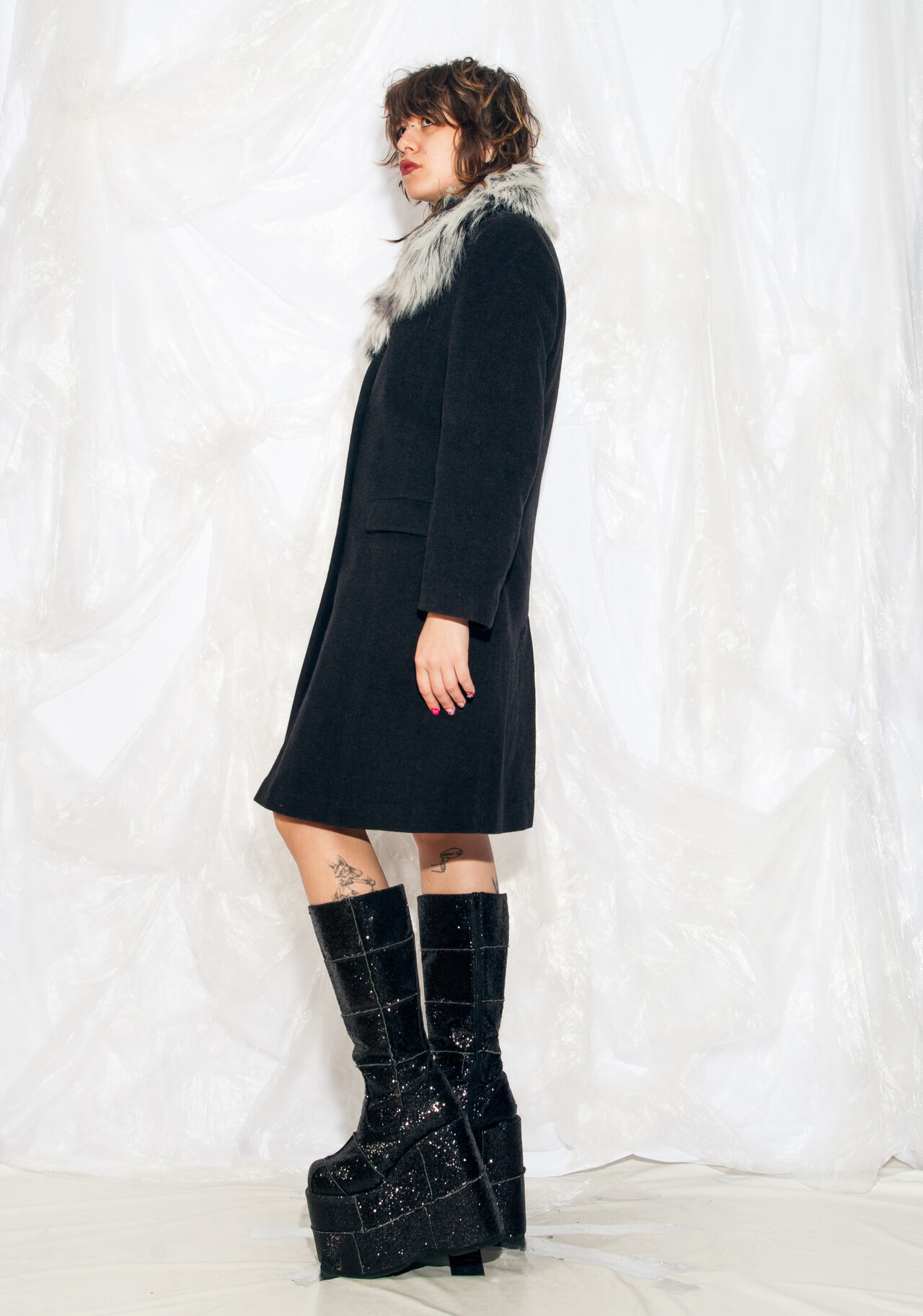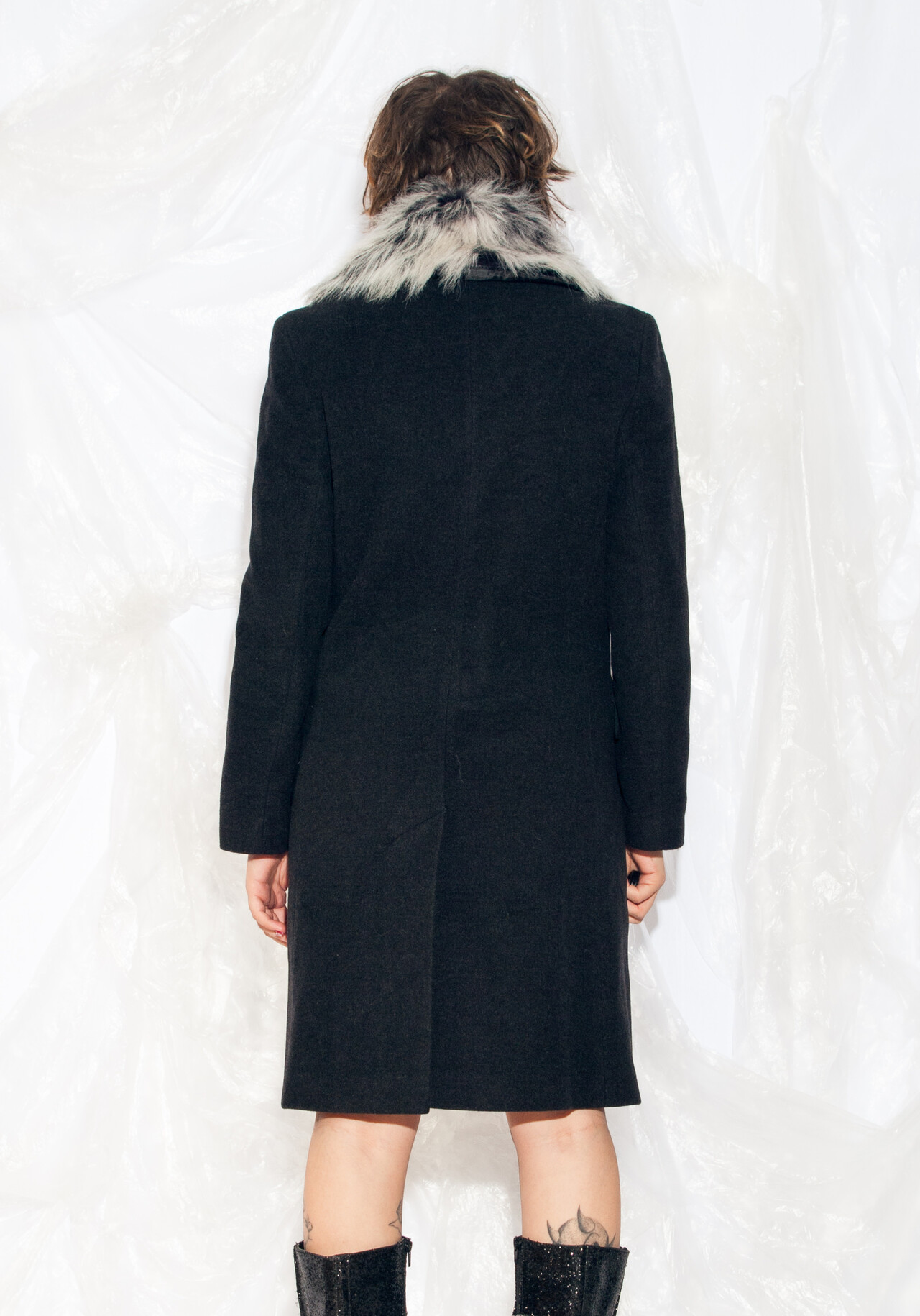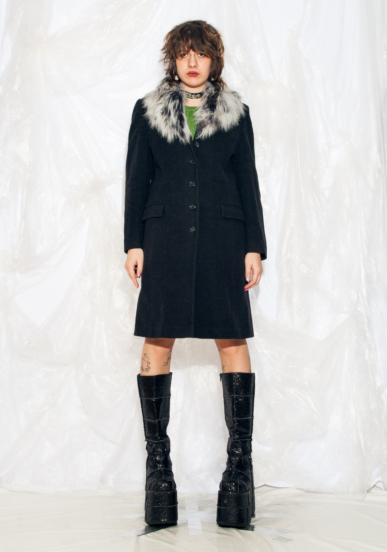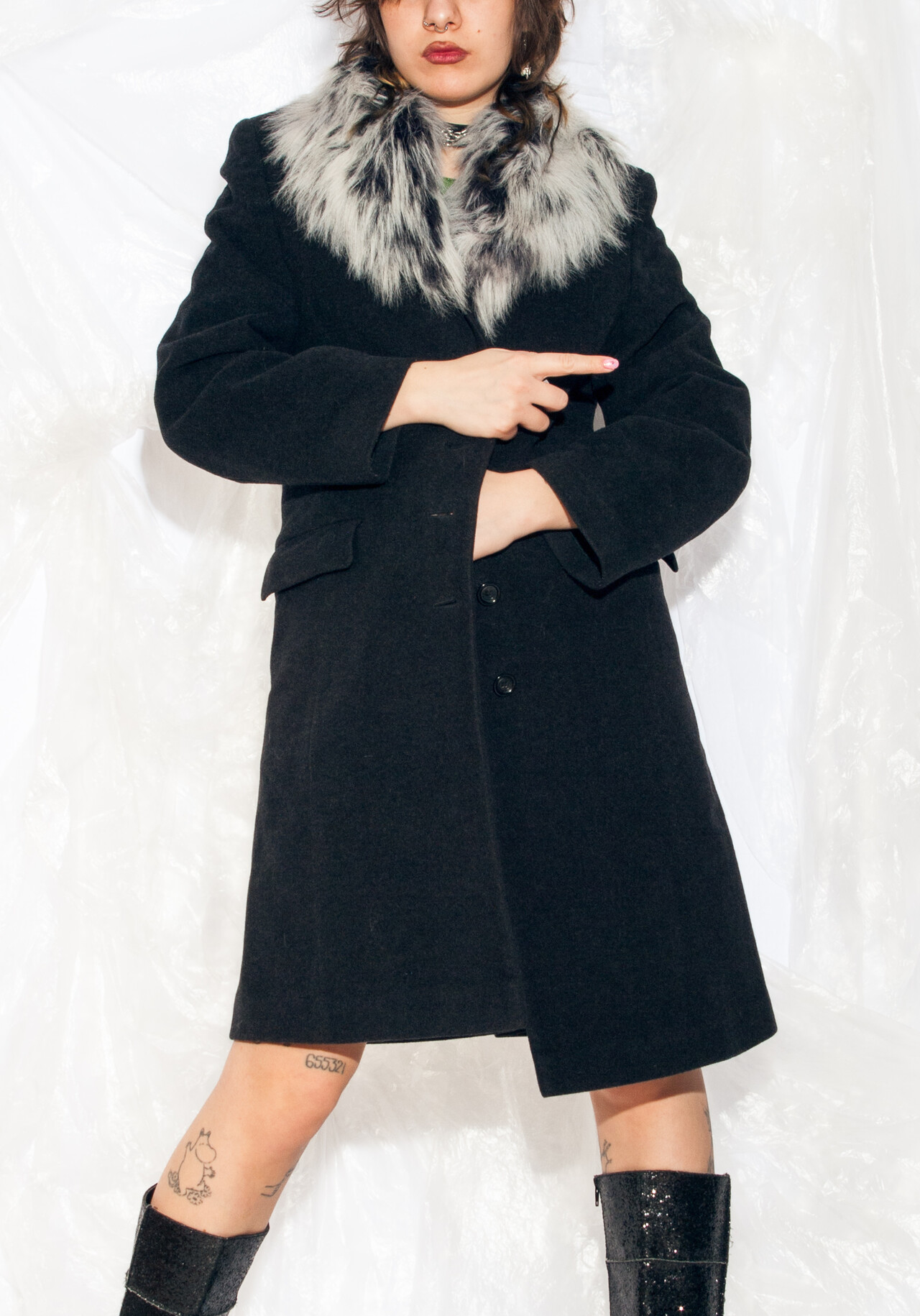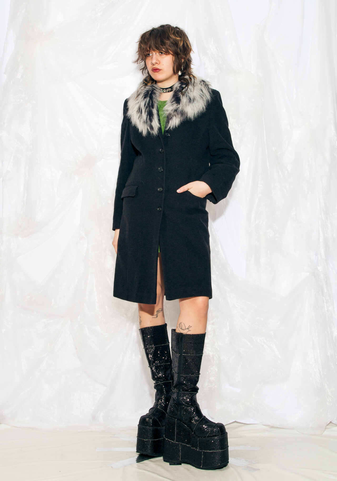 Vintage 90s Reworked Coat with Faux Fur Collar in Black Wool