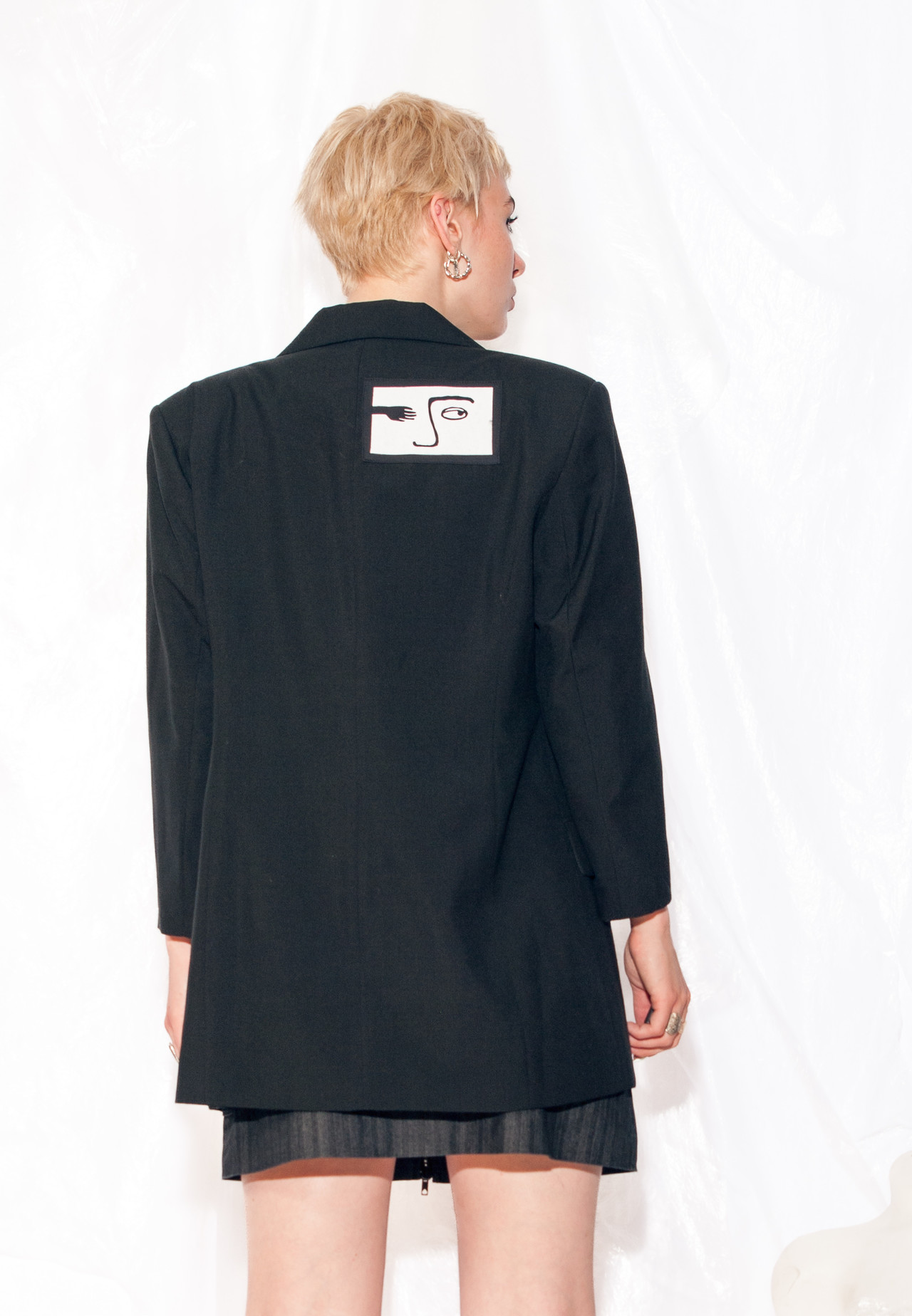 Reworked 80s vintage blazer with a screen-printed weird face patch and mix-n-matched buttons, this blazer is a total time-travelling treasure. Three pockets for all your random trinkets. Button up and let the vintage magic begin!