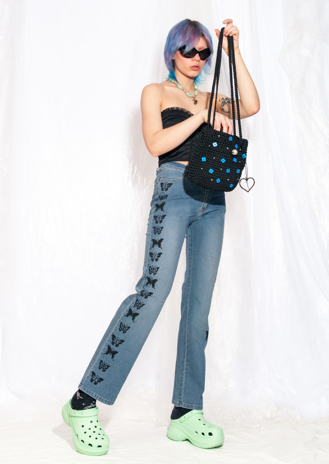 Y2K vintage jeans, the sustainable choice for those who embrace fashion and mother nature. These flared beauties come with a butterfly pattern painted on them by us. The four pockets are the perfect size to carry your phone, wallet, and some snacks for munchies on the go.