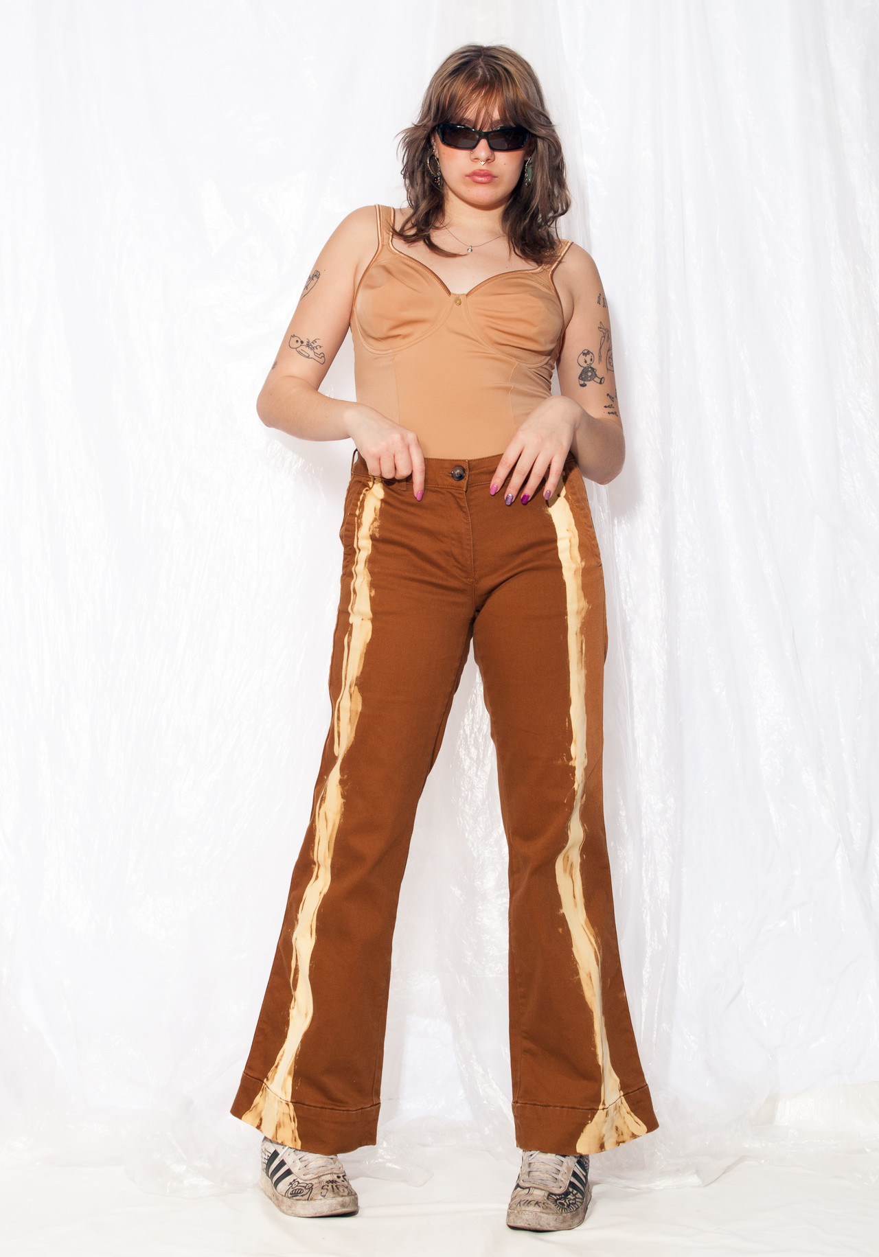 Reworked Y2K vintage flare jeans. Not only are they eco-friendly, but they also come in a beautiful brown colour with four handy pockets. And let’s face it, flares never go out of style – especially when they’re one-of-a-kind hand-painted and bleached! Recommended size: EU 40-42.