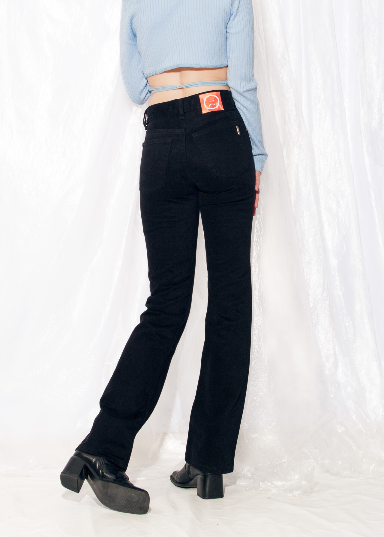 Reworked vintage black boyfriend jeans straight from the 90s, what could be better than this? We sewed a hand-printed sad face patch on its back. Featuring a straight-leg cut, five pockets and a button closure.