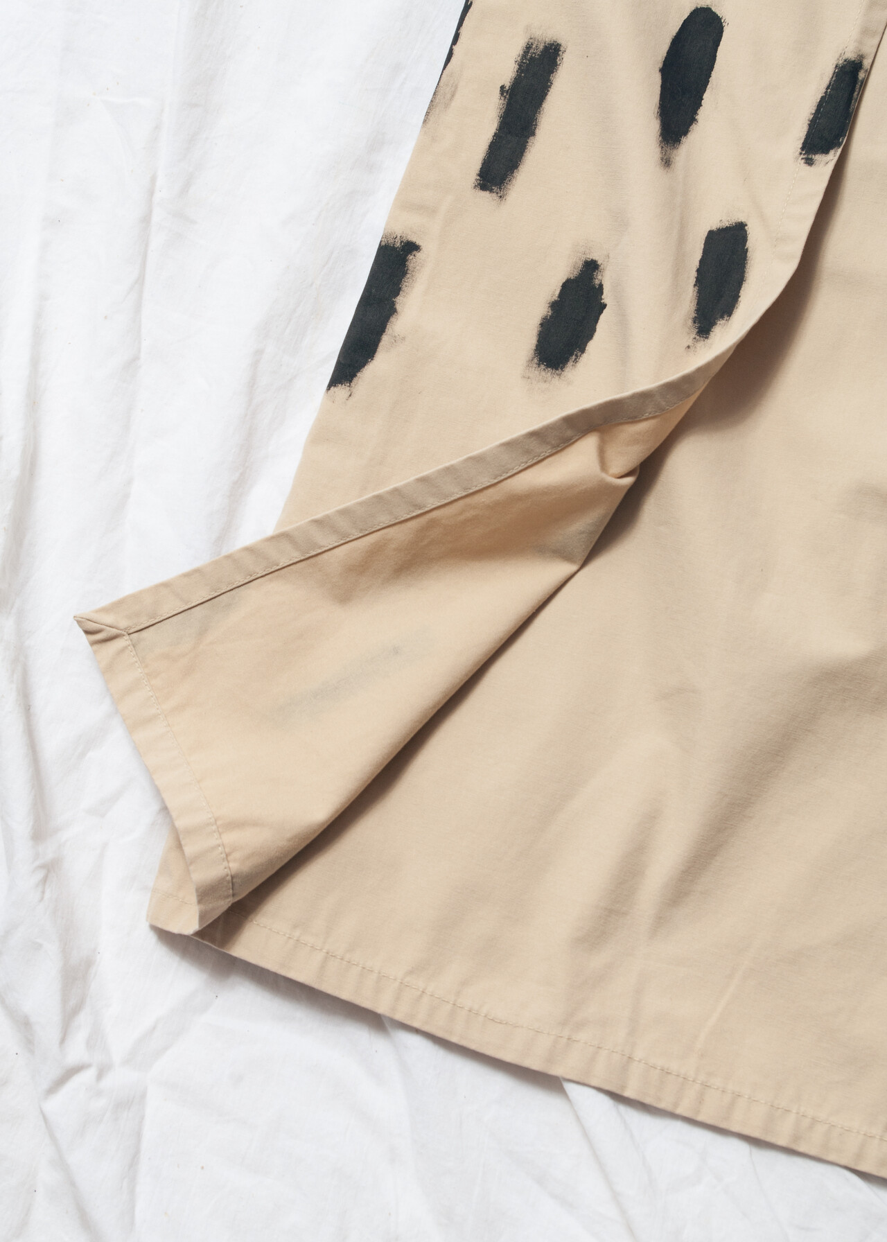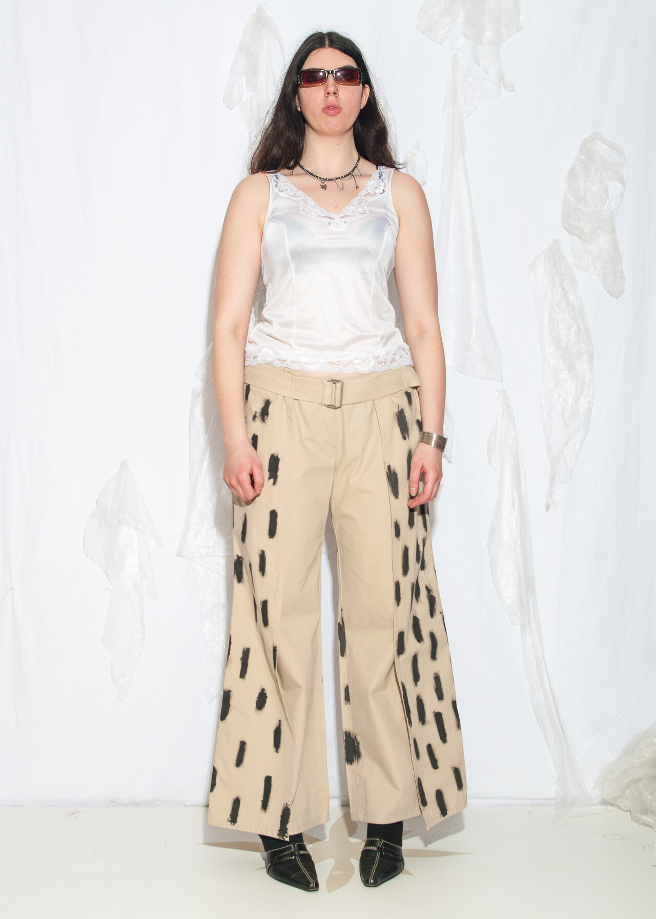 Insane reworked Y2K vintage flare trousers with a hand-painted pattern. We used industrial textile paint that we heat fixed, so it’s machine washable. The pants are made of beige cotton fabric and have the coolest overlapped design and zip closure. Save the planet, switch to vintage now!