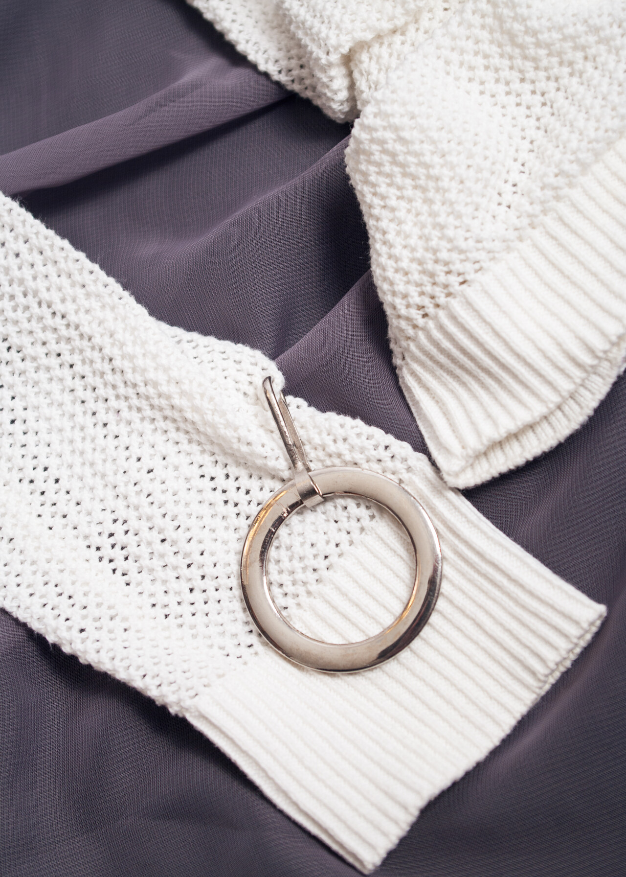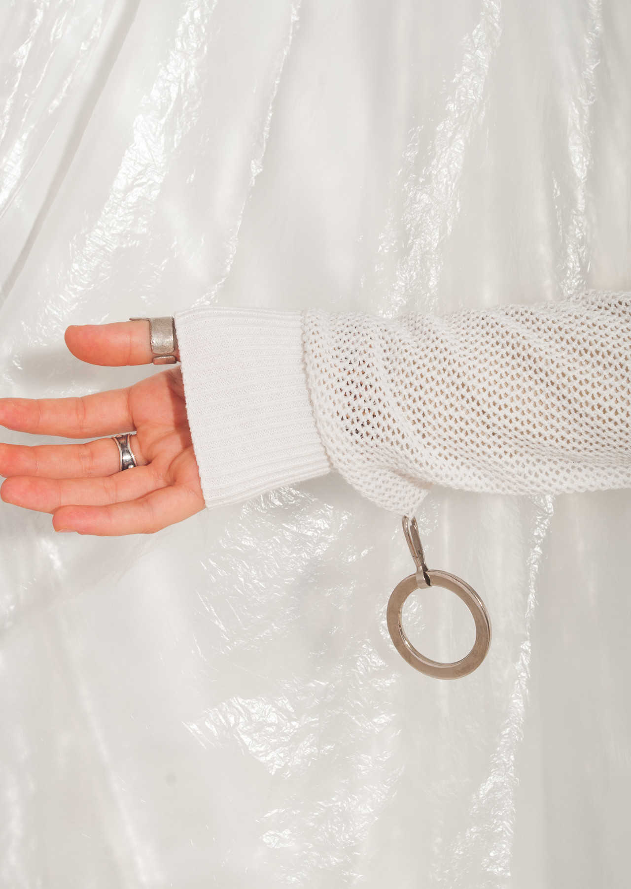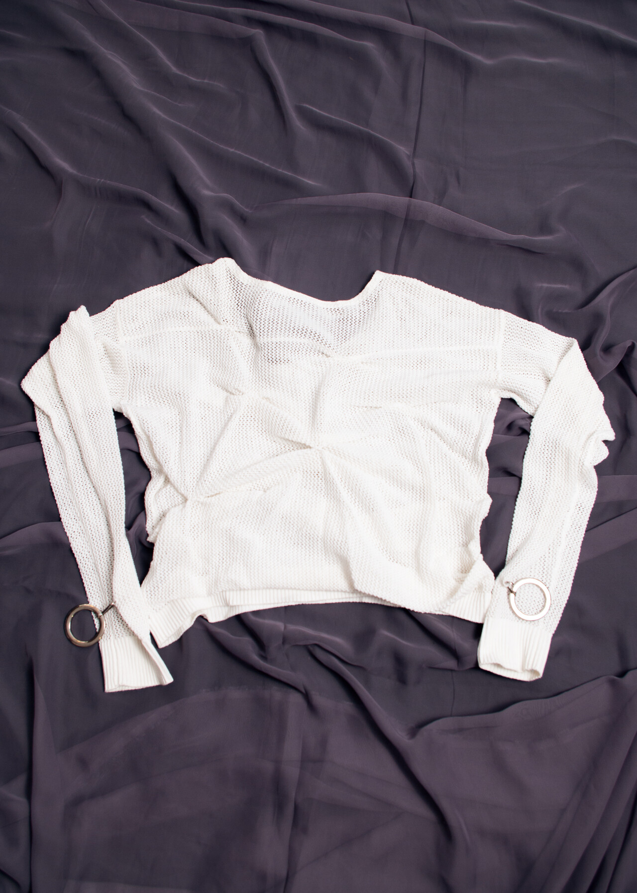 A reworked vintage knit jumper with deconstructed ruched details all over and removable O-rings on the sleeves. Made of white cotton fishnet fabric. For an EU size 36-38.