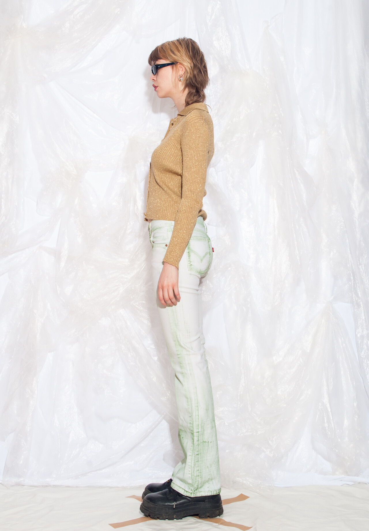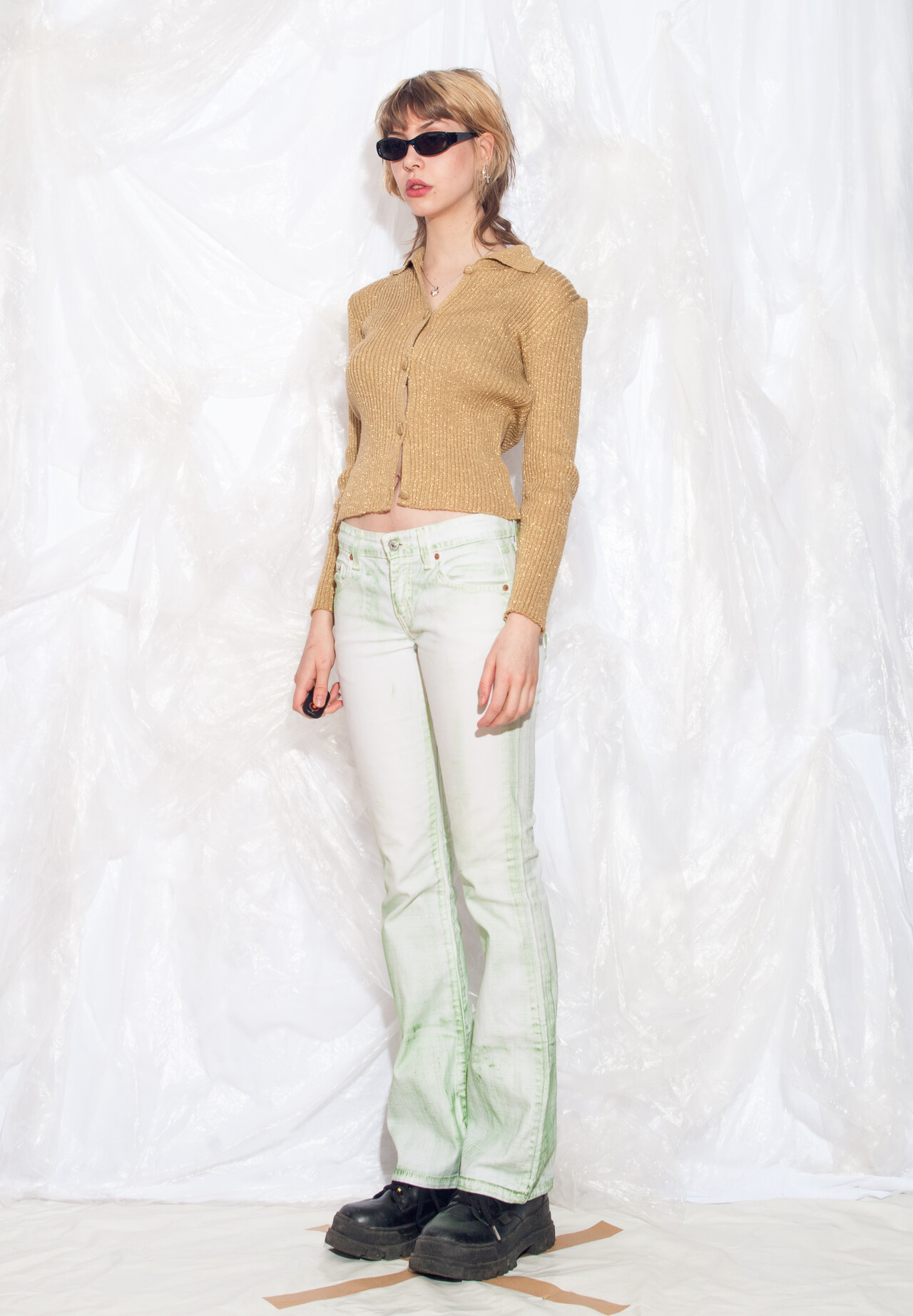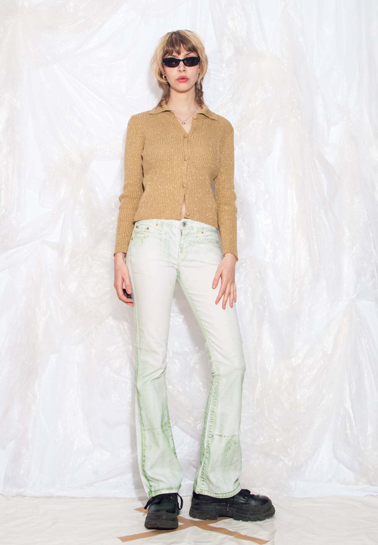 These Y2K vintage Levi’s jeans take a trip back in time and bring some neo-nineties vibes to your wardrobe. With cool hand-painted details, these flares in green and white are the perfect blend of vintage and fun.