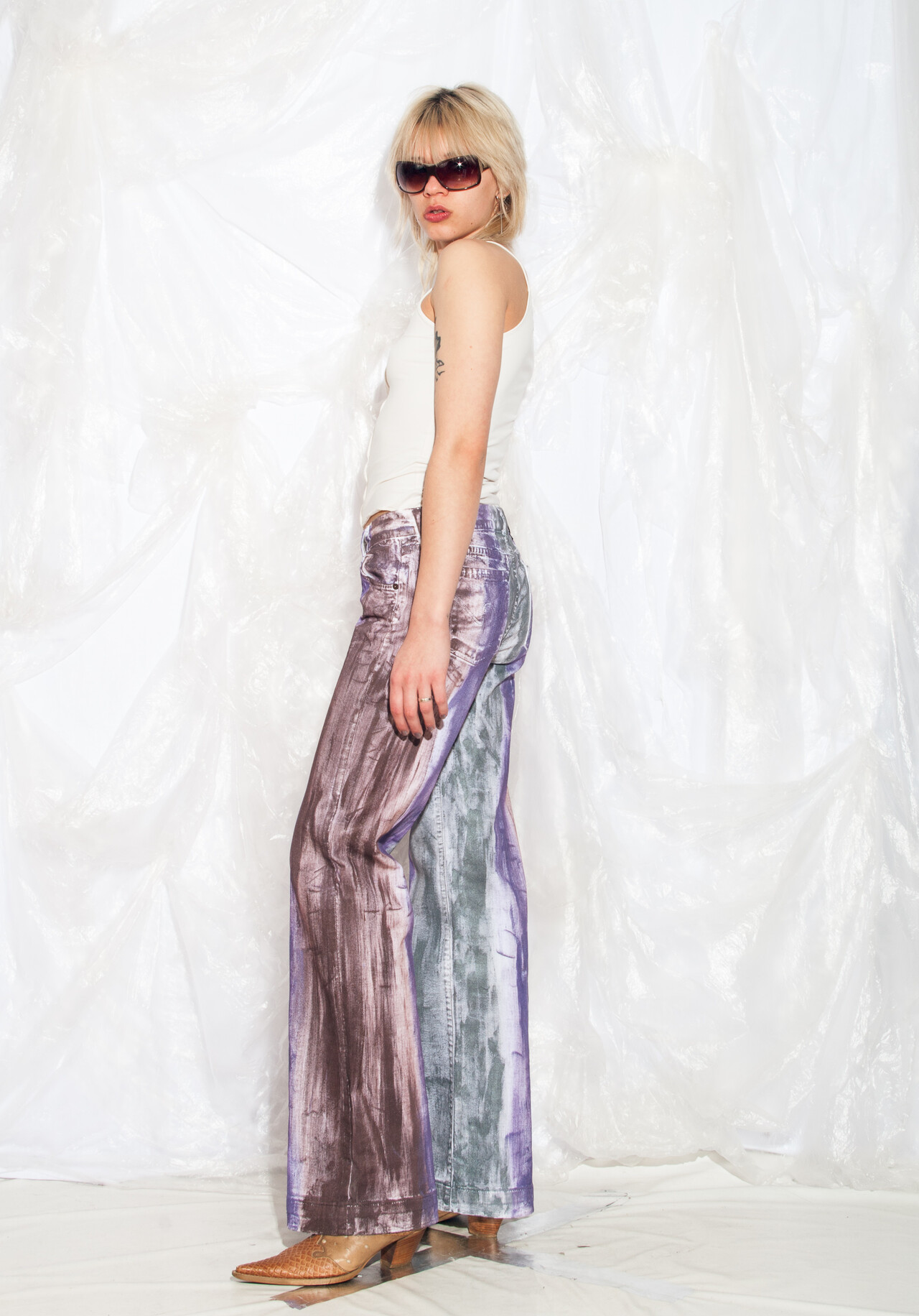 These reworked, hand-painted Y2K vintage Citizens of Humanity flared jeans are bold, fun, and perfect for a goofy night out on the town. Throw on a top that matches one of the crazy colours – bronze, purple, silver – and instantly make a 2000s fashion statement!