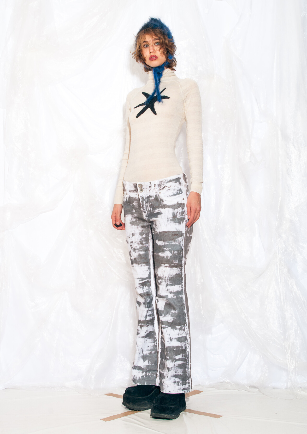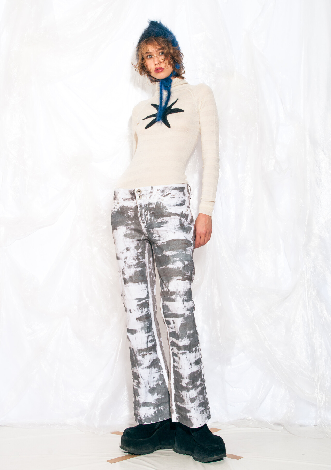 Be the first to review “Vintage Y2K Reworked Flare Trousers in Silver Hand Painted” Cancel reply