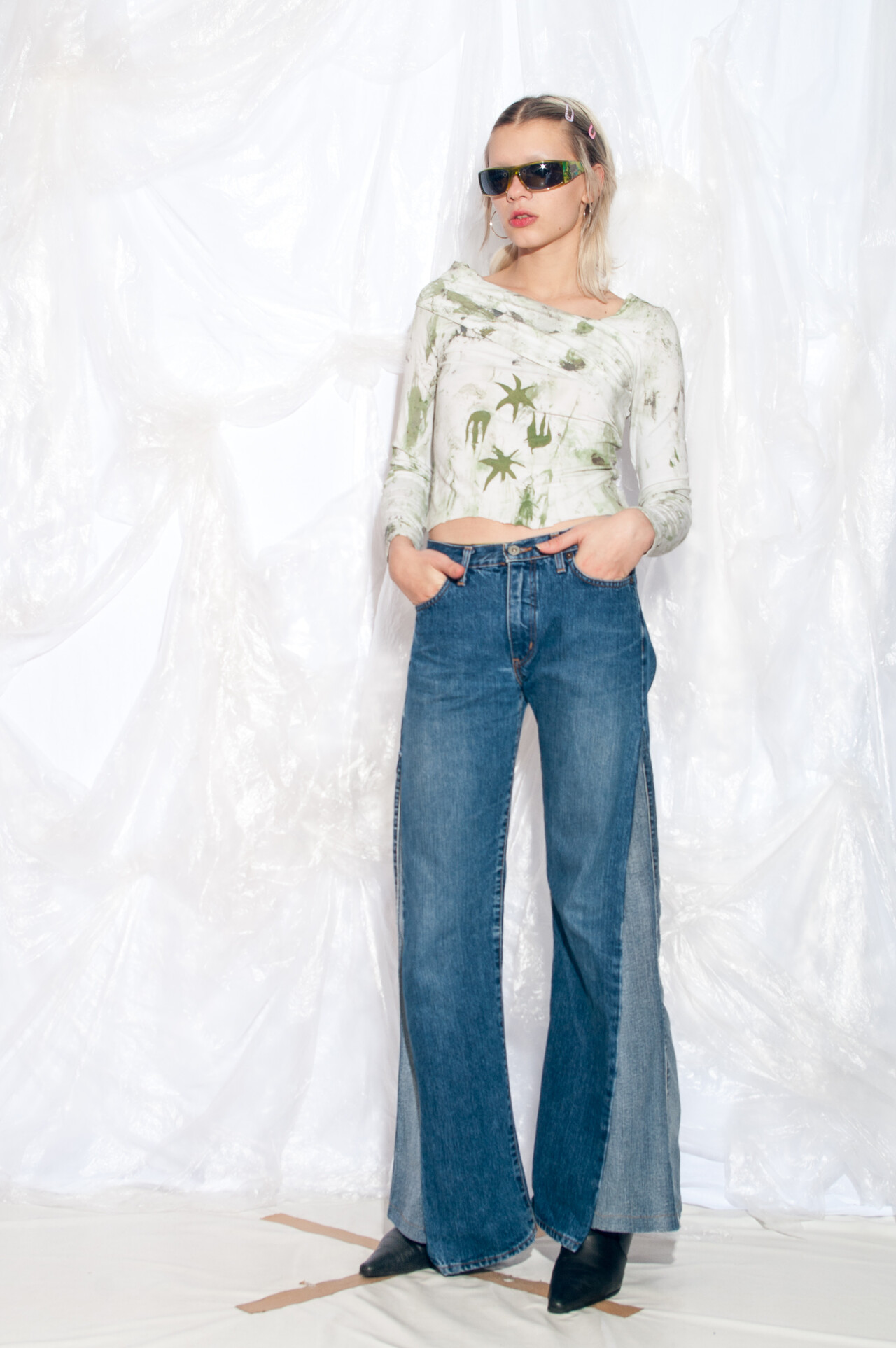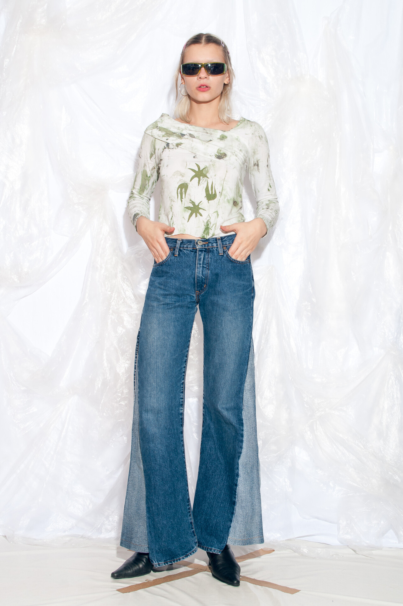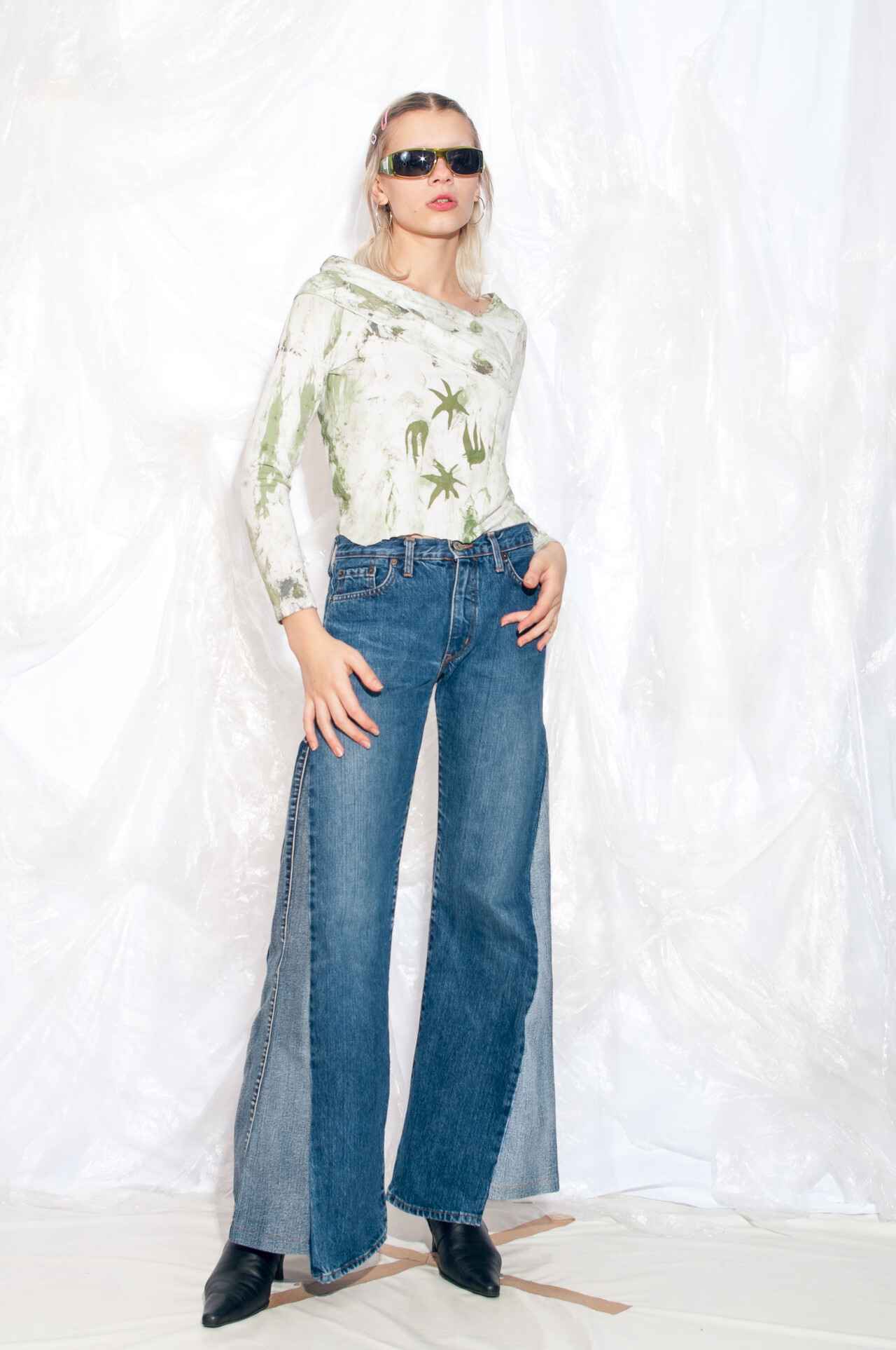 This hand-painted and printed Y2K vintage seaweed top is the perfect throwback wardrobe essential. Slip it on and embrace the iconic off-shoulder style of the early 2000s effortlessly.
