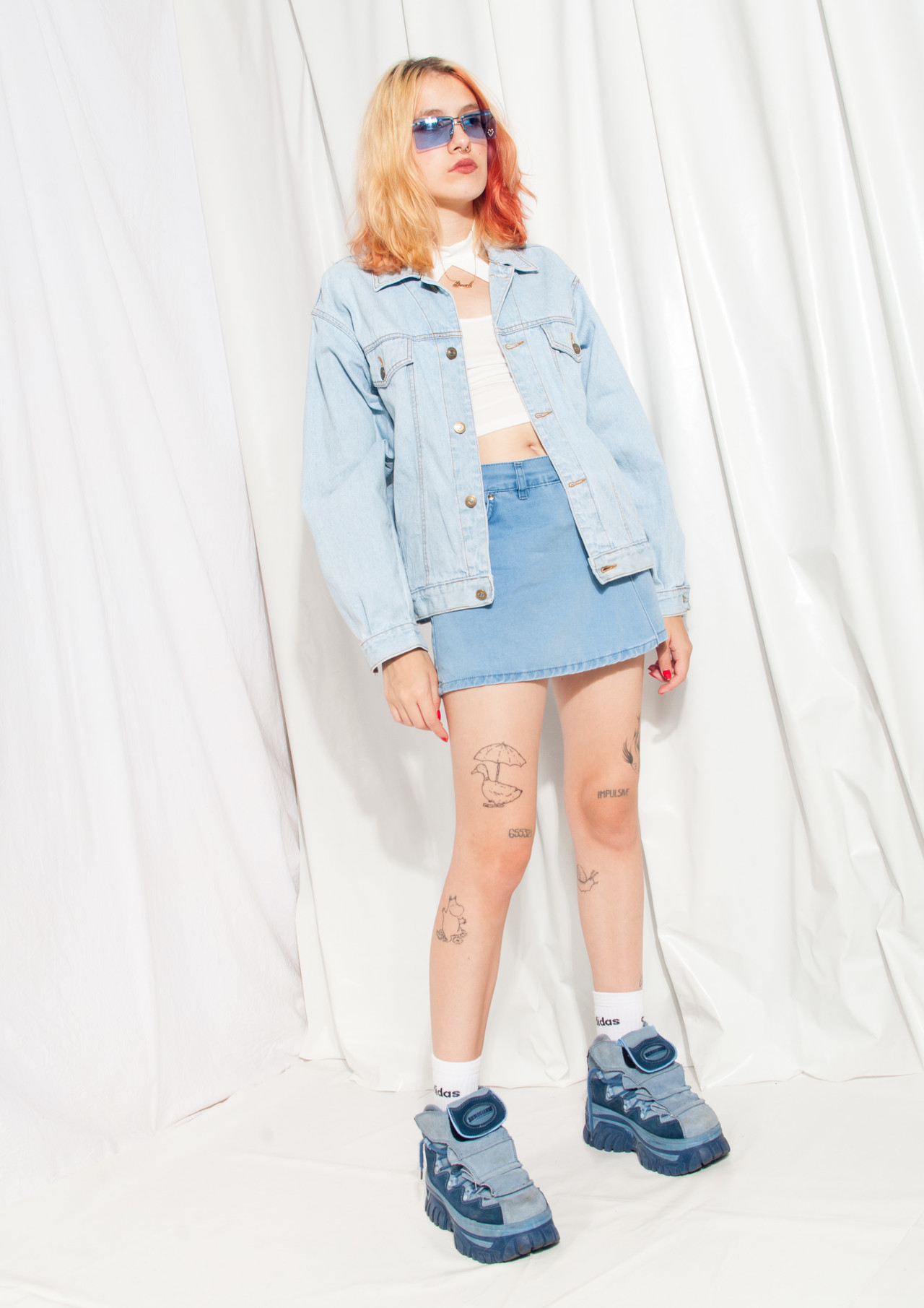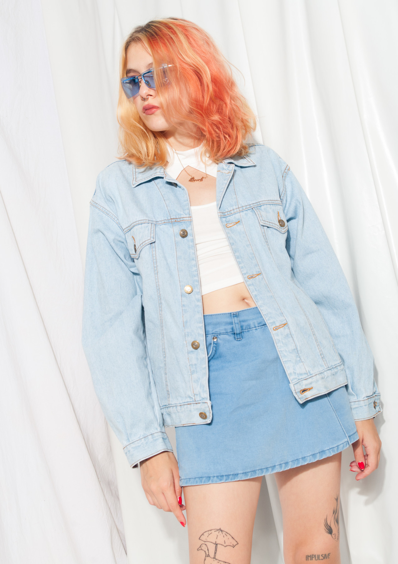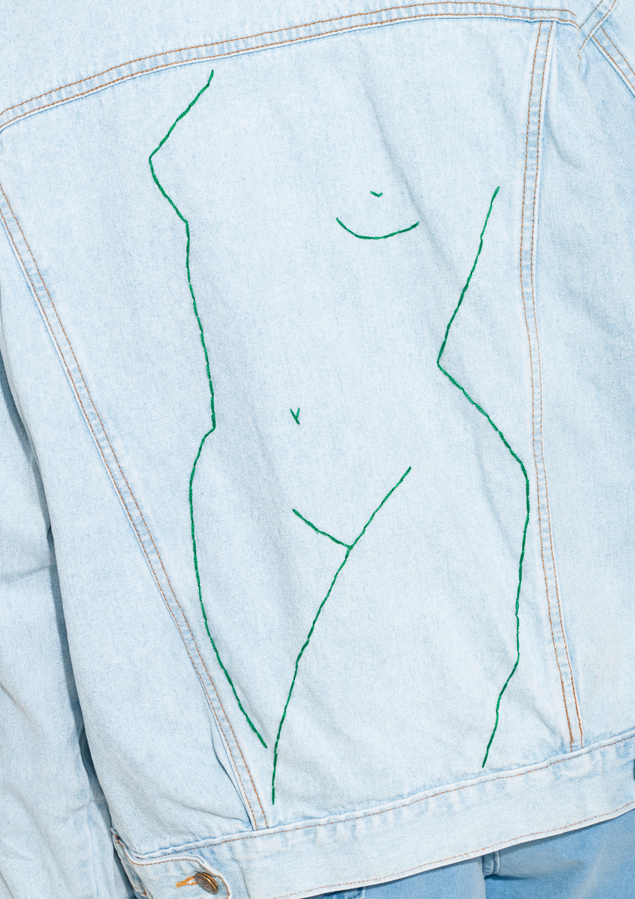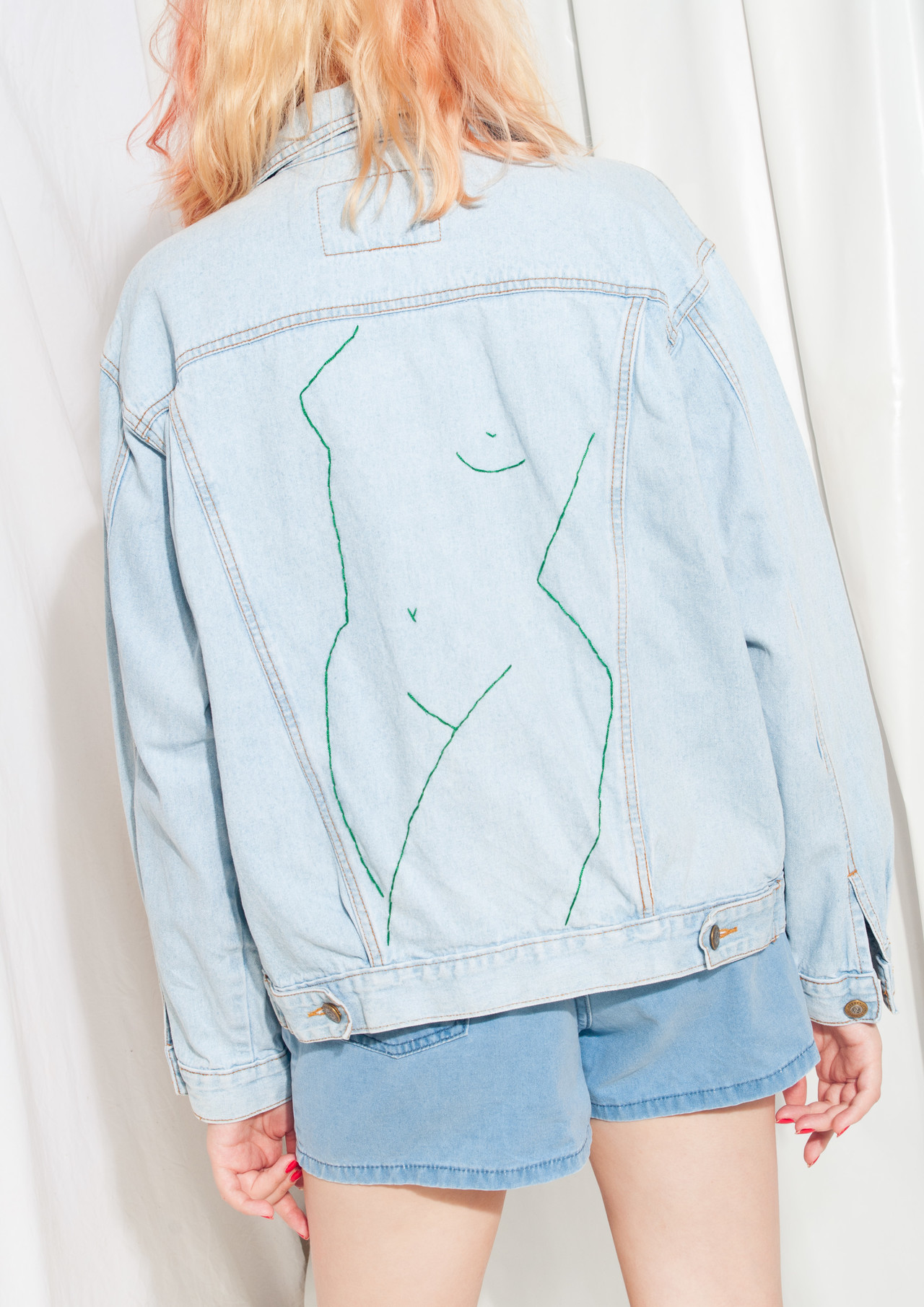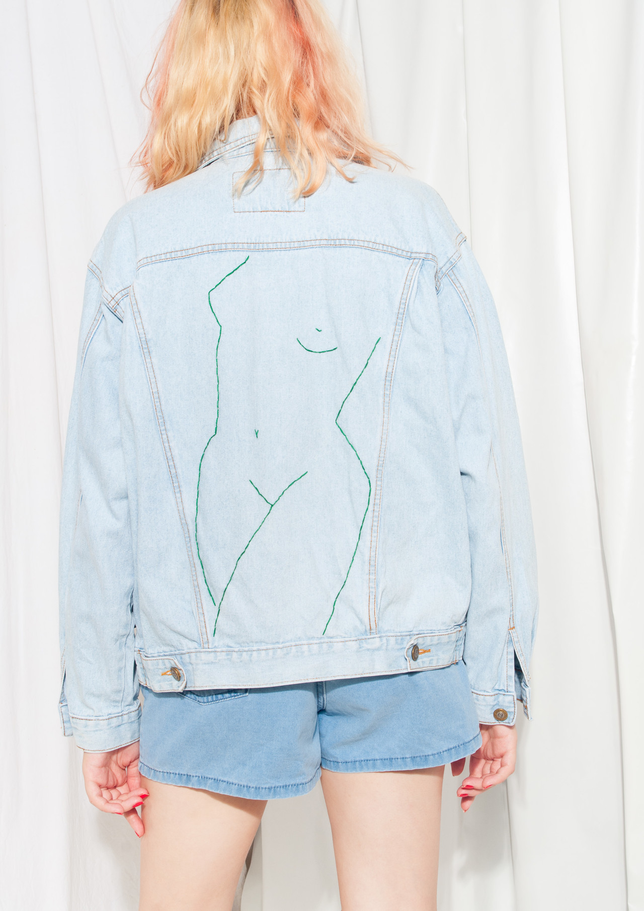 Pale denim jacket straight from shiny 90s with front button closure and two pockets. We hand-embroidered a feminist nude graphic on its back. It’s an oversized, unisex piece that fits more sizes. Please check the exact measurements!