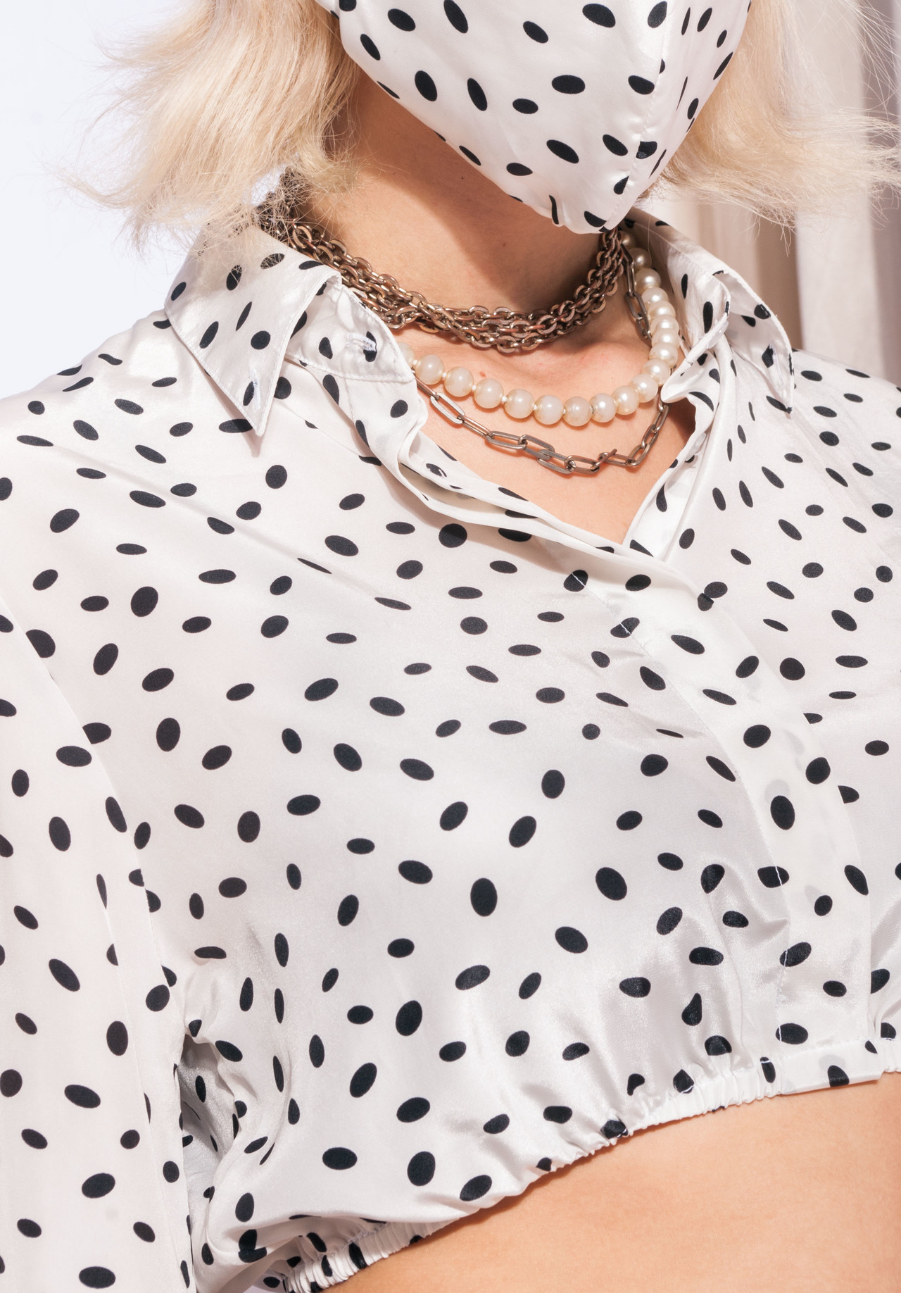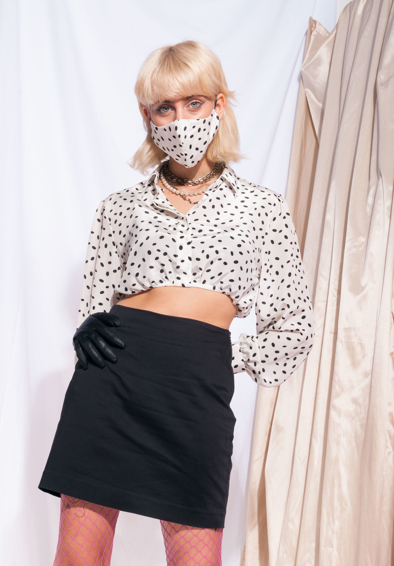 An undoubtedly amazing balloon sleeve blouse and face cover set straight from the 80s. We reworked the blouse, so it has a cropped, stretchy hem now, and we made a matching face cover from the leftovers (its inner layer is pure cotton). They feature slippery dalmatian fabric. Don’t hesitate, grab this sustainable vintage gem before someone else does.